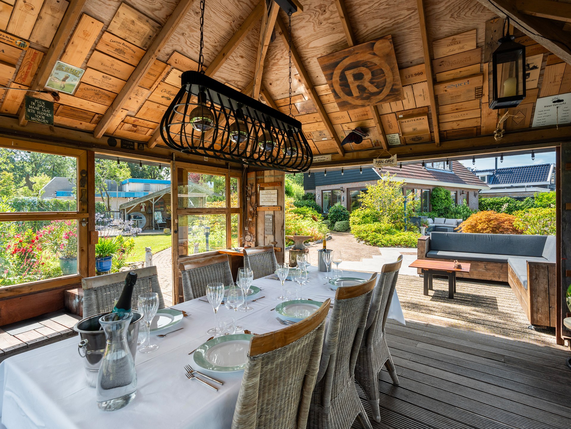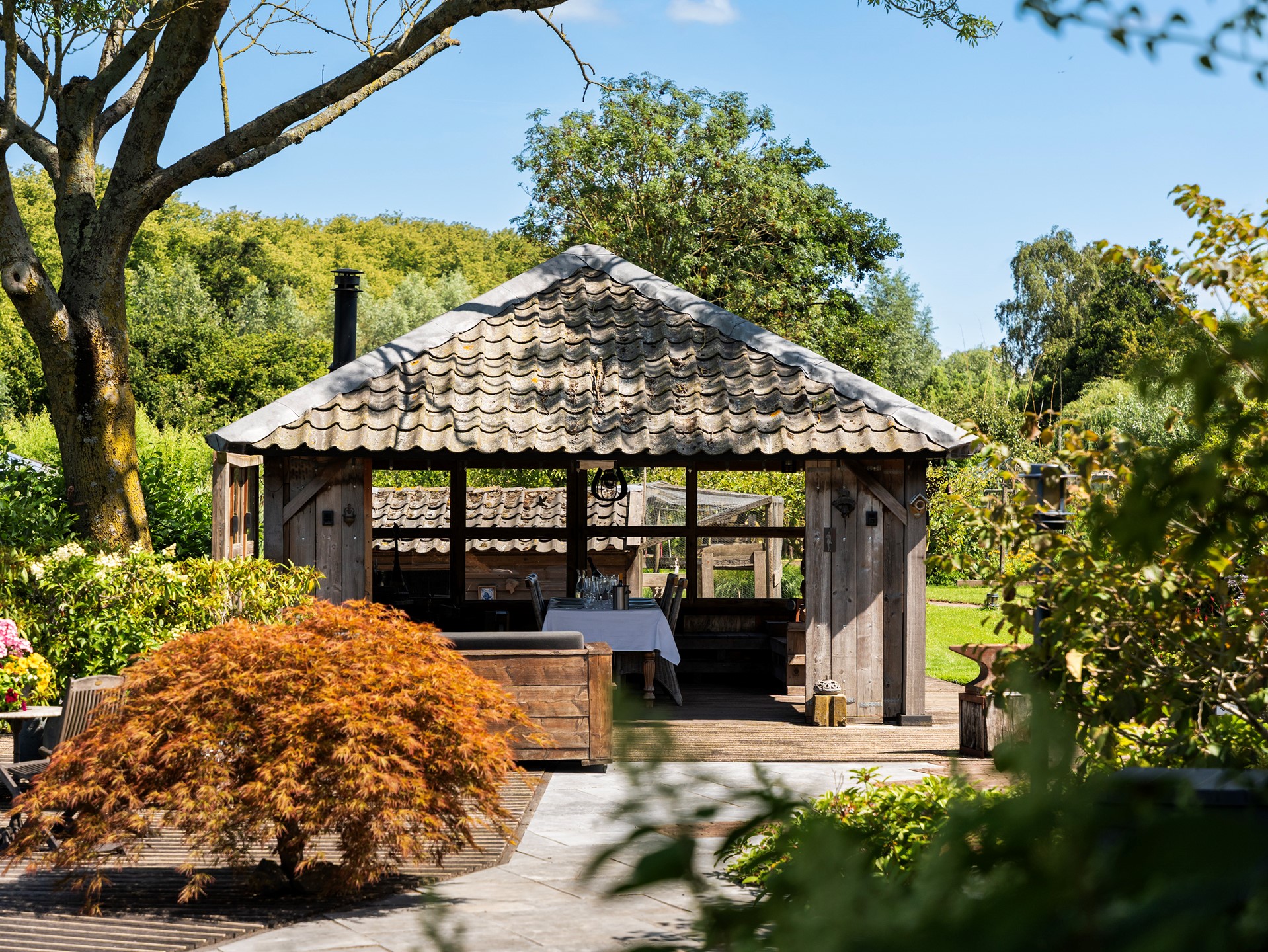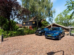 De achtertuin biedt veel privacy en is groen aangelegd met diverse planten, bloemen en bomen. Er is een overkapping aanwezig voor beschutte zitplekken. Daarnaast zijn er praktische voorzieningen zoals een vrijstaande garage, vrijstaande schuur, maar ook een kippenhok en plantenkas. De oprit biedt parkeergelegenheid voor meerdere auto’s.