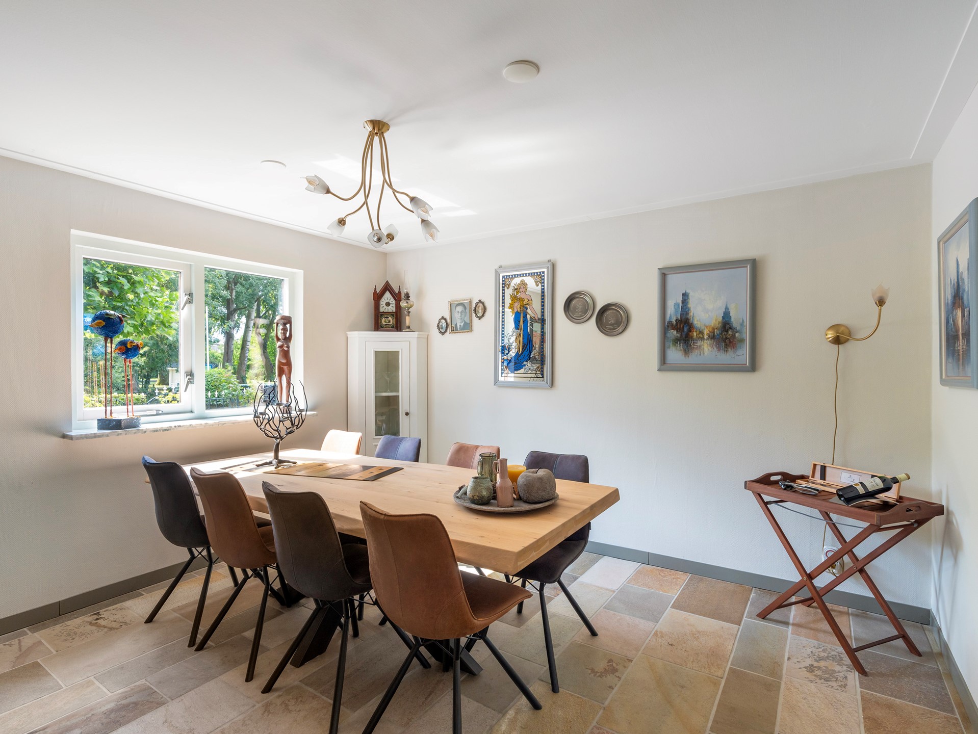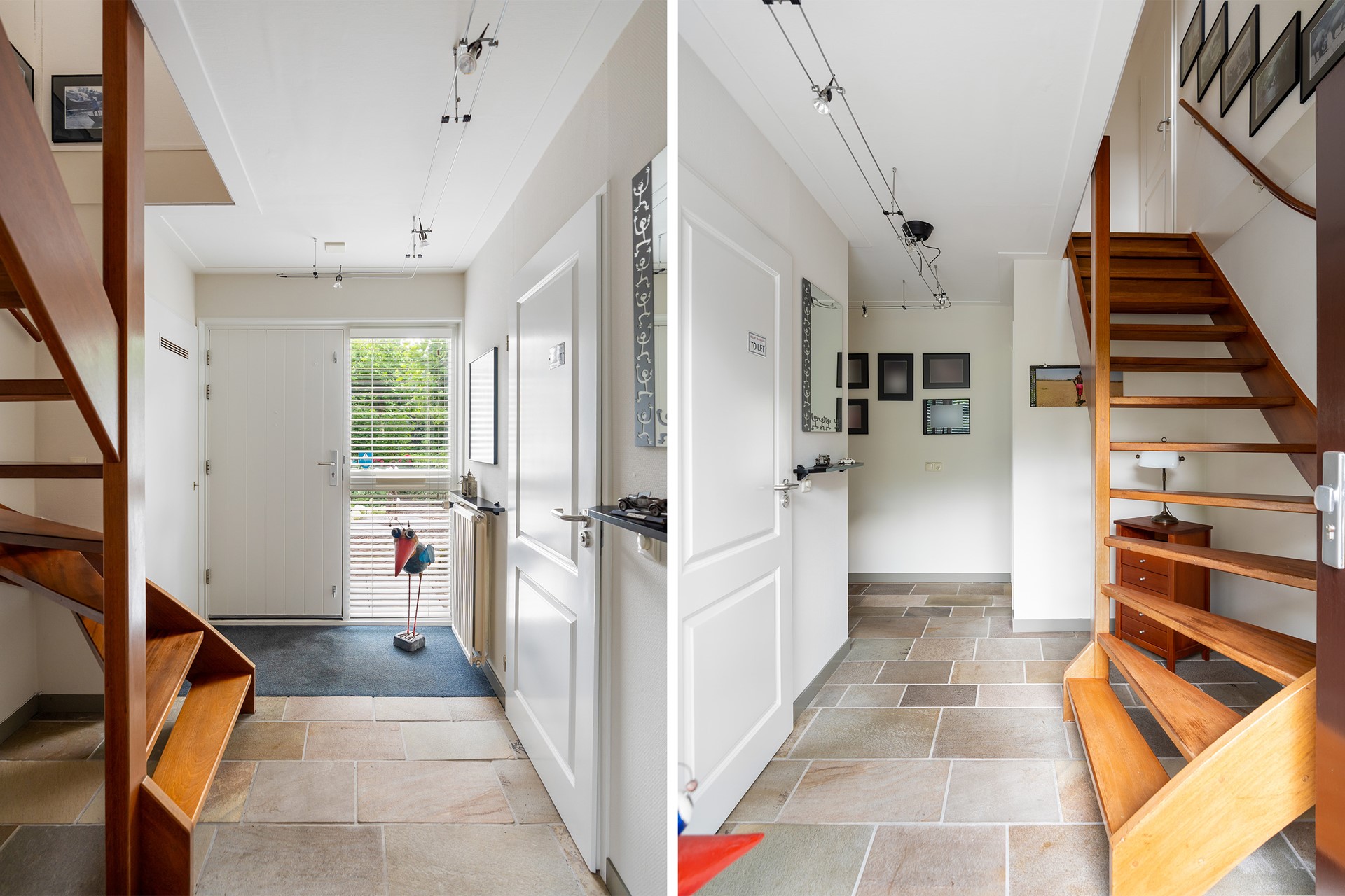 De woning beschikt over een ruime entreehal met toegang tot het toilet, een garderobe, meterkast en trapopgang. Vanuit de hal komt u in de royale woonkamer met een aparte zithoek. Grote raampartijen zorgen voor veel daglicht en een houtkachel geeft de ruimte extra sfeer. De stenen vloer is robuust en praktisch. Via de schuifpui bereikt u de diepe achtertuin, die op het zuidwesten is gericht.