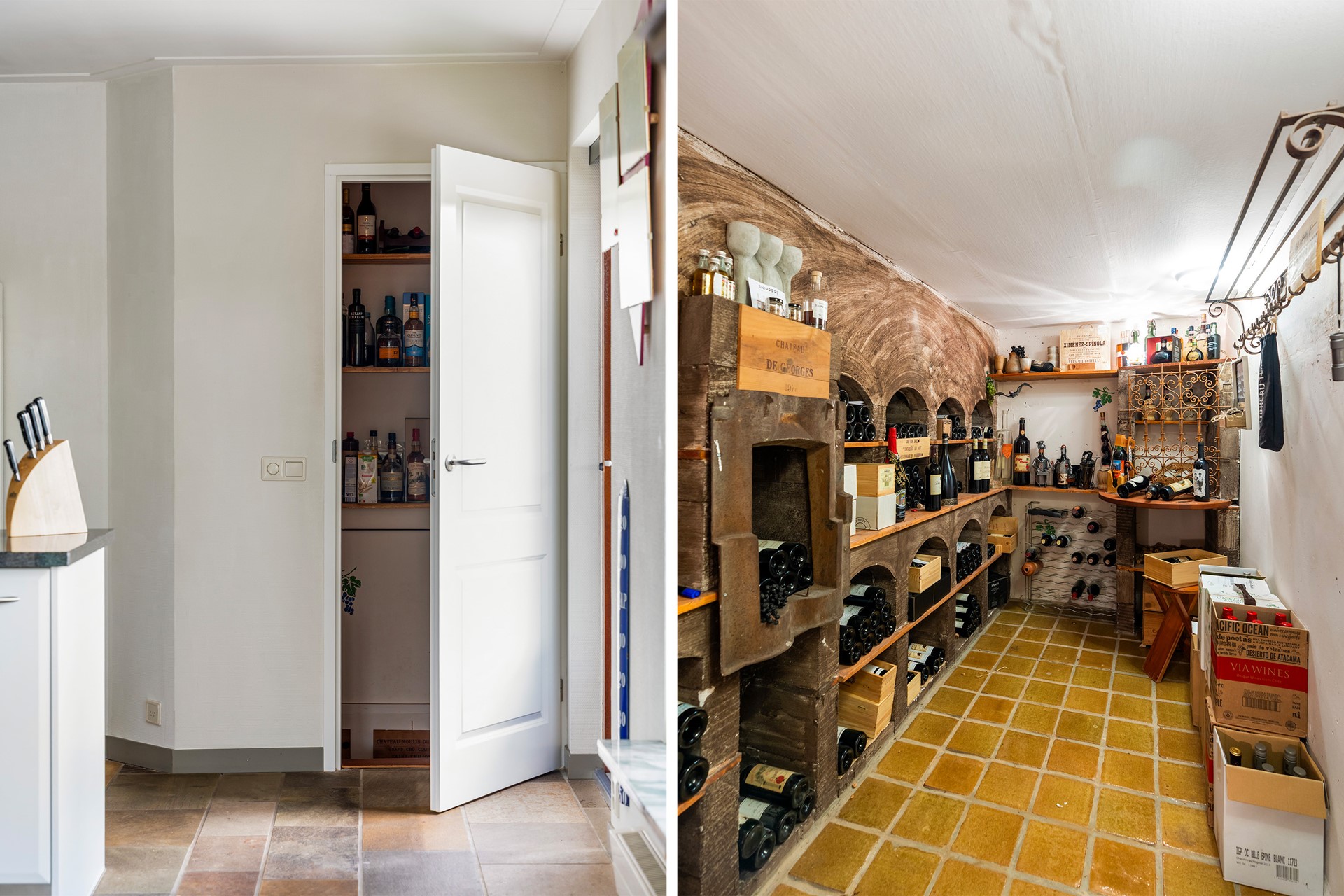 Aan de achterzijde ligt de open keuken met inbouwapparatuur, een centraal kookeiland met gasfornuis en veel bergruimte. Via de voorraadkast is de wijnkelder bereikbaar. Ook vanuit de keuken is er toegang tot de tuin. Grenzend aan de keuken ligt de bijkeuken met aansluitingen voor de wasmachine en droger en de eetkamer.