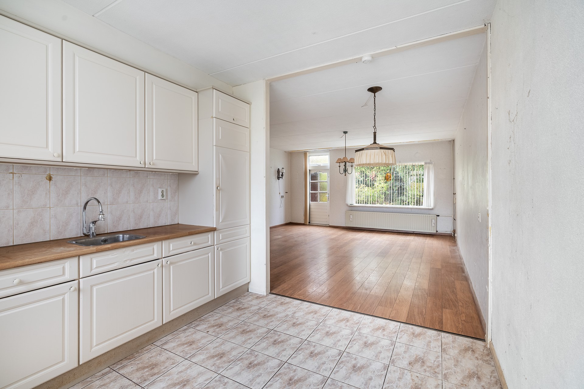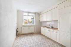 De woonkamer is licht en praktisch ingedeeld, voorzien van een trapkast en een laminaatvloer. Aan de voorzijde van de woning bevindt zich de keuken, met een nette wandopstelling voorzien van inbouwkoelkast en vriezer. De keuken heeft een tegelvloer, betegelde achterwand, crèmekleurige kastjes en een kunststof werkblad.