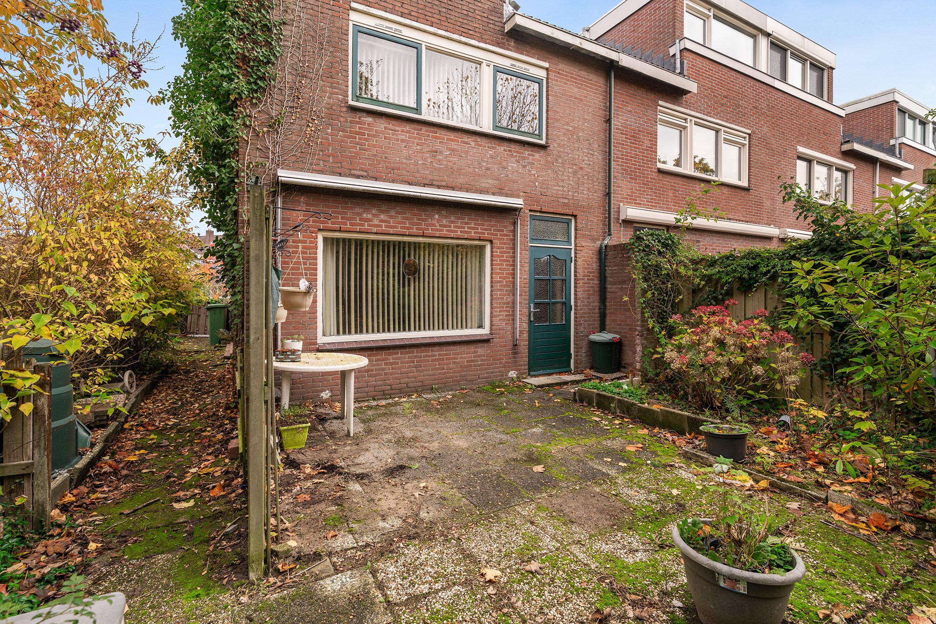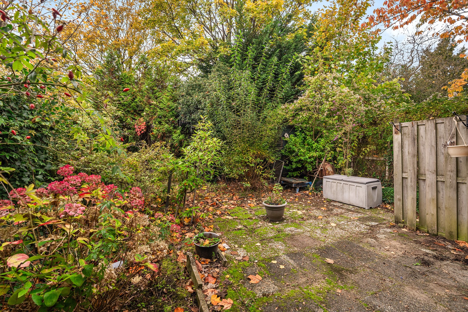 Via een deur is er toegang tot de achtertuin, die heerlijk zonnig op het zuidwesten is gelegen. De tuin heeft een terras en veel natuurlijke begroeiing, een berging en een zij-tuin met doorloop naar de achterzijde. Een plek met potentie — met wat aandacht maak je hier een heerlijke buitenruimte van!