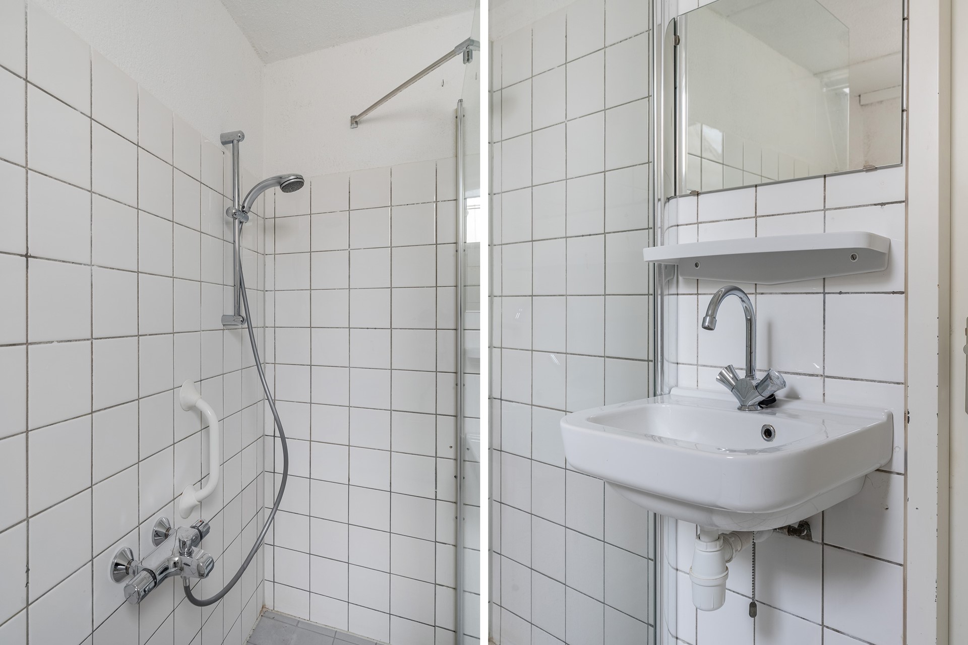 De badkamer is driekwart betegeld en voorzien van een douche met thermostaatkraan, wastafel met planchet en spiegel, een tweede toilet, designradiator, aansluiting voor wasapparatuur en een raam voor natuurlijke ventilatie.