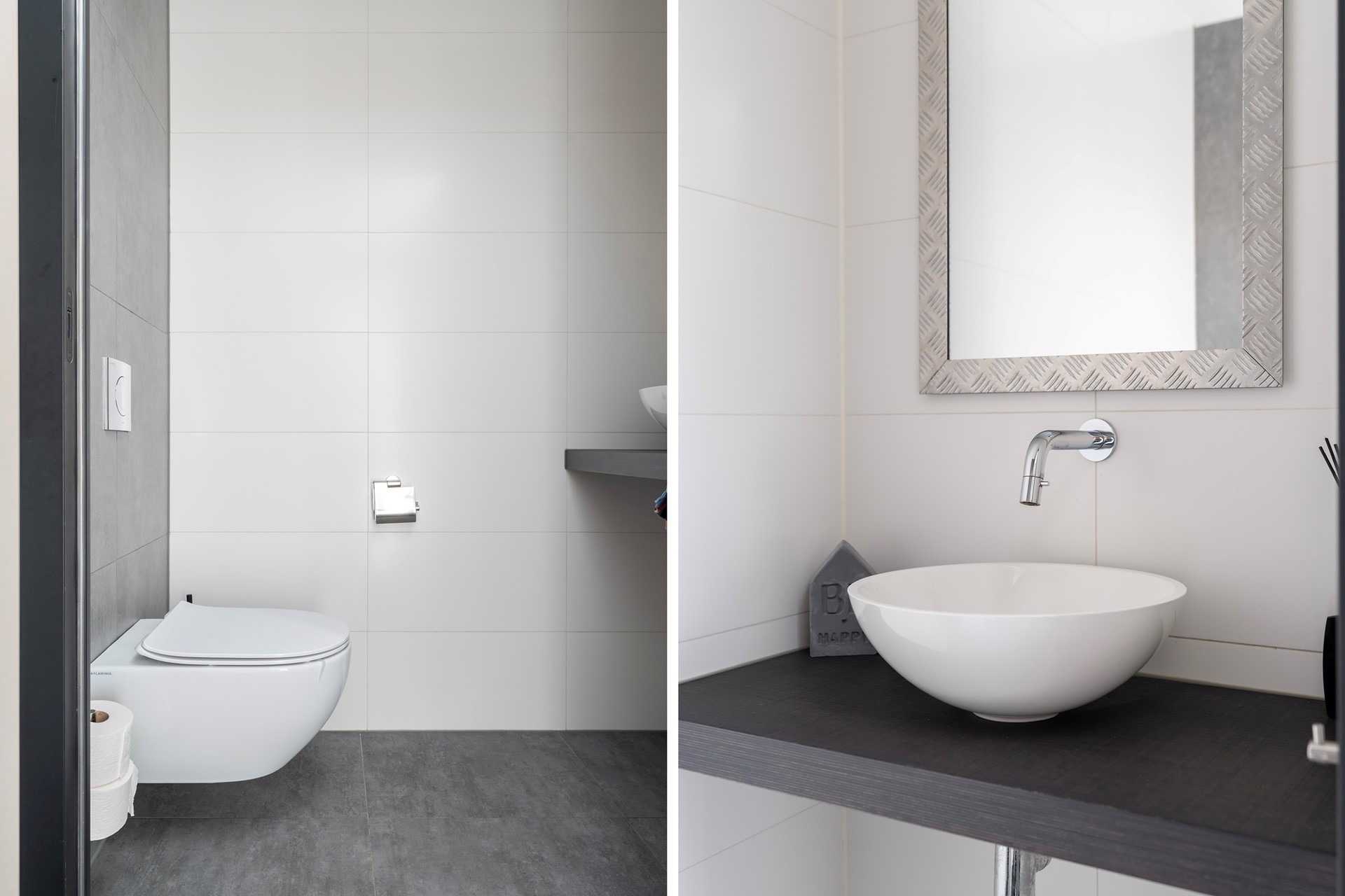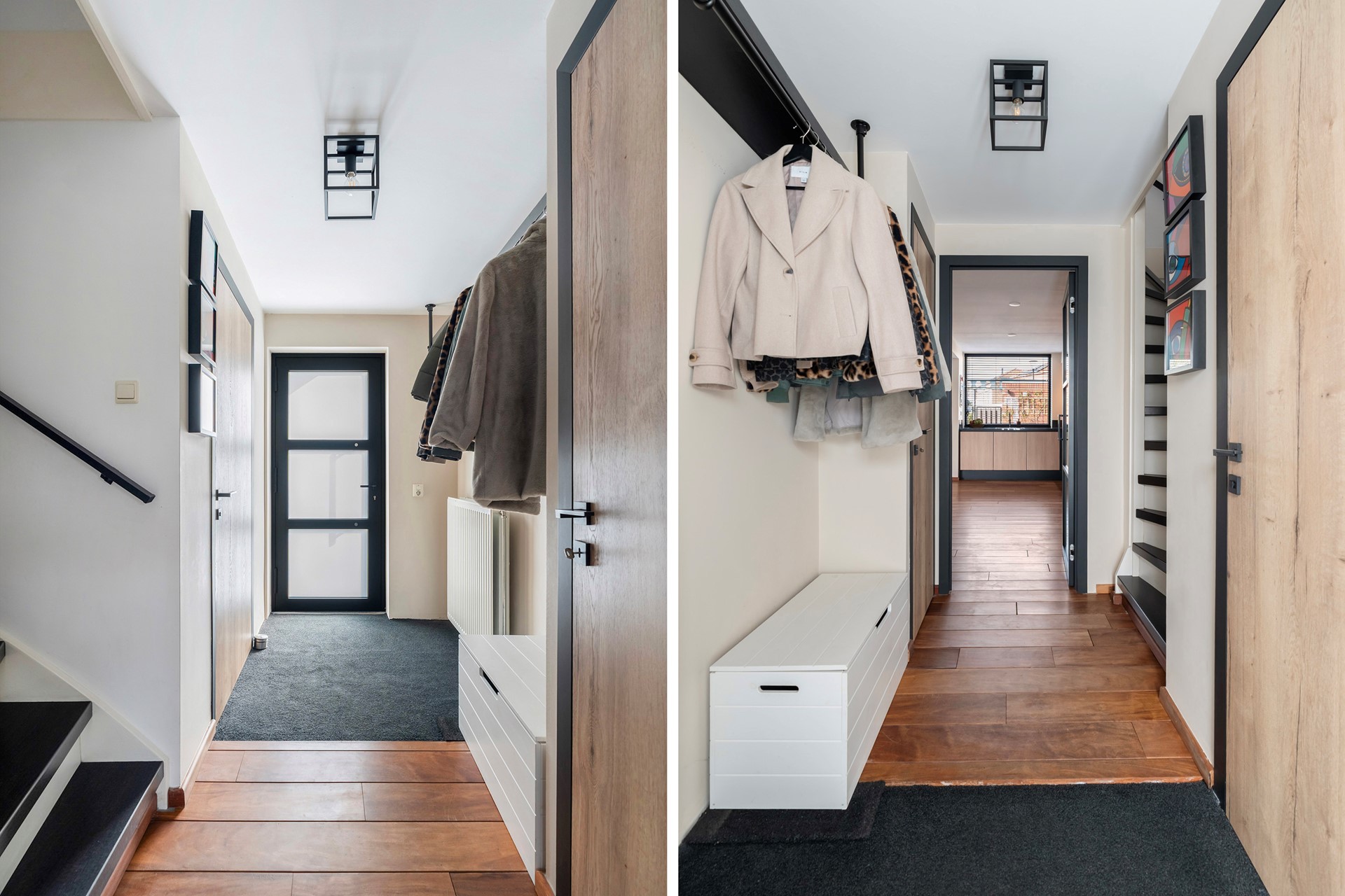 Via de entree komt u binnen in de ruime hal met garderobe, meterkast, trapopgang en een volledig betegelde toiletruimte met hangtoilet en fonteintje.