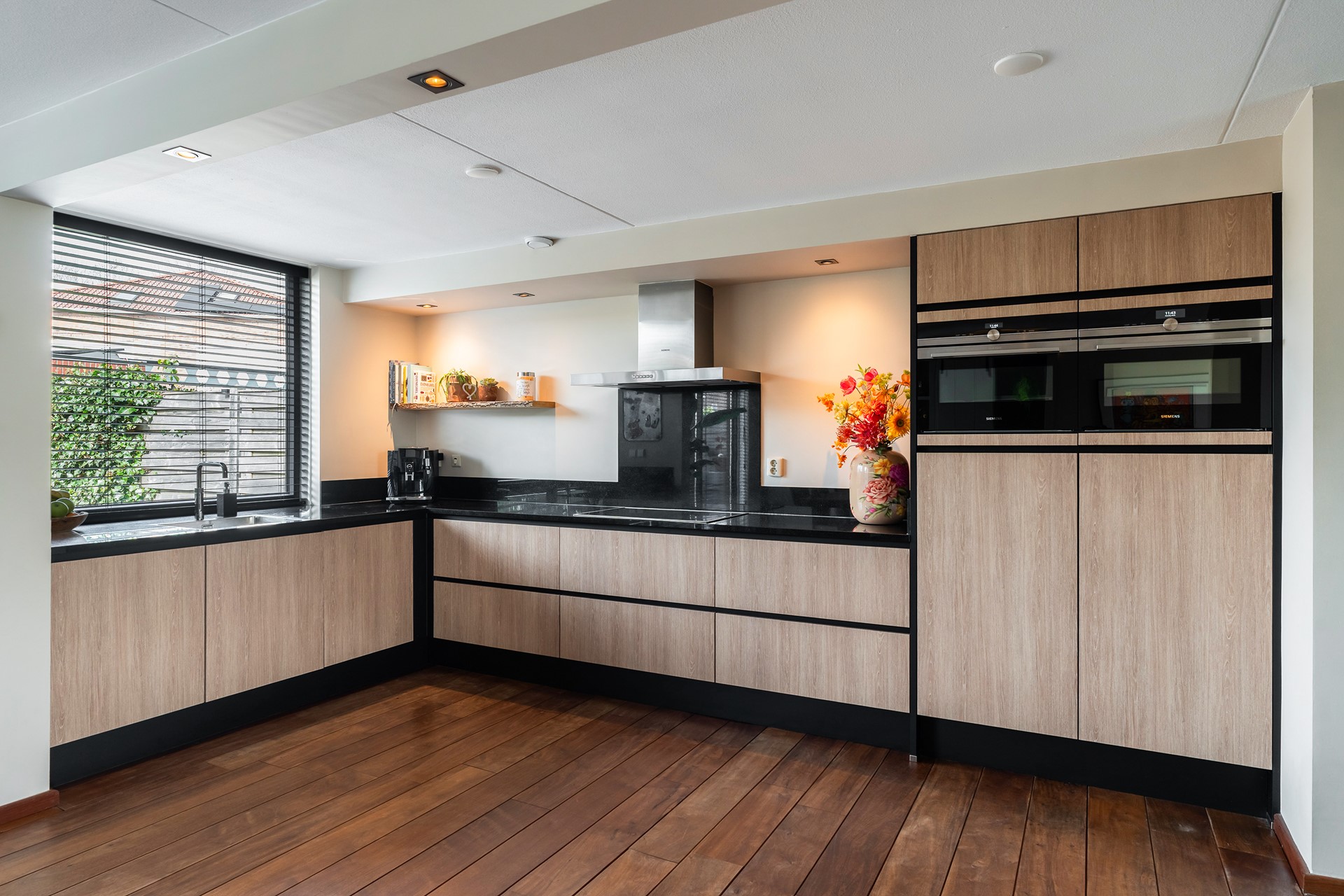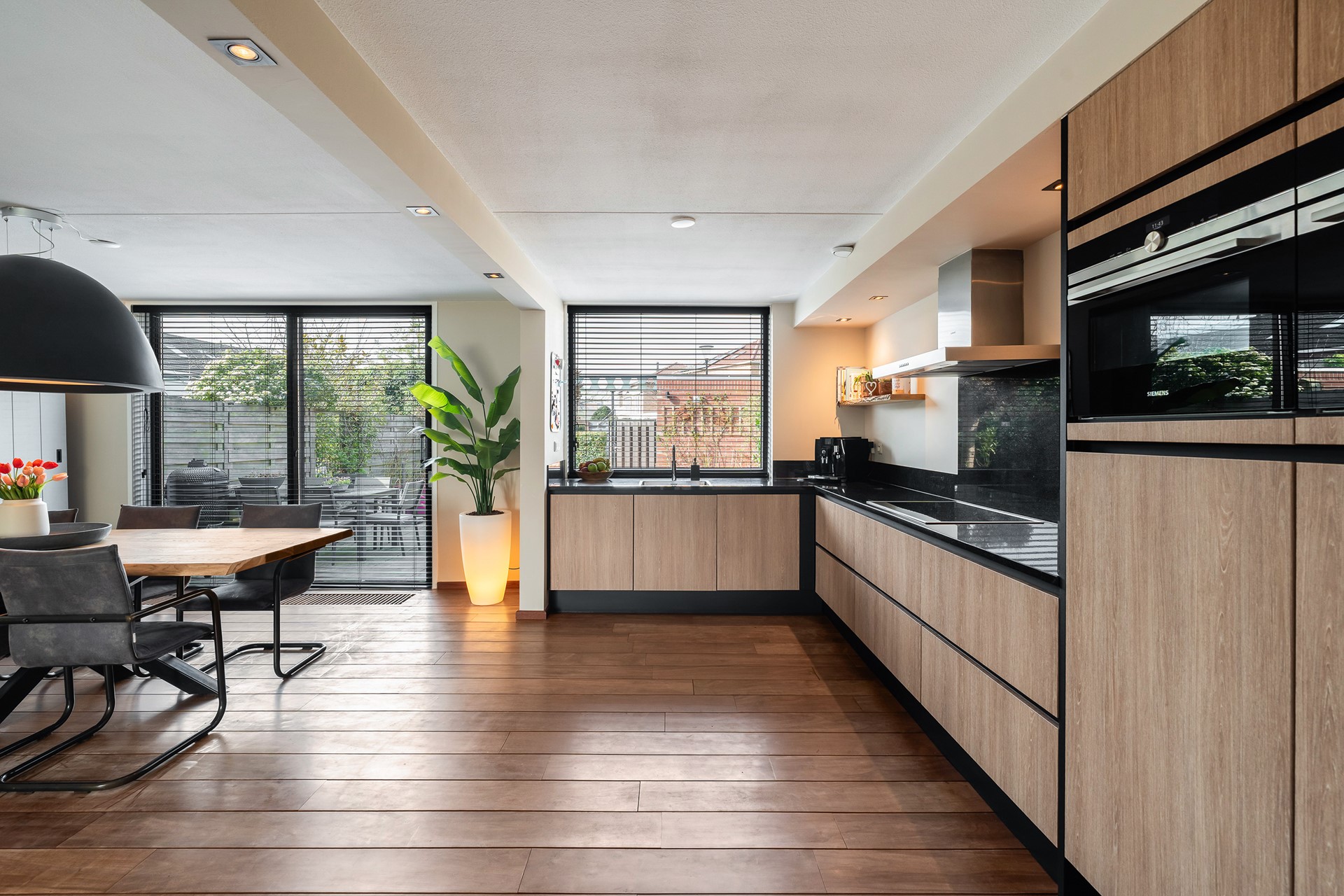 De ruim opgezette open keuken in hoekopstelling biedt zicht op de achtertuin en is modern uitgevoerd en voorzien van diverse inbouwapparatuur van Siemens, zoals een inductiekookplaat, combimagnetron, oven, afzuigkap, vaatwasser, koelkast, diepvrieskast, een natuurstenen aanrechtblad en een Quooker. Verder is er in de keuken een praktische bergkast aanwezig.