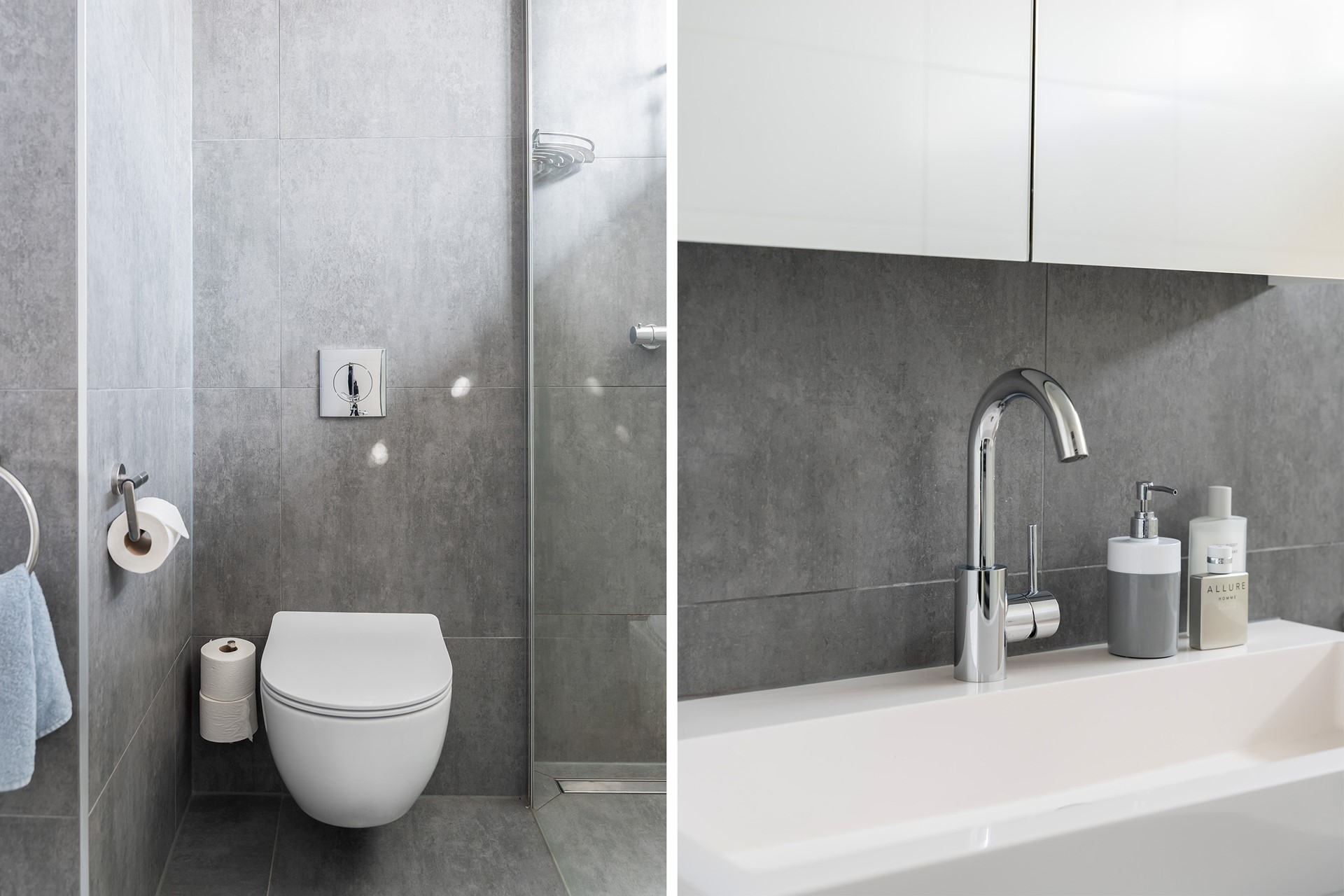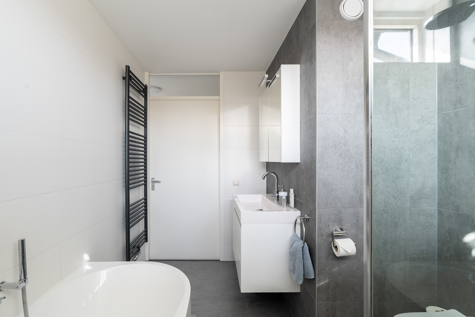 De complete badkamer is volledig betegeld en functioneel ingericht. De badkamer is uitgerust met een ligbad, inloopdouche, breed wastafelmeubel, handdoekradiator, hangtoilet en een raam voor natuurlijke ventilatie.