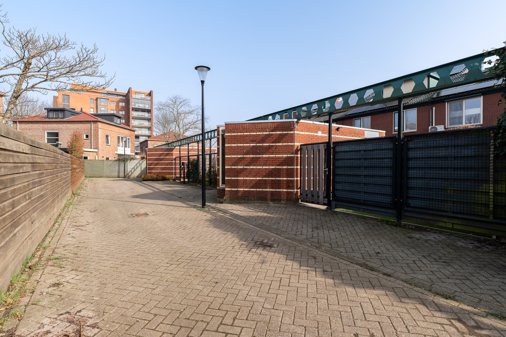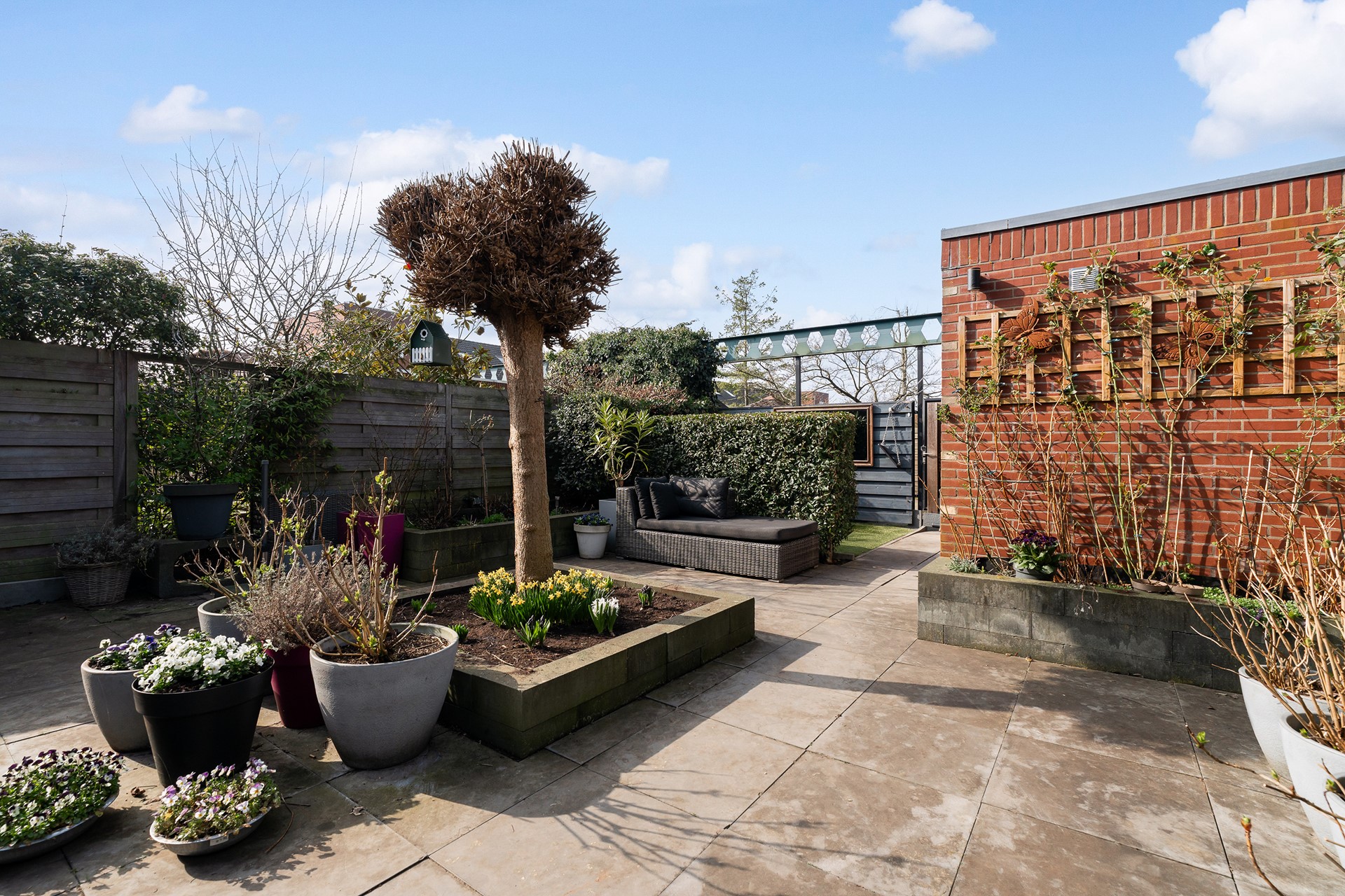 De vrij gelegen zonnige achtertuin, gelegen op het westen, is fraai aangelegd met sierbestrating en beplanting. De tuin is praktisch aangelegd, biedt veel privacy en u kunt hier de gehele dag van de zon genieten, terwijl het brede zonnescherm indien gewenst ook schaduw biedt. Achterin de tuin is een speelveldje van kunstgras. De tuin beschikt over een vrijstaande stenen berging. Direct achter de tuin bevindt zich een eigen parkeerplaats. Ook aan de voorzijde van de woning is voldoende openbare parkeergelegenheid.