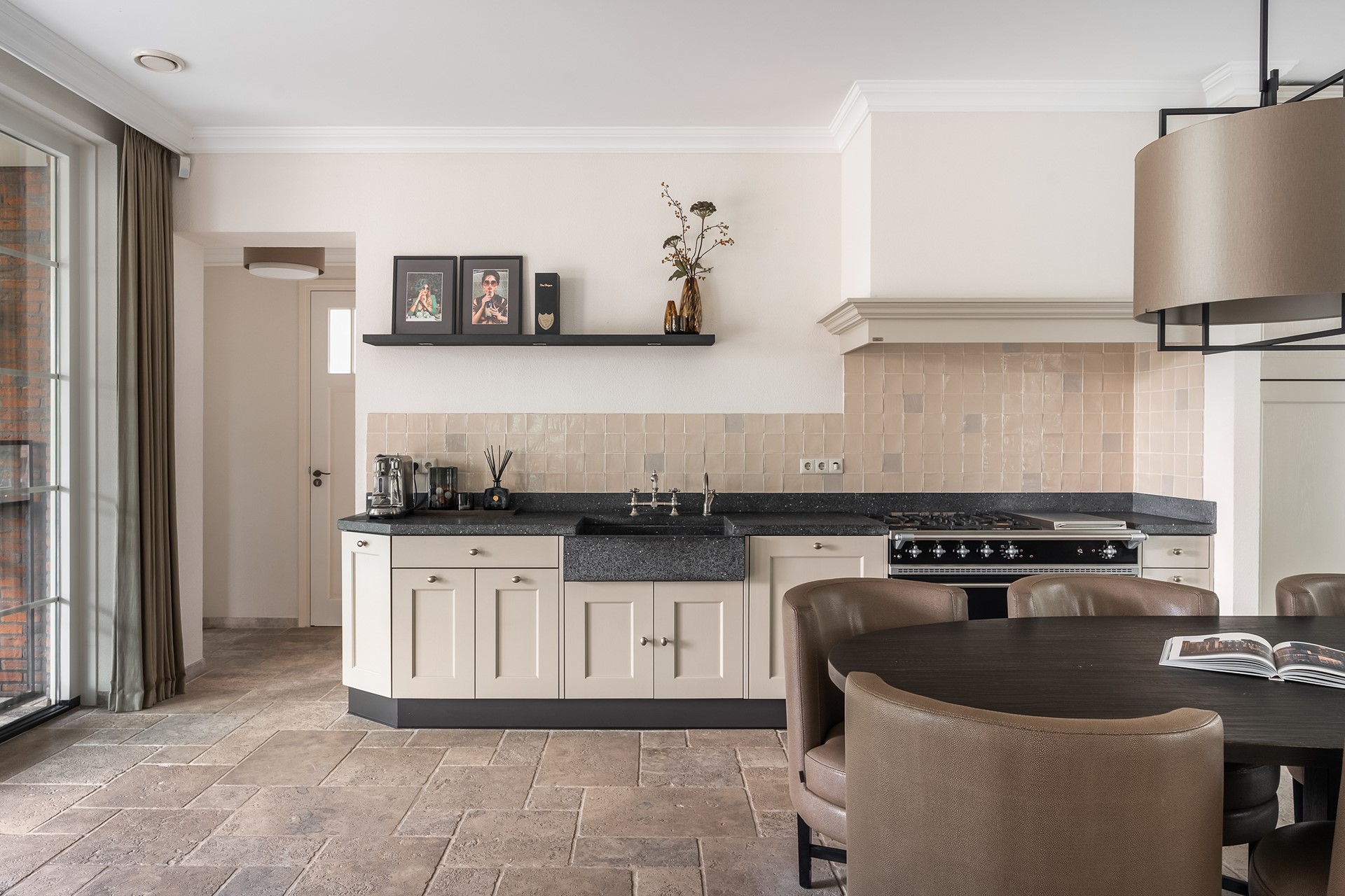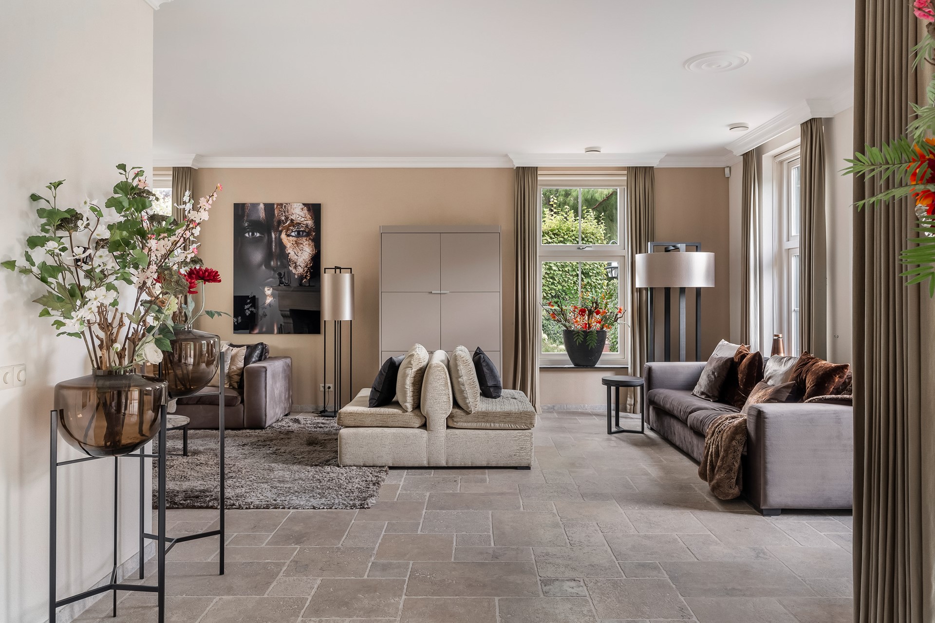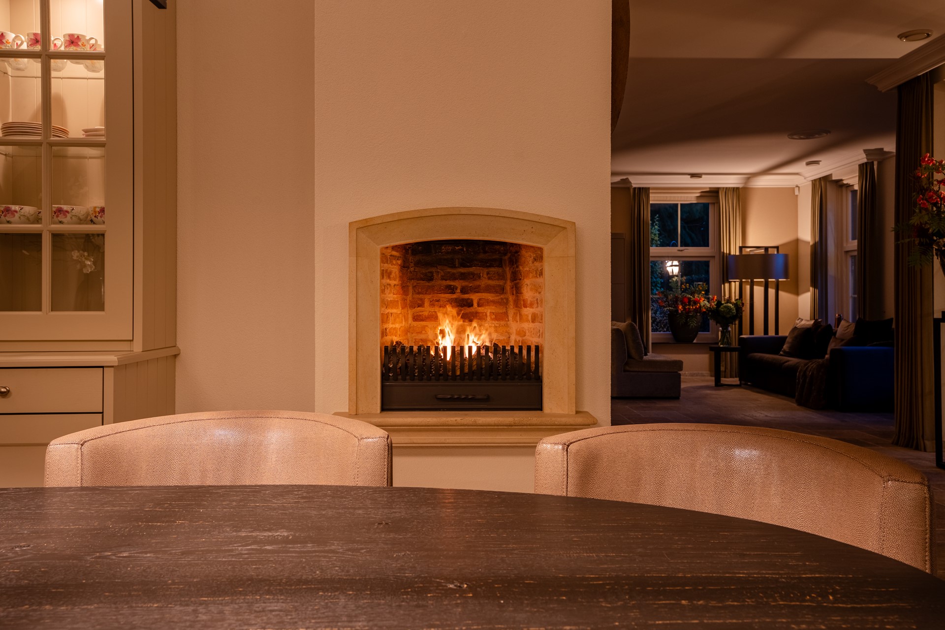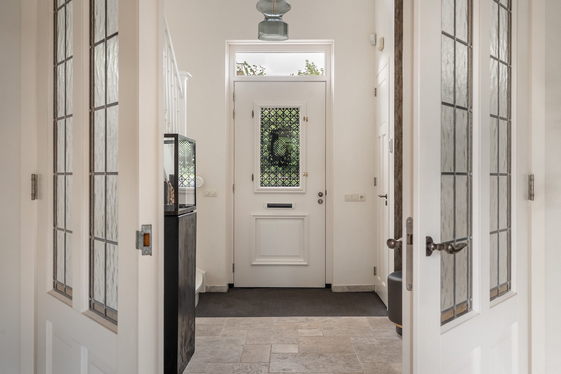 De royale entree geeft toegang tot de trapopgang, meterkast en een recent vernieuwd, luxe toilet. Dubbele deuren leiden naar de sfeervolle woonkamer met open haard en grote raampartijen die zorgen voor veel lichtinval. Aansluitend ligt de ruime Tinello woonkeuken, uitgevoerd met houten fronten, natuurstenen werkblad en hoogwaardige inbouwapparatuur: een Miele combi-oven en vriezer, Quooker, Liebherr koelkast, afzuigsysteem en een Lacanche 4-pits gasfornuis.
