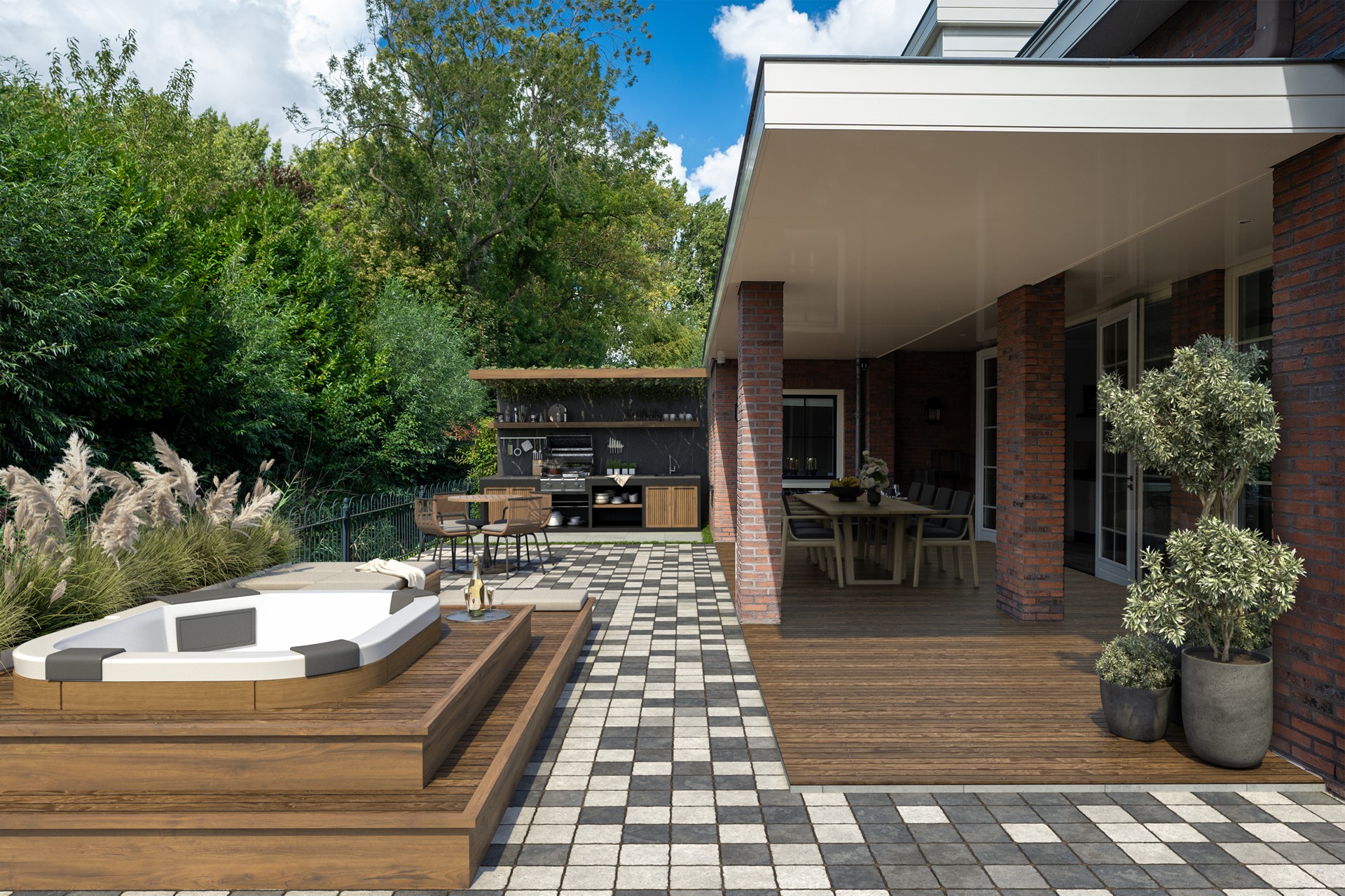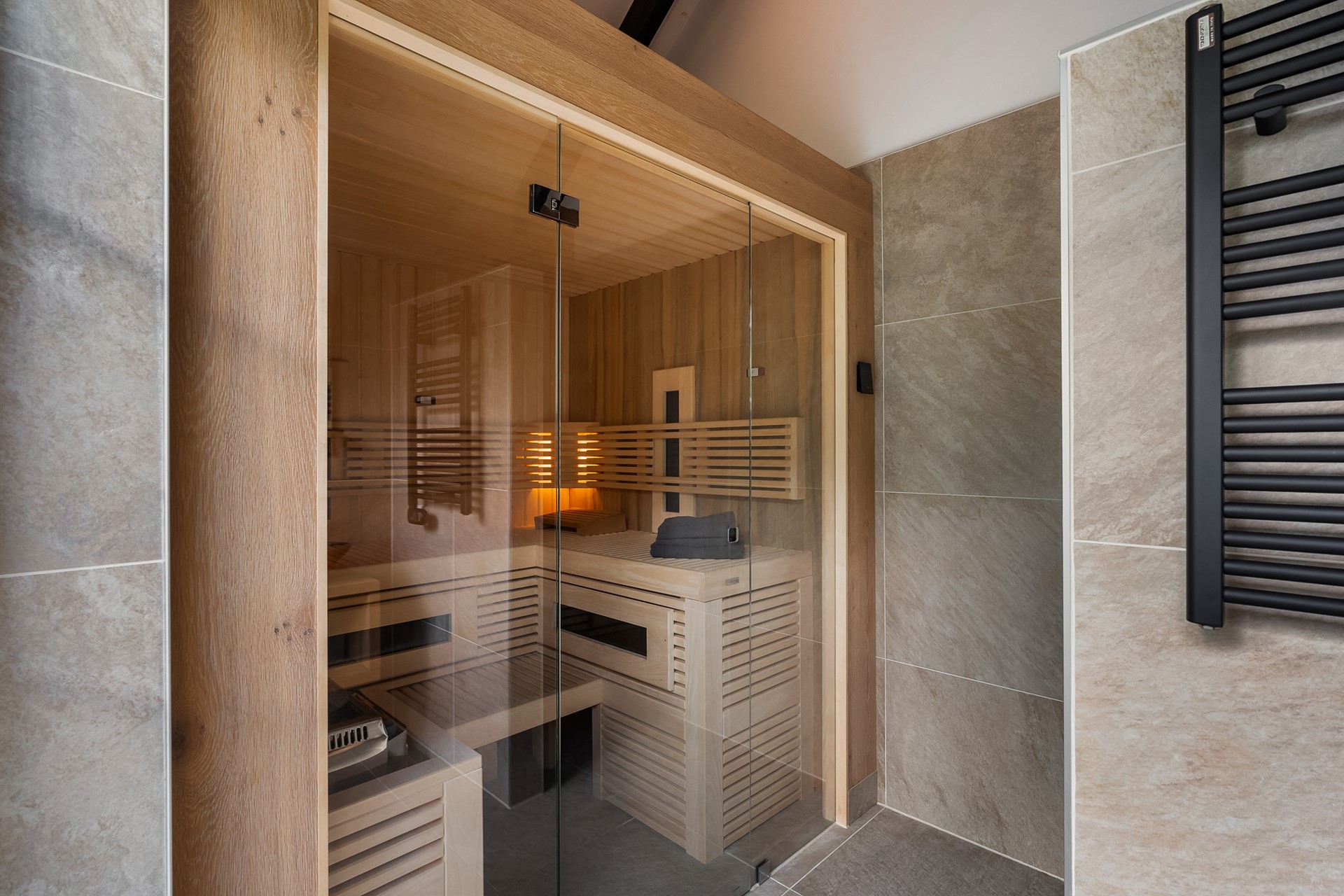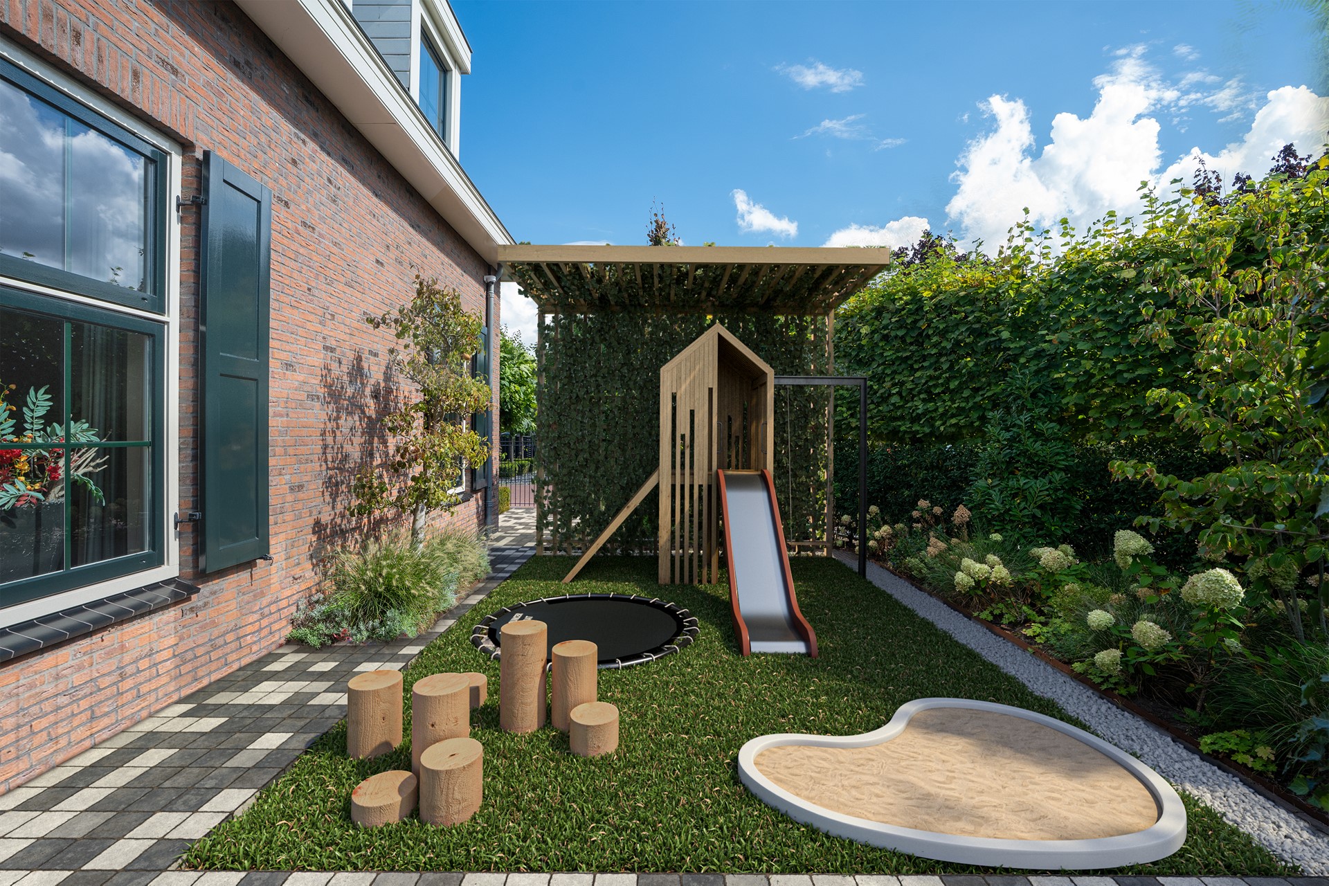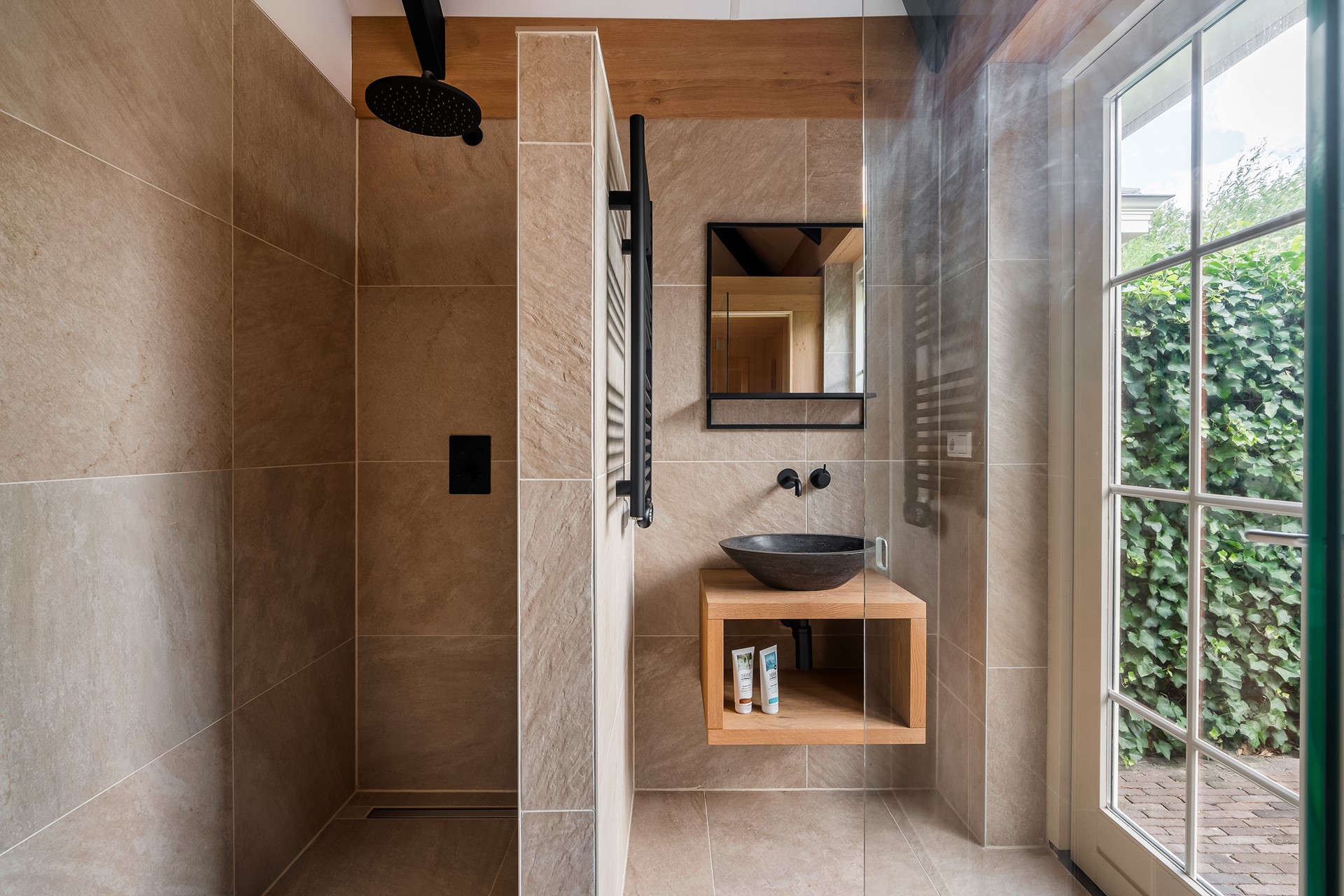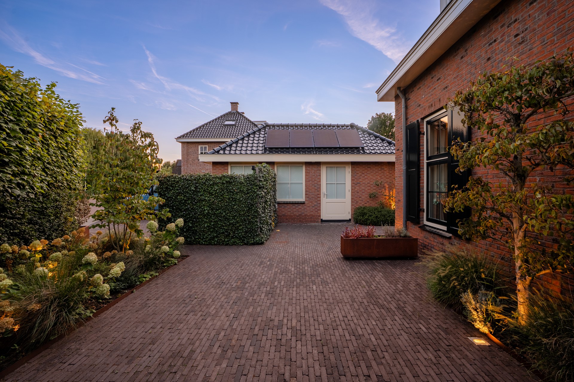 De fraai aangelegde tuin is rondom de woning gesitueerd en beschikt over meerdere terrassen. Aan de voorzijde staat een vrijstaand bijgebouw, in 2019 gebouwd in dezelfde stijl als de woning. In dit gebouw bevindt zich een luxe wellnessruimte, het andere gedeelte fungeert als garage, voorzien van een elektrische roldeur en zonnepanelen. Het gehele perceel is volledig afgesloten met een elektrisch hek, een alarmsysteem en buitencamera’s, waardoor optimale privacy en veiligheid zijn gewaarborgd.