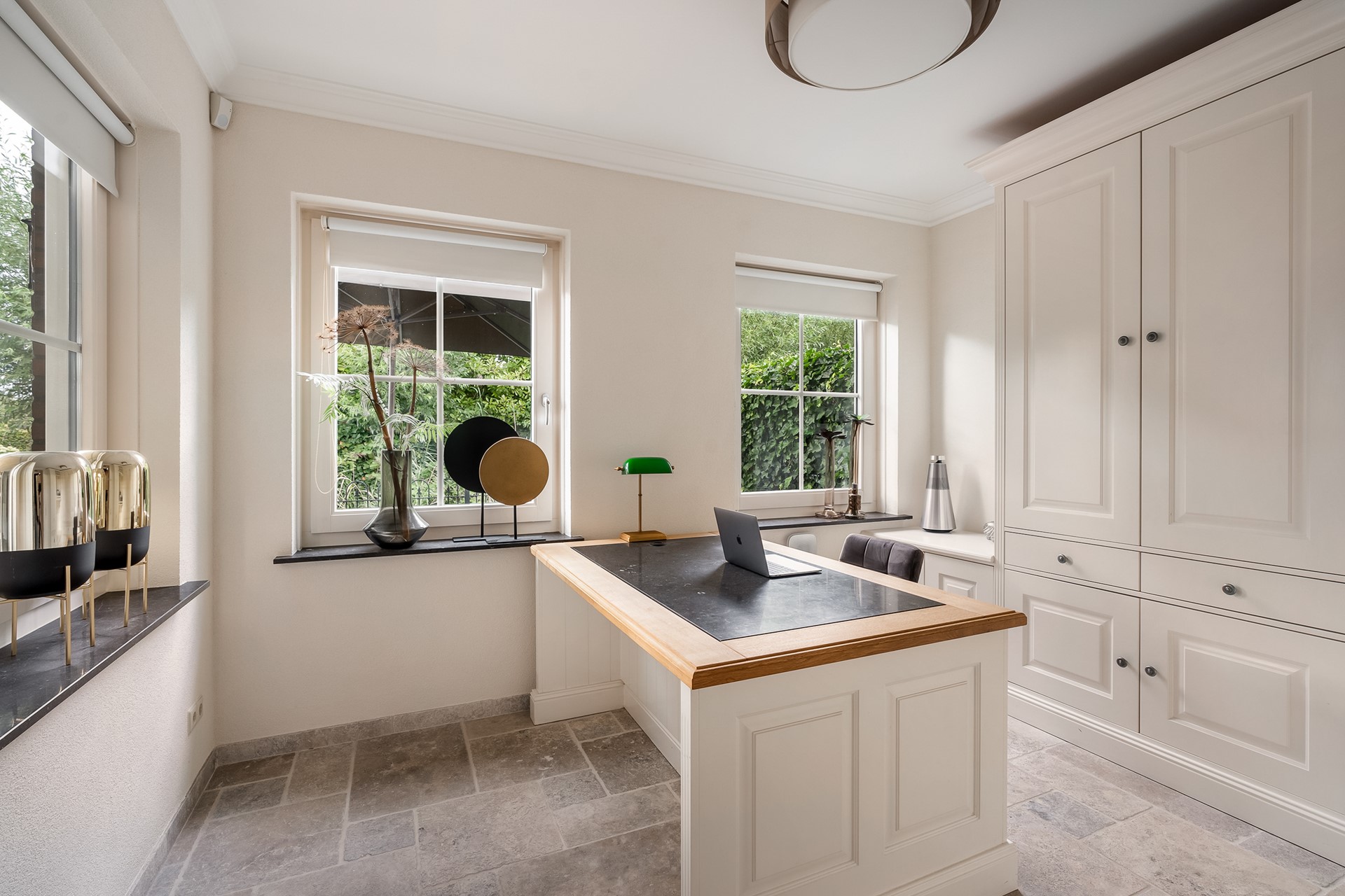 Op de begane grond vindt u daarnaast een werkkamer met een vaste kastenwand, een bijkeuken met aansluitingen voor wasapparatuur en een inpandige bergruimte met schuifwandkasten en lichtkoepel.