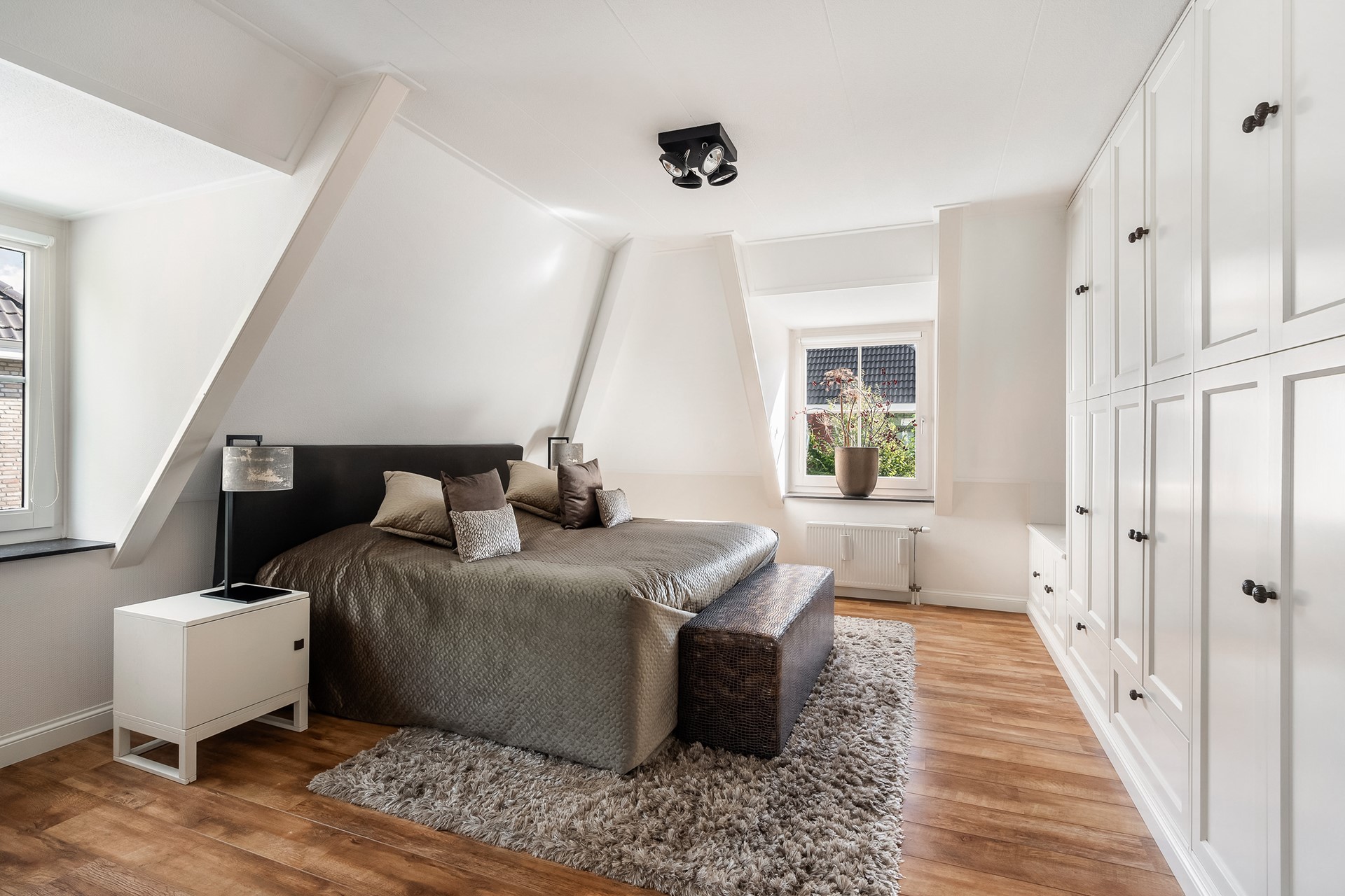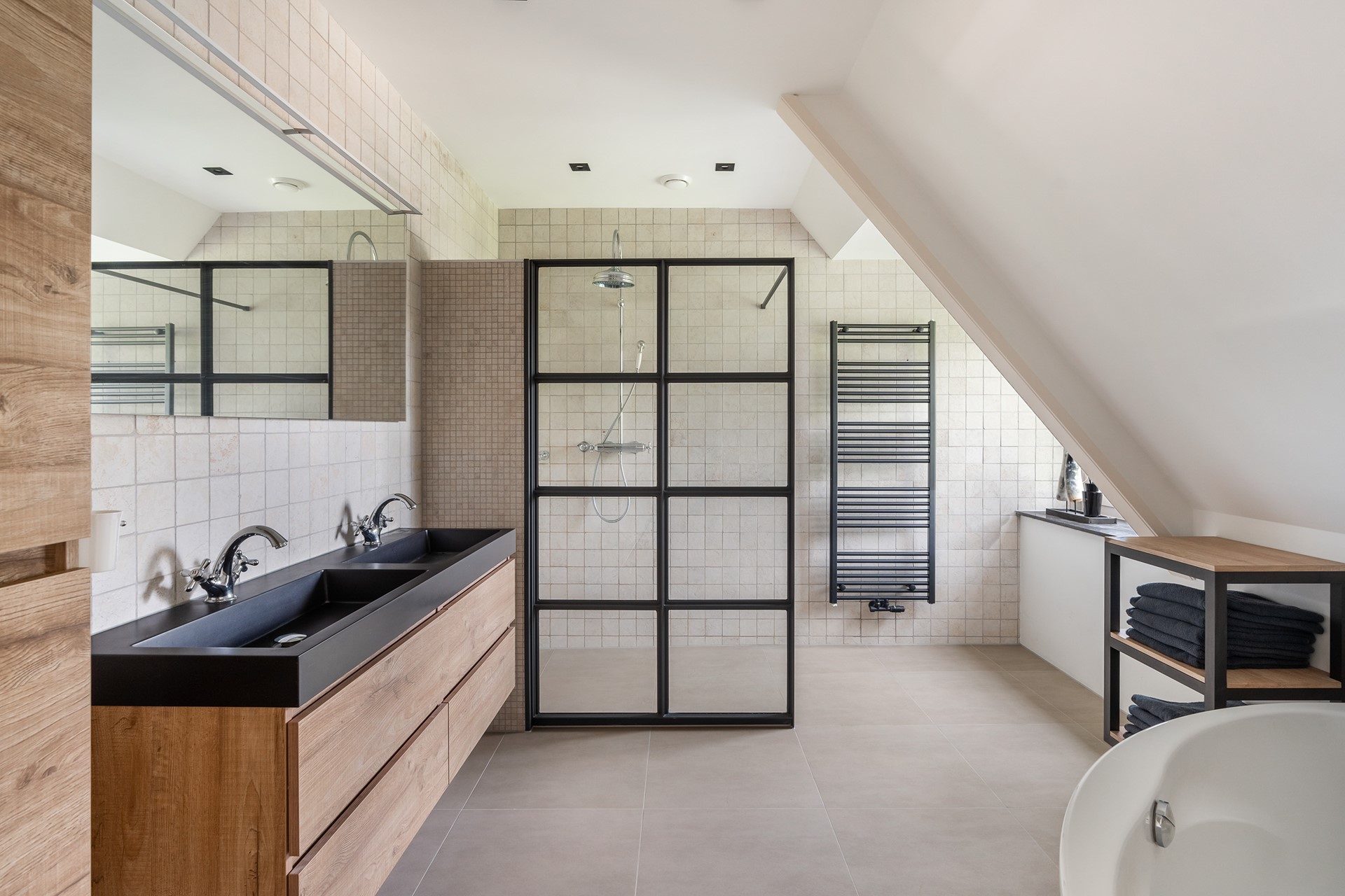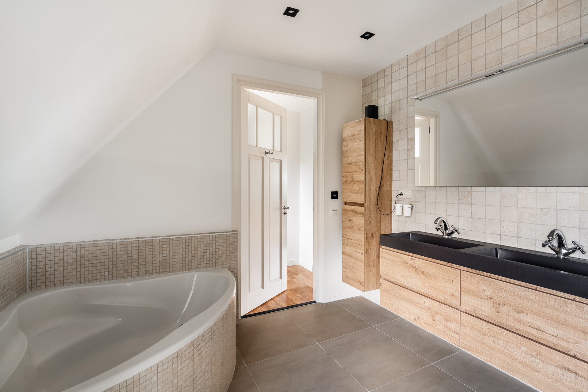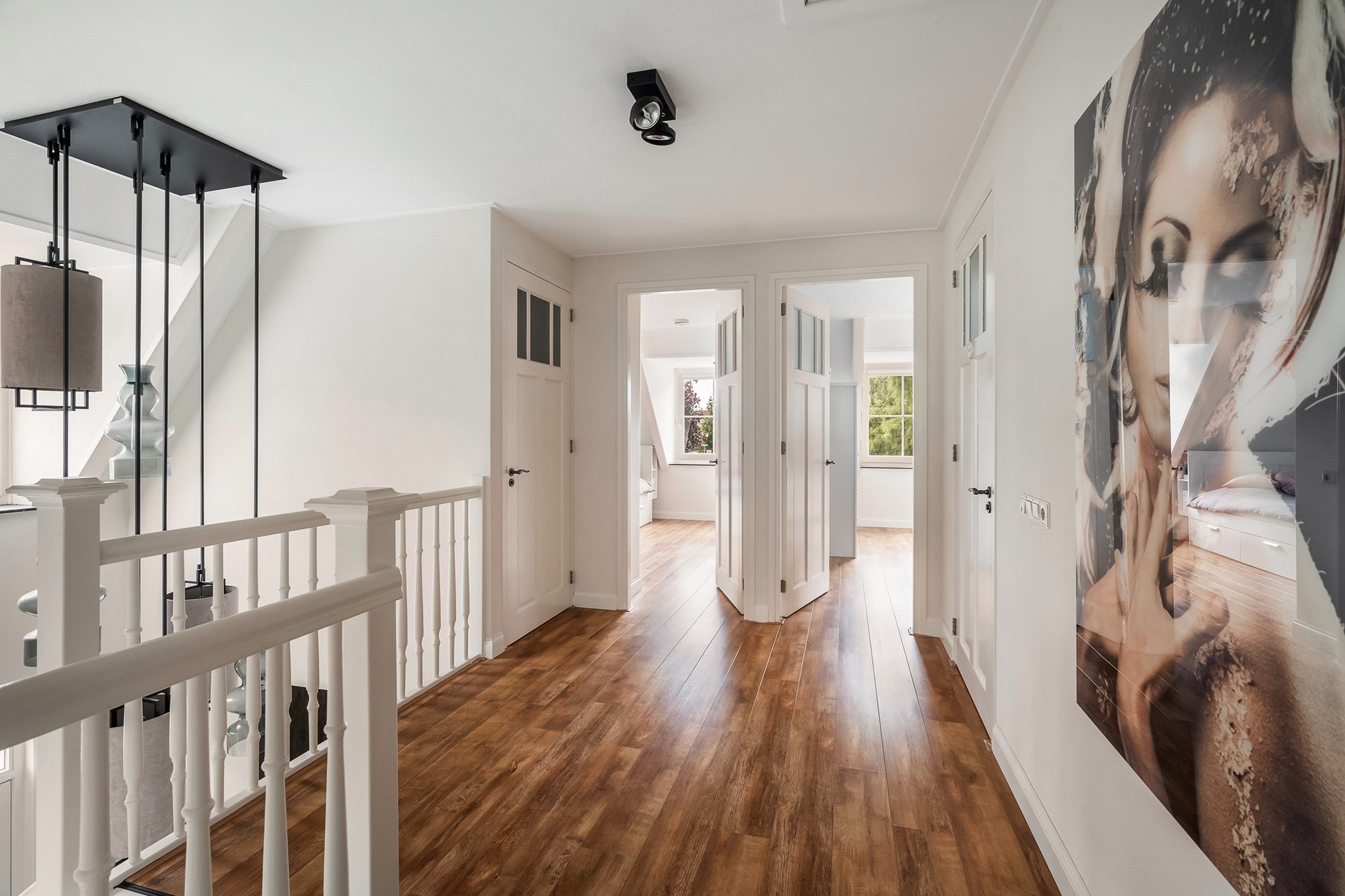 Via de houten trap bereikt u de overloop met vide. Hier bevinden zich drie royale slaapkamers. De master bedroom beschikt over een vaste kastenwand, inloopkast en luxe badkamer met ligbad, inloopdouche, dubbele wastafel en vernieuwde vloer met vloerverwarming. Daarnaast is er een tweede badkamer met douche en wastafel en een apart vernieuwd toilet. Alle slaapkamers zijn voorzien van Daikin airconditioning.