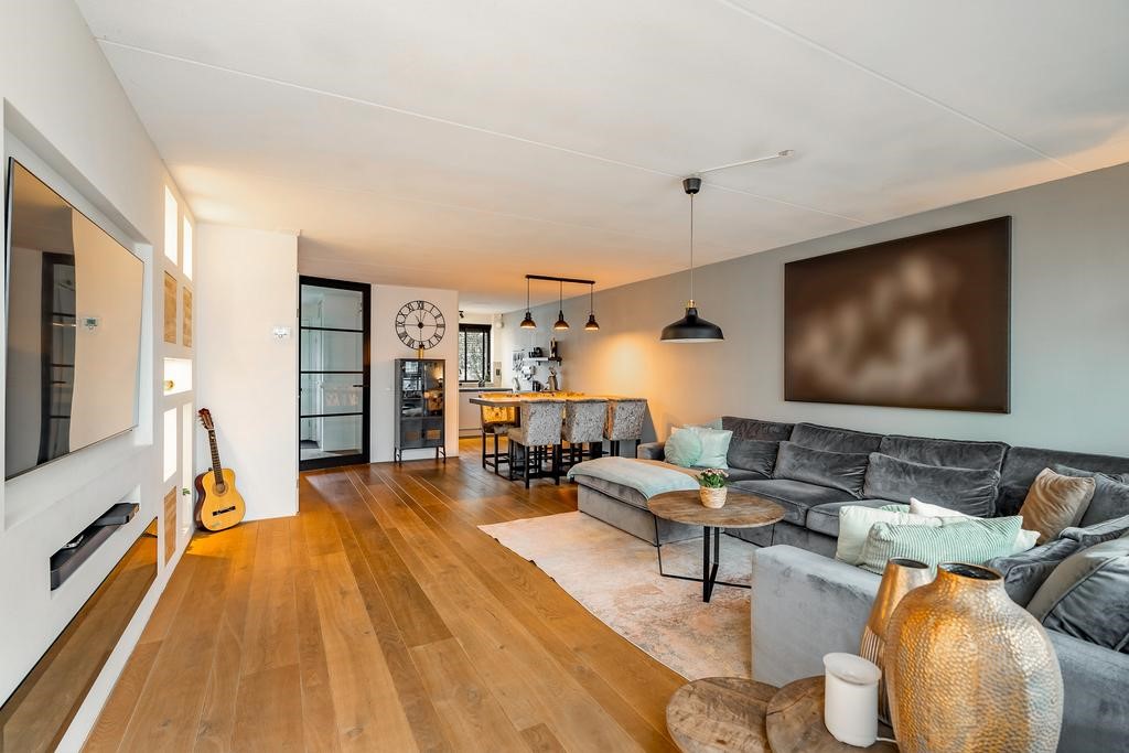 De woonkamer beschikt over een parketvloer, raampartijen en een openslaande deur naar de tuin met serre. Als kers op de taart beschikt de woonkamer over een prachtige cinewall.