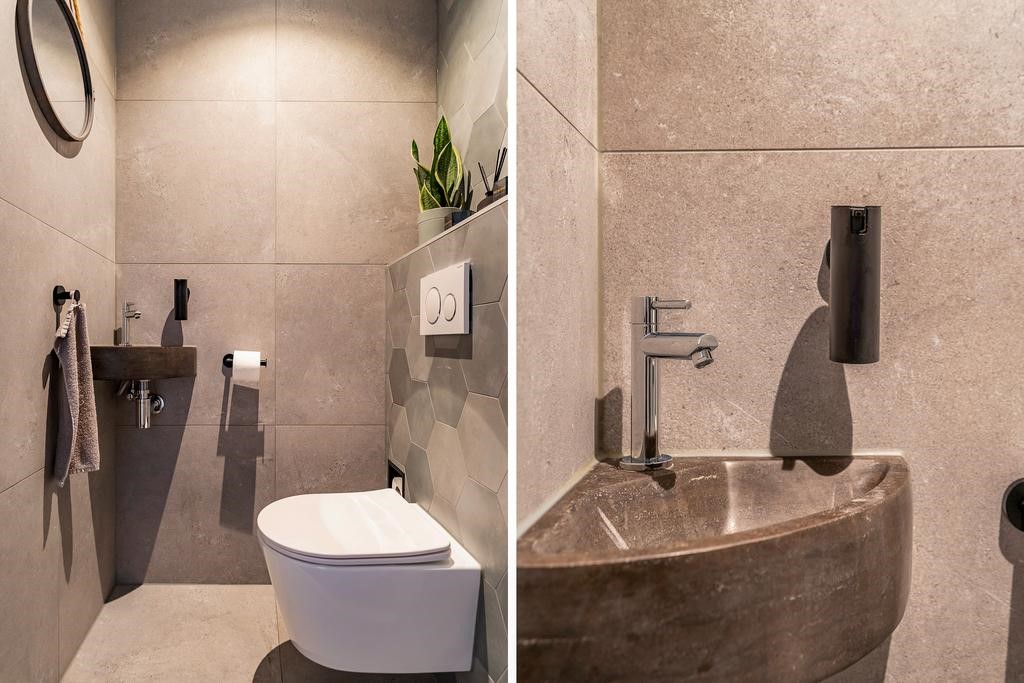 De toiletruimte is geheel betegeld en beschikt over een wandcloset en een fonteintje.
