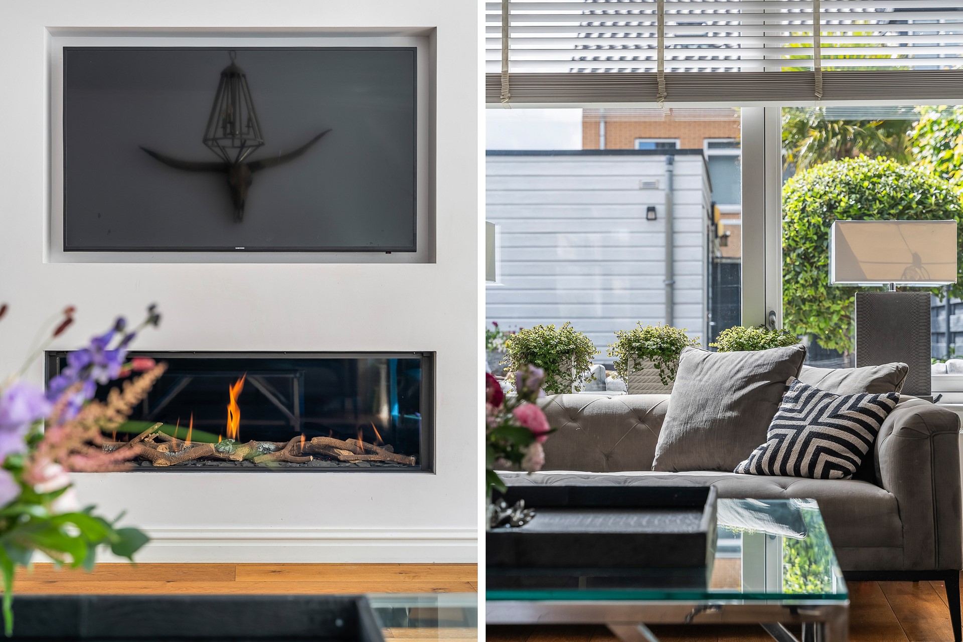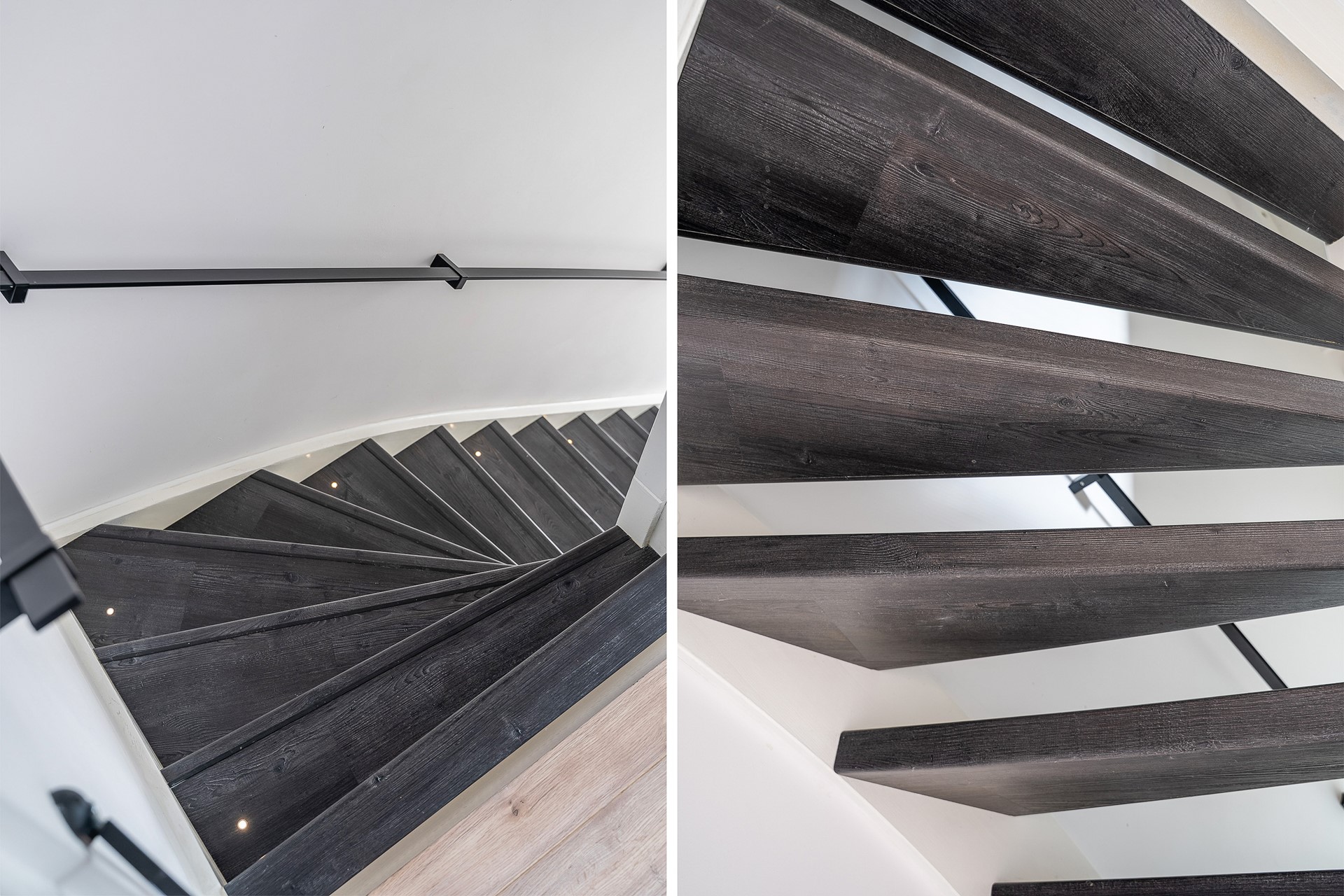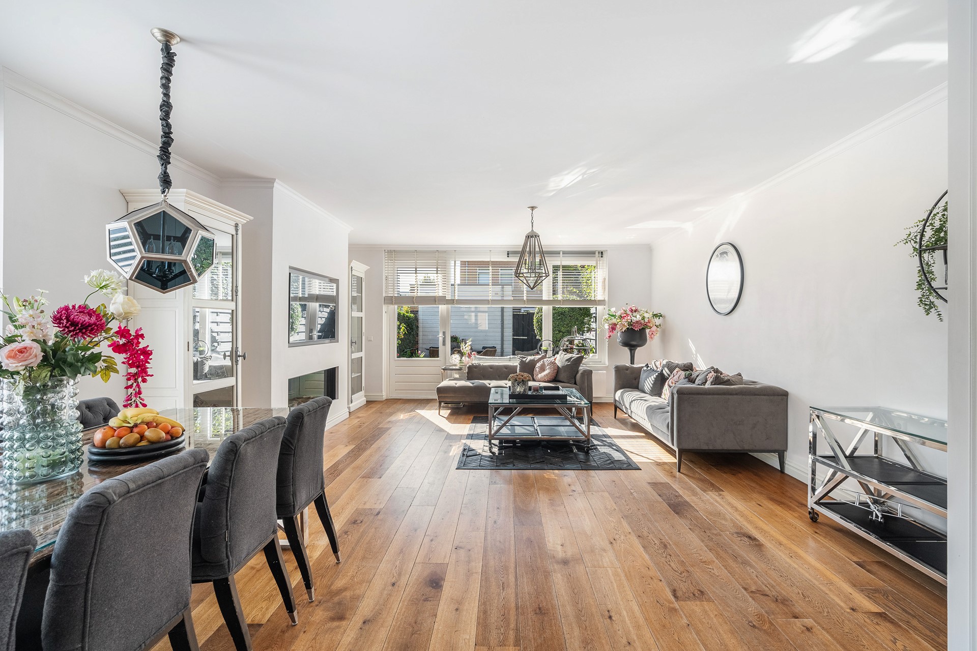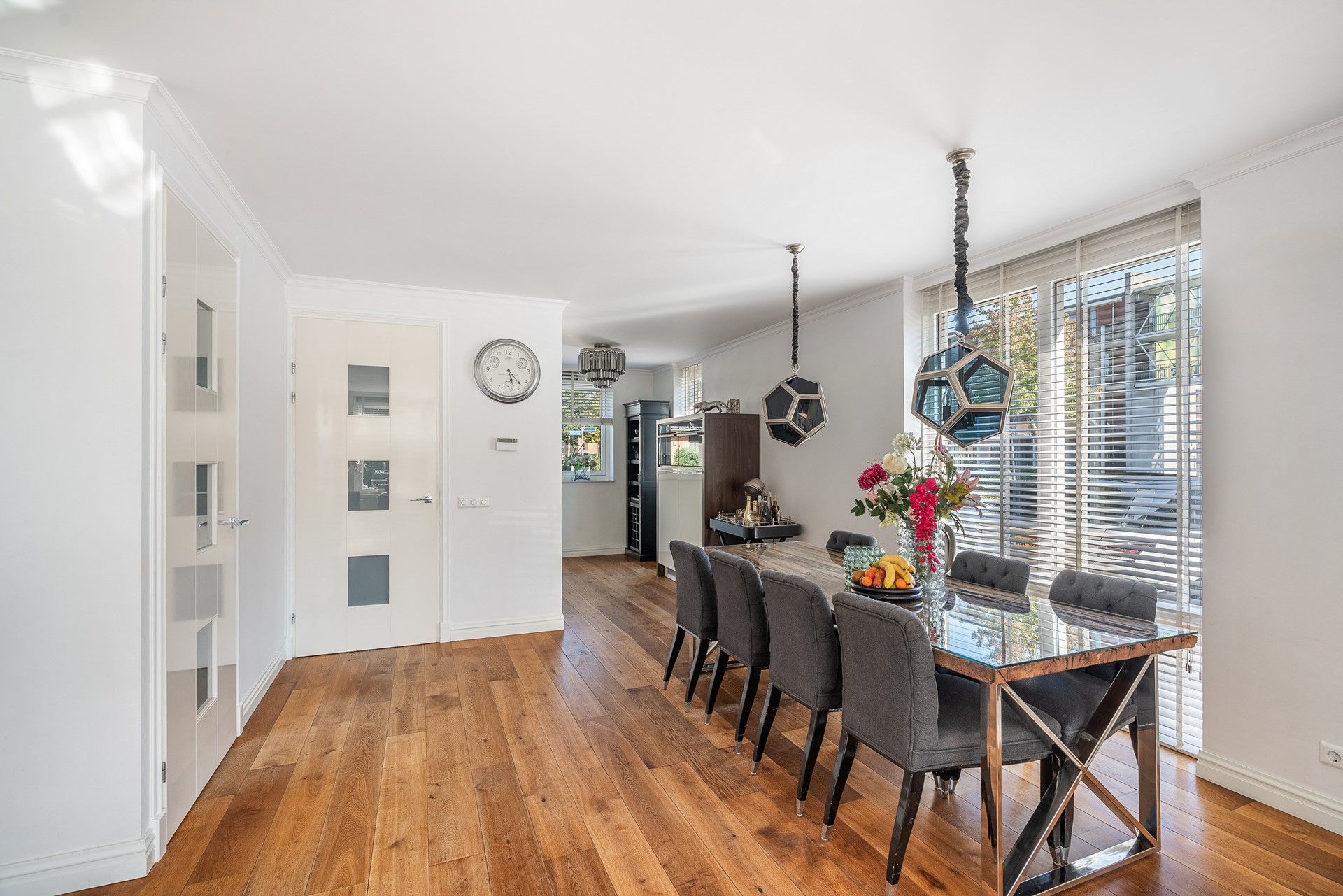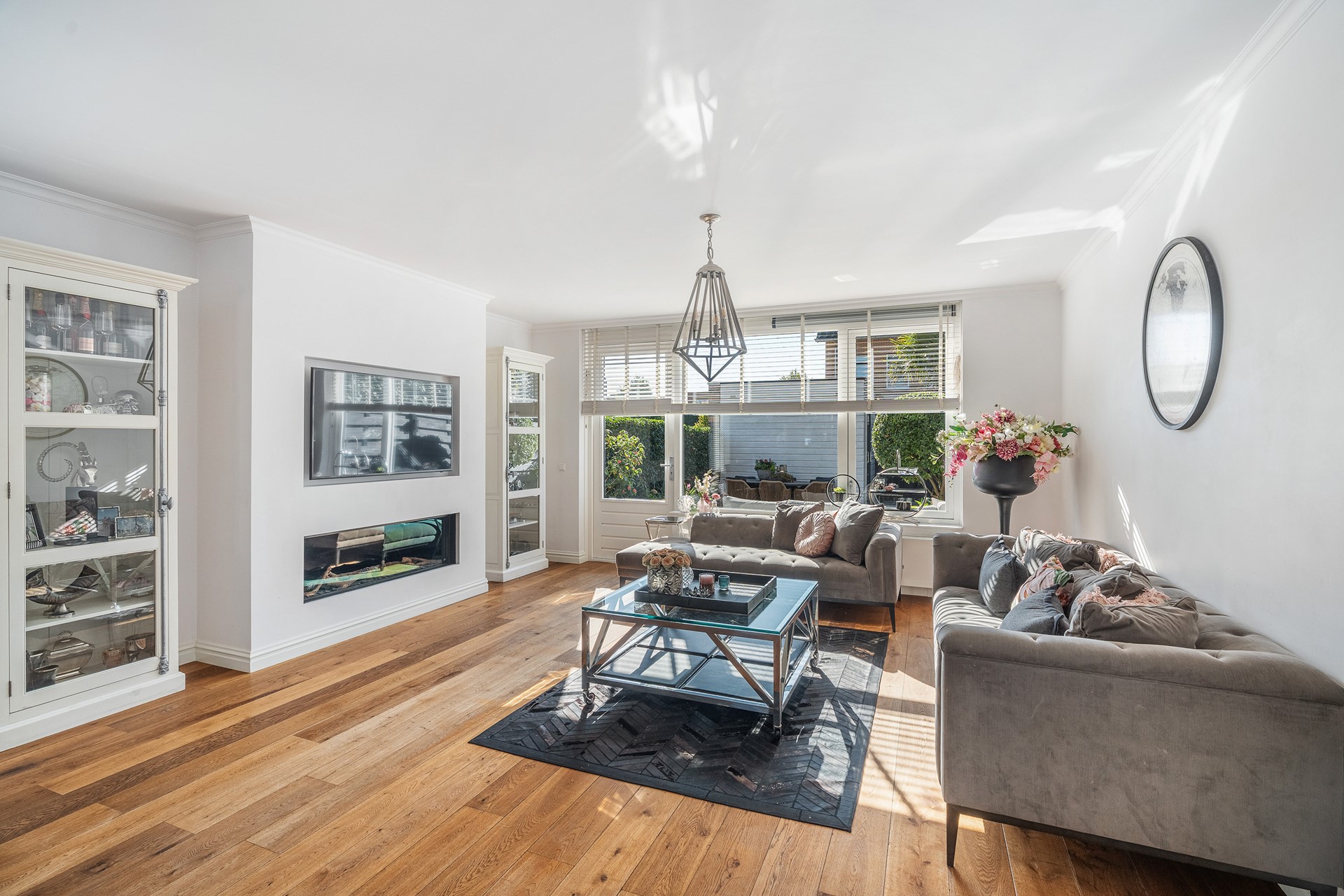 Via de verzorgde voortuin komt u binnen in de hal, voorzien van meterkast, toilet en trap naar boven. De woonkamer is afgewerkt met een warme parketvloer, hoge witte plinten, elegante plafondlijsten, strakke wandafwerking en stijlvolle deuren. Dankzij de hoekligging geniet de woonkamer van veel natuurlijke lichtinval via de ramen aan de zijkant van de woning. Tevens is er een handige trapkast met veel extra bergruimte. Een gave cinewall biedt plek voor een grote tv en een gashaard, wat een gezellige sfeer creëert. Vanuit de woonkamer is er directe toegang via een deur tot de achtertuin.