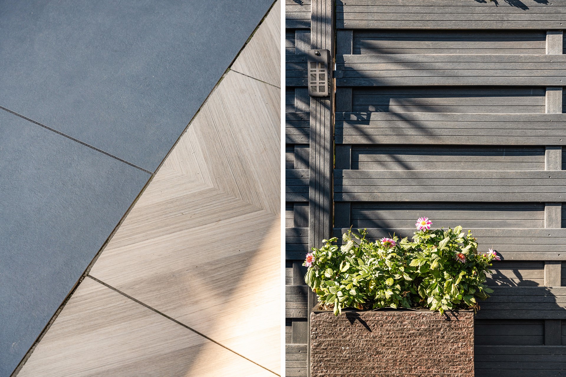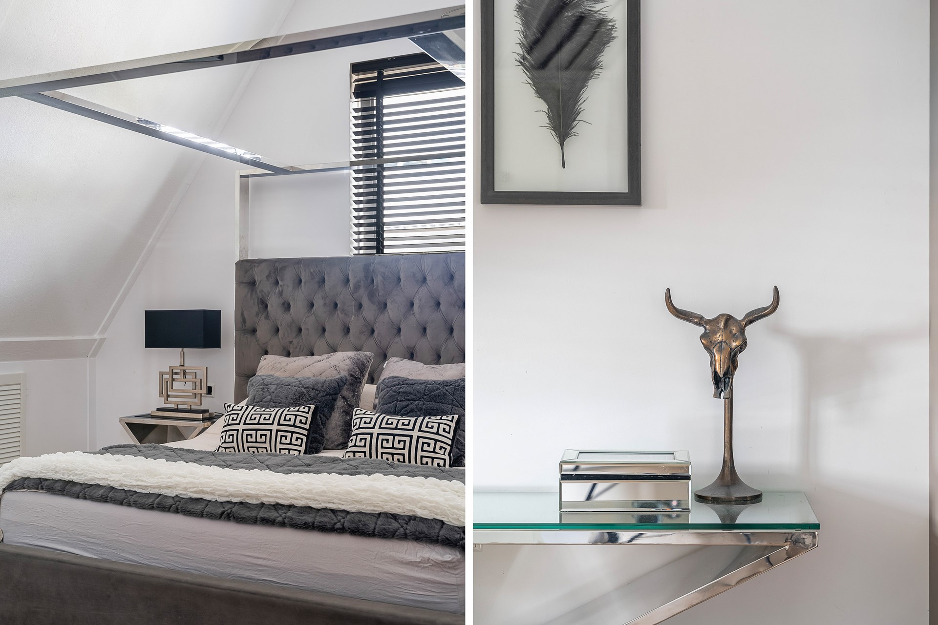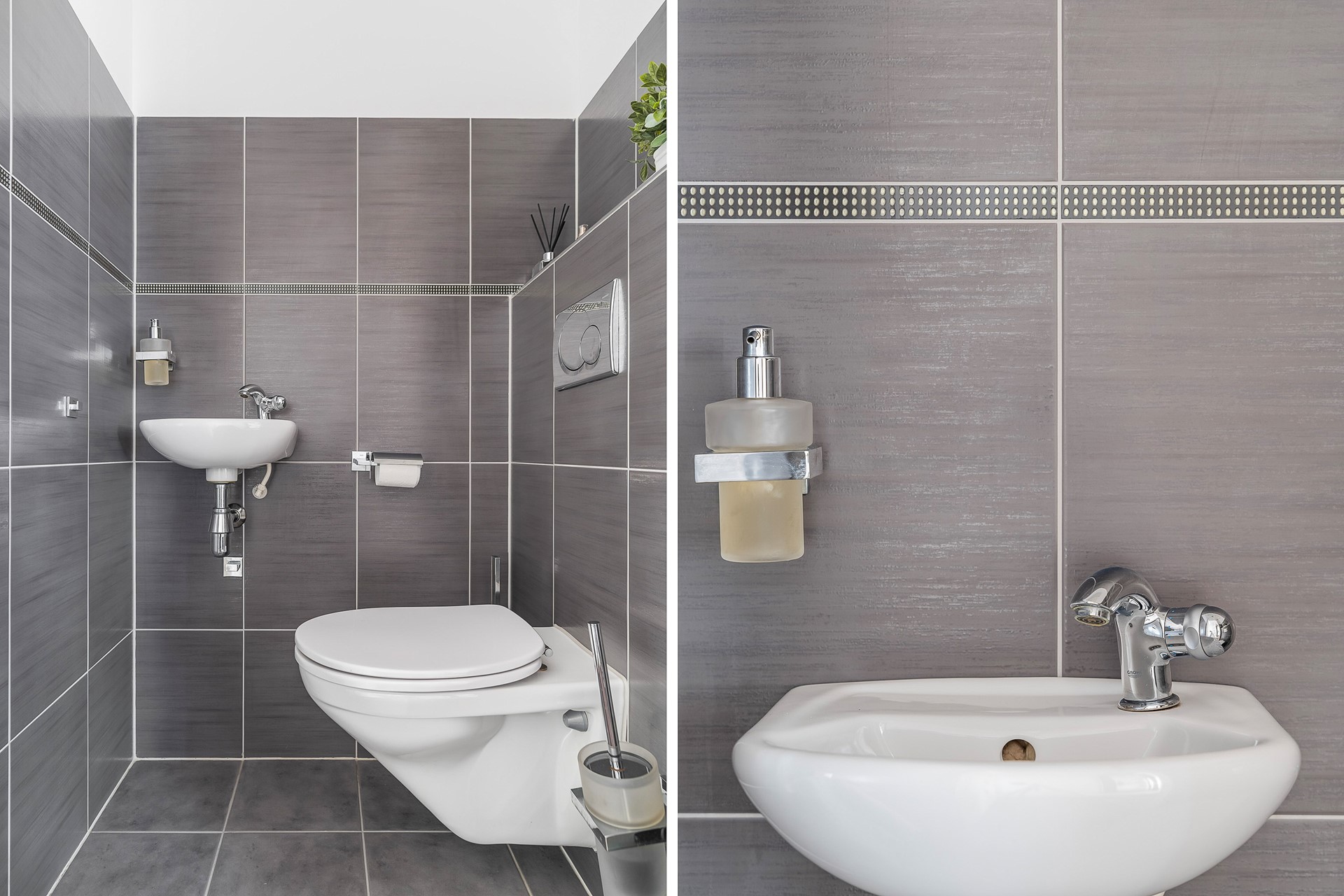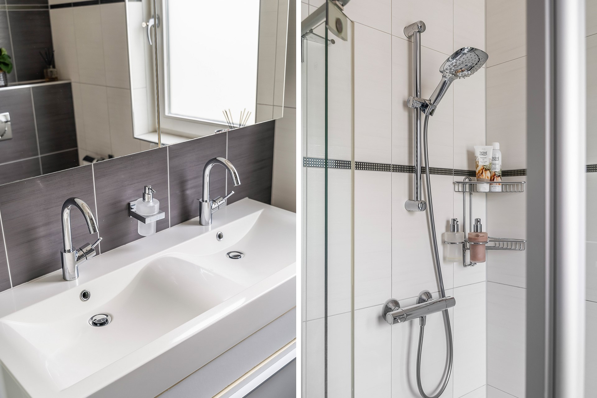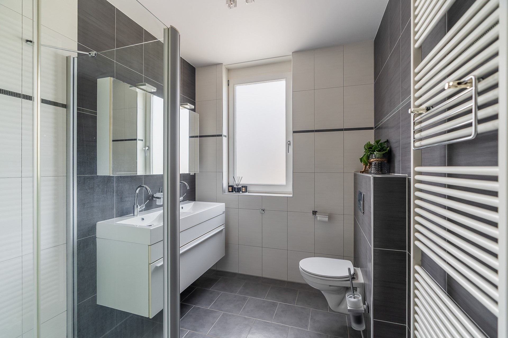 De badkamer is stijlvol afgewerkt met een combinatie van witte en antracietkleurige tegels, doorlopend tot aan het plafond. Er is een raam wat zorgt voor natuurlijke ventilatie en een fijne lichtinval. De badkamer beschikt over een zwevend toilet, douchecabine, dubbele wastafel met meubel en verlichte spiegelkasten, waardoor u hier comfortabel kunt genieten van uw dagelijkse routine.