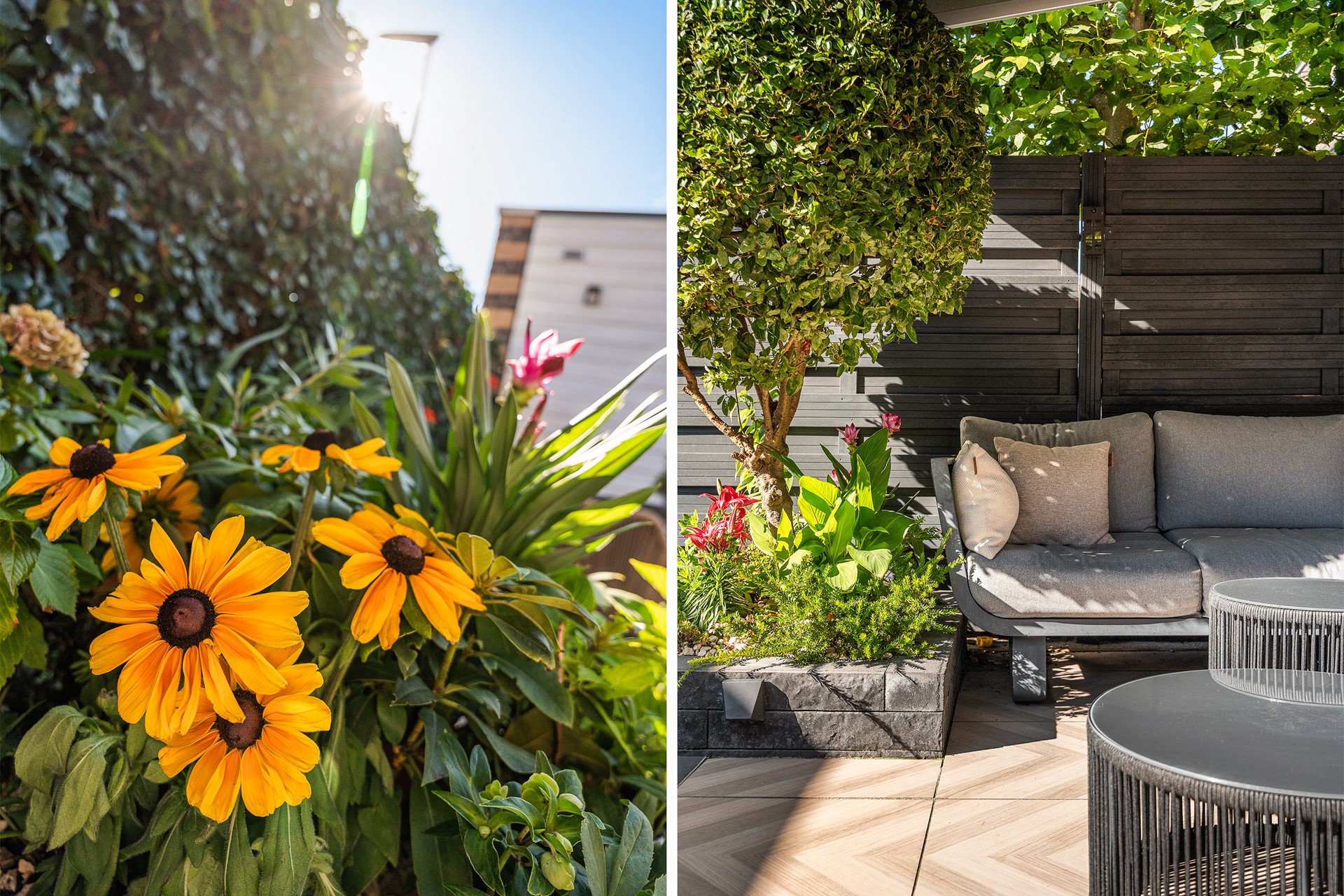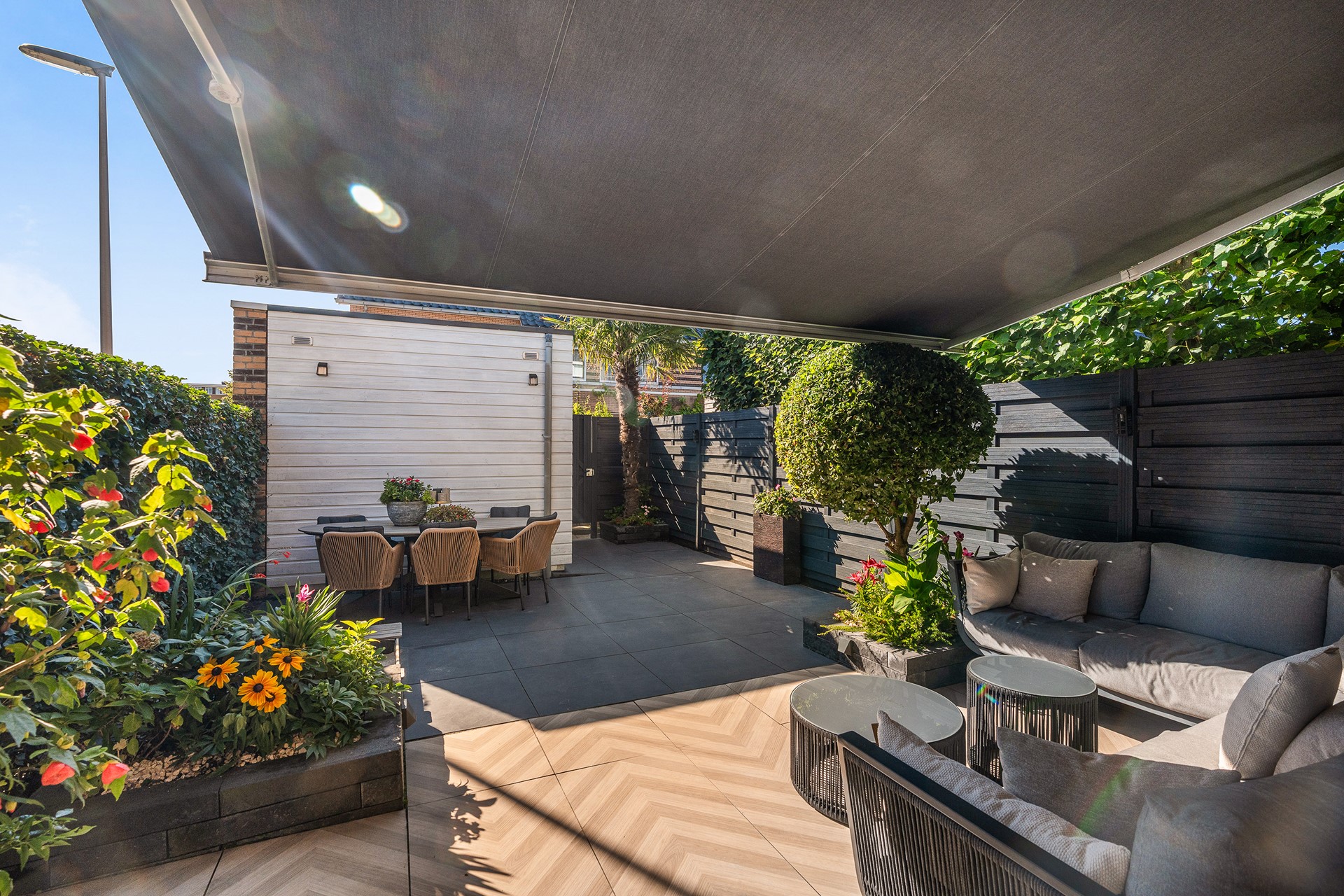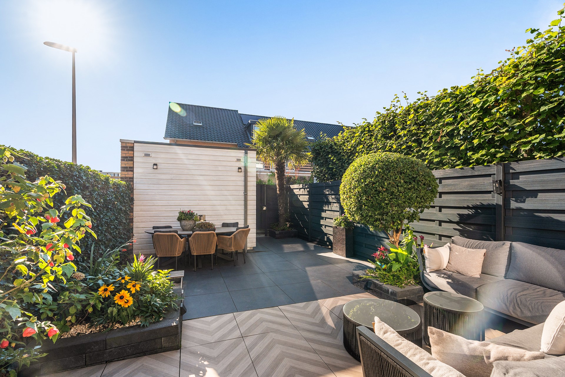 De achtertuin, gelegen op het zonnige westen, is zeer fraai aangelegd met mooie betegeling, diverse plantenbakken met sierbeplanting en een fijn zonnescherm. Hier kunt u heerlijk ontspannen en uw gasten ontvangen. Daarnaast is er een royale houten schuur en een achterom aanwezig voor extra gemak. Voor en naast de woning is er ruim voldoende parkeergelegenheid, waardoor u altijd makkelijk een parkeerplekje vind.