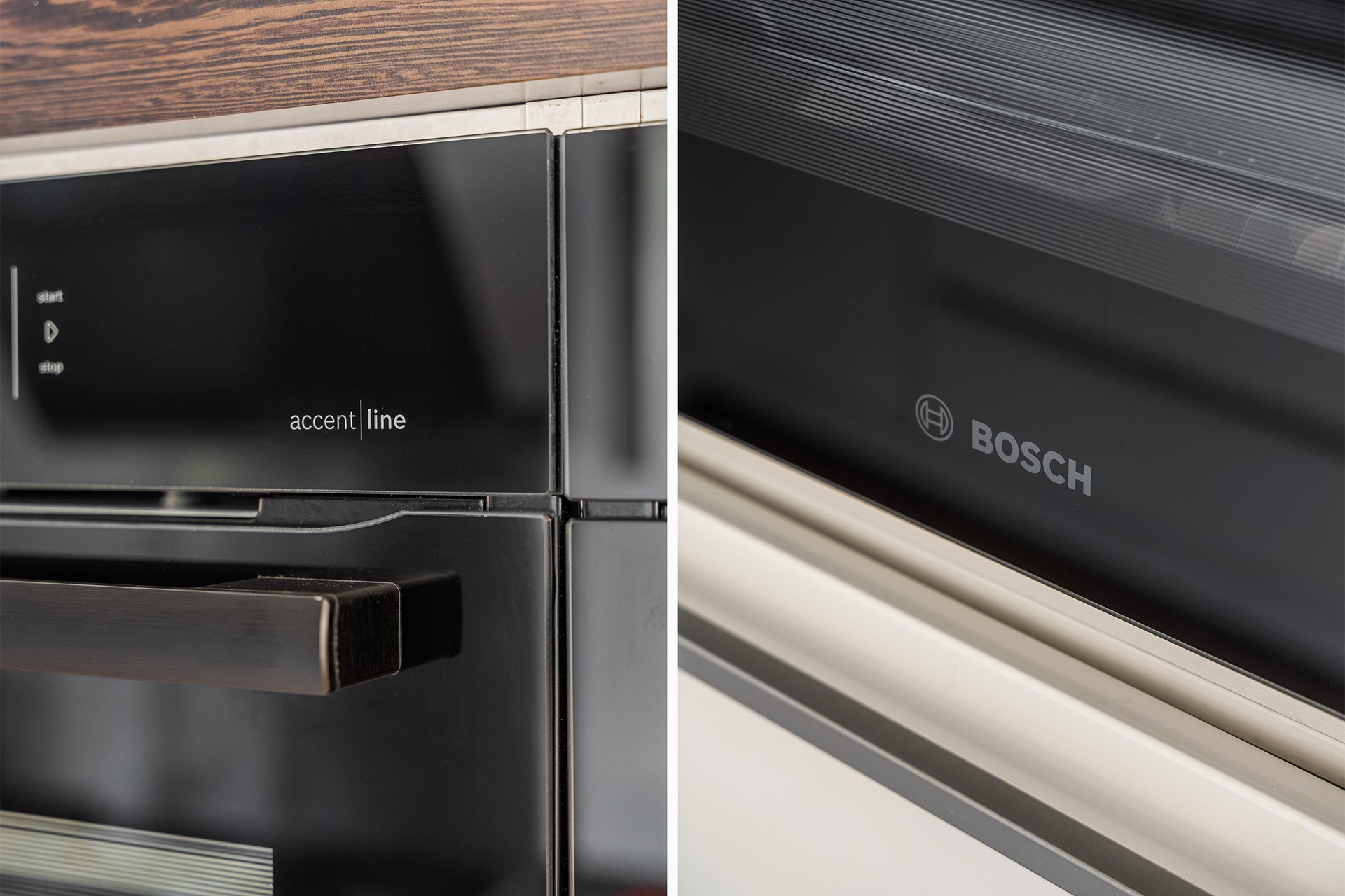 De open keuken is modern en praktisch ingericht met een wandopstelling voorzien van vaatwasser, 5-pits gasfornuis, vlakscherm afzuigkap, een quooker combi + kraan en een fraaie RVS achterwand. Een losse wandunit met een stoomoven en een combi-oven, koelkast en vriezer maakt het geheel compleet. De kasten zijn uitgevoerd in een lichte hoogglans tint en het geheel is afgewerkt met een mooi robuust werkblad. De raampartijen aan voor- en zijkant zorgen voor veel licht en geven de ruimte een uitnodigende uitstraling.