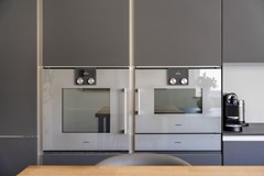 De moderne open design keuken bevindt zich in het verlengde van de woonkamer. De keuken is werkelijk van alle gemakken voorzien! Deze beschikt over een vaatwasser, een Siemens inductiekookplaat met geïntegreerde afzuiging, een Quooker, Gaggenau combimagnetron en Gaggenau oven met een warmhoudlade. Het geheel is prachtig afgewerkt met donker getinte glasfronten en Lapitec werkblad. Het keukeneiland beschikt bovendien over een bartafel.