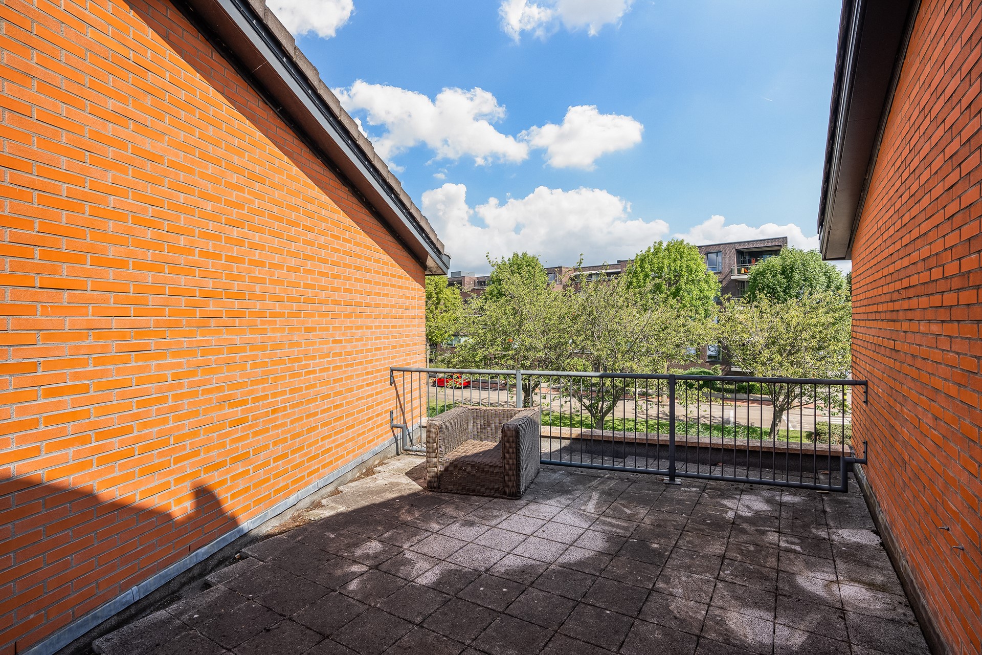 De overloop is ruim opgezet met een zwevend toilet, hoge raampartijen en toegang tot het eerste dakterras. Aan de achterzijde bevinden zich twee slaapkamersmet directe toegang tot het terras. Aan de voorzijde ligt een derde slaapkamer met openslaande deuren naar een sfeervol Frans balkon.