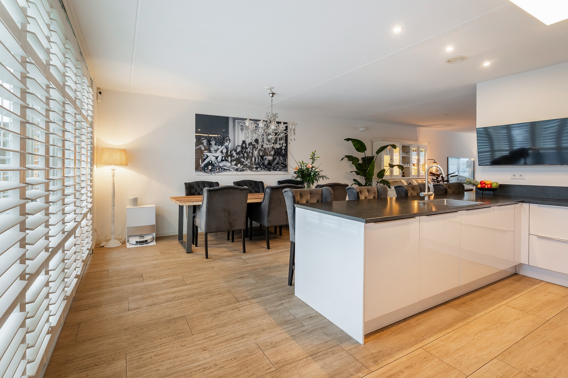 Aan de tuinzijde bevindt zich het eetgedeelte, centraal gesitueerd met grote raampartijen en openslaande deuren naar de tuin. Ook hier zorgen de shutters voor een luxe en rustige uitstraling.