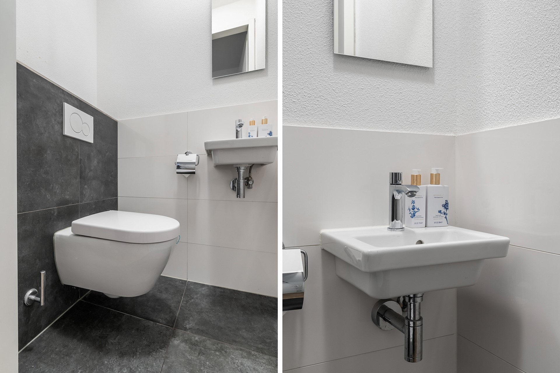 Via de eigen oprit bereikt u de verzorgde entree aan de zijkant van de woning. De nette hal geeft toegang tot de meterkast, de moderne toiletruimte, de trap naar de eerste verdieping met praktische trapkast en de royale leefruimte. De toiletruimte is stijlvol uitgevoerd in wit en antraciet en voorzien van een wandcloset en fonteintje.
