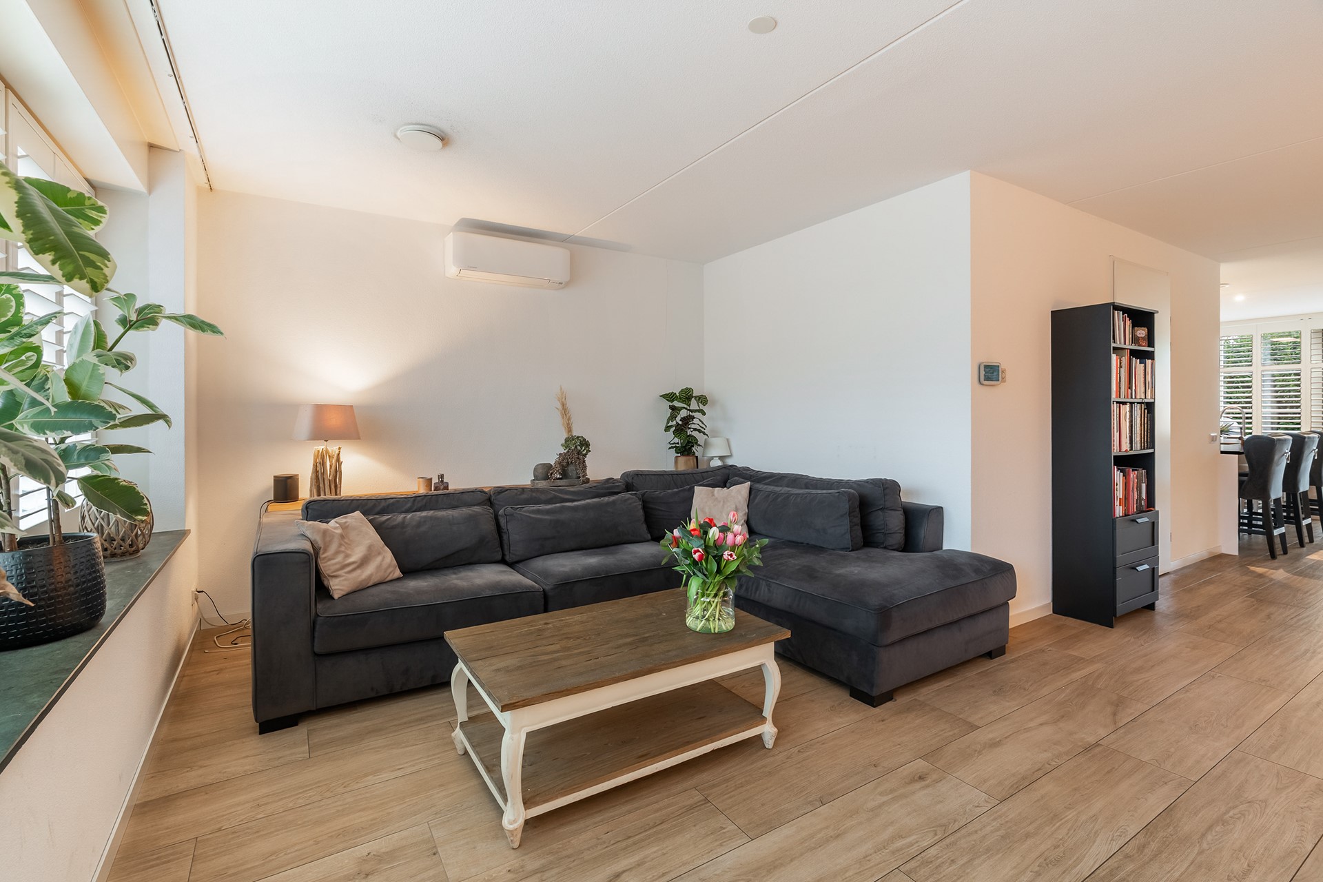 De woonkamer is gelegen aan de straatzijde en kenmerkt zich door de grote raampartij met shutters, wat zorgt voor een prachtige lichtinval en een sfeervolle uitstraling. Dankzij de aanwezige airconditioning is het hier in alle seizoenen comfortabel verblijven.