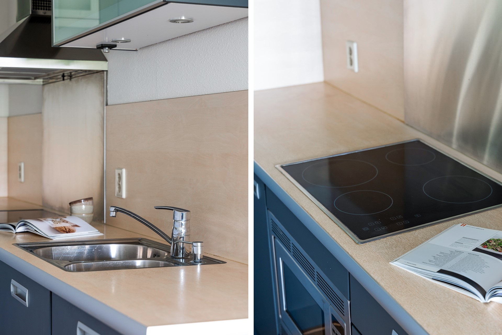 De halfopen keuken grenst aan de woonkamer en is modern afgewerkt in een hoekopstelling. De keuken is voorzien van complete inbouwapparatuur: een koel-/vriescombinatie, vaatwasser, 4-pits keramische kookplaat, combi-magnetron en voldoende kastruimte.