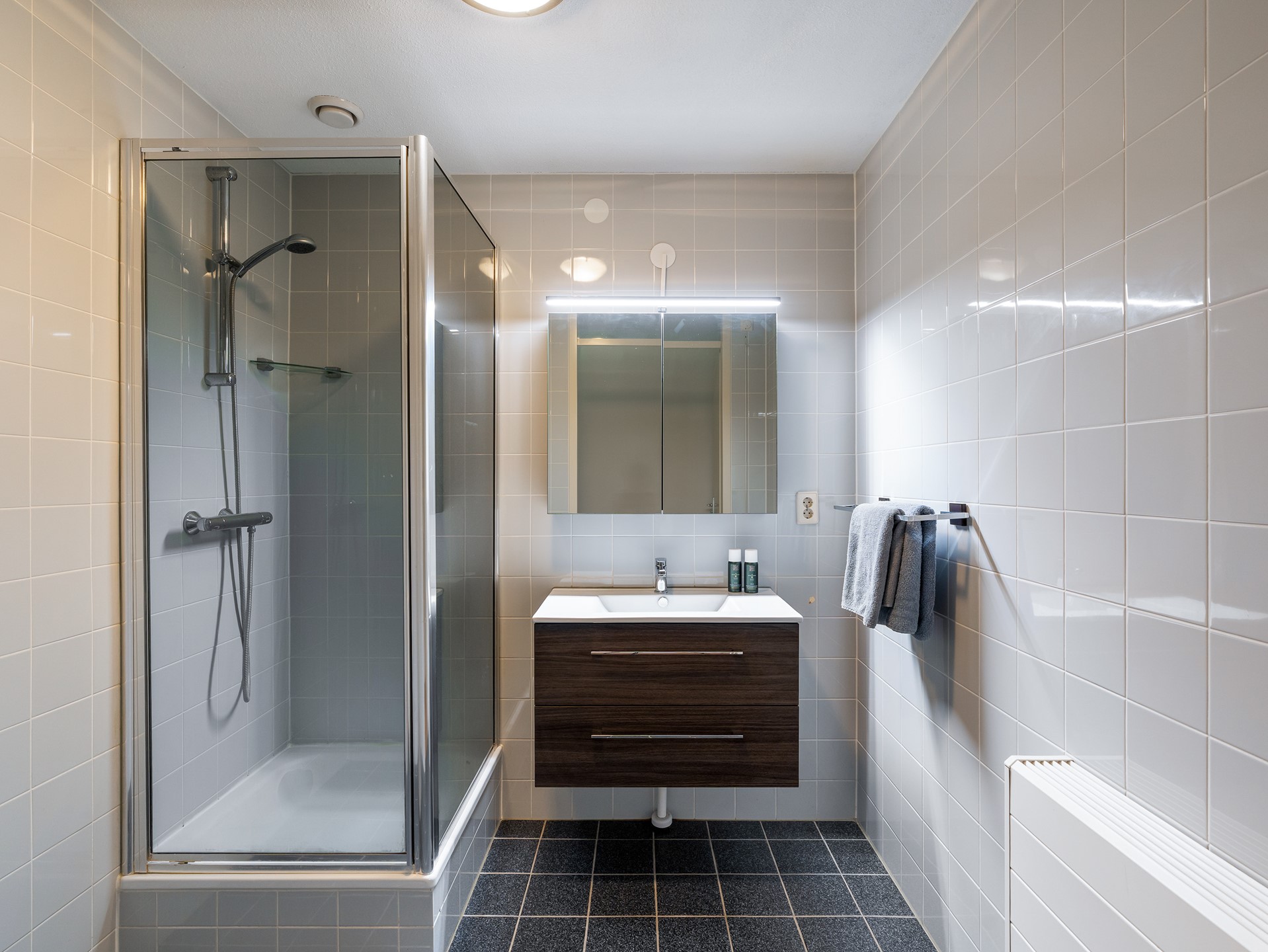 U betreedt het appartement via een ruime entreehal die toegang biedt tot alle vertrekken. Aan de voorzijde bevindt zich de slaapkamer, voorzien van een groot raam met veel lichtinval en een handige inbouwkast. In de hal vindt u verder een meterkast, een aparte CV-kast en de badkamer, compleet betegeld en ingericht met een douchecabine en wastafelmeubel.