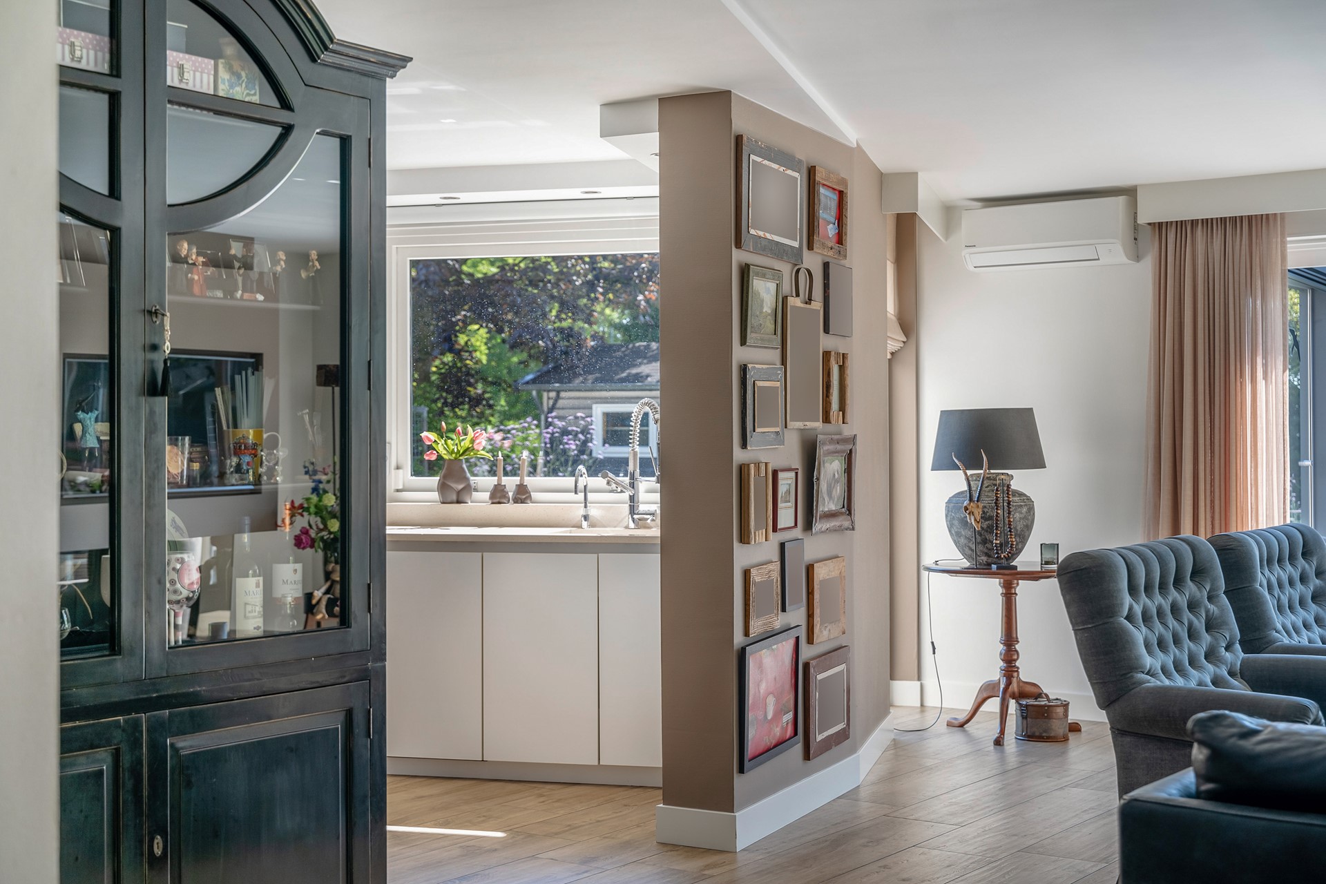 Bij binnenkomst treft u een ruime hal met de trapopgang naar de eerste verdieping en een toilet met fonteintje. Vanuit de hal bereikt u de lichte woonkamer, voorzien van grote raampartijen die zorgen voor veel natuurlijk licht en een prachtig uitzicht op de groene omgeving. De woonkamer beschikt over een sfeervolle gashaard, ingebouwde TV en airconditioning. Via de schuifpui heeft u directe toegang tot de zonnige achtertuin.