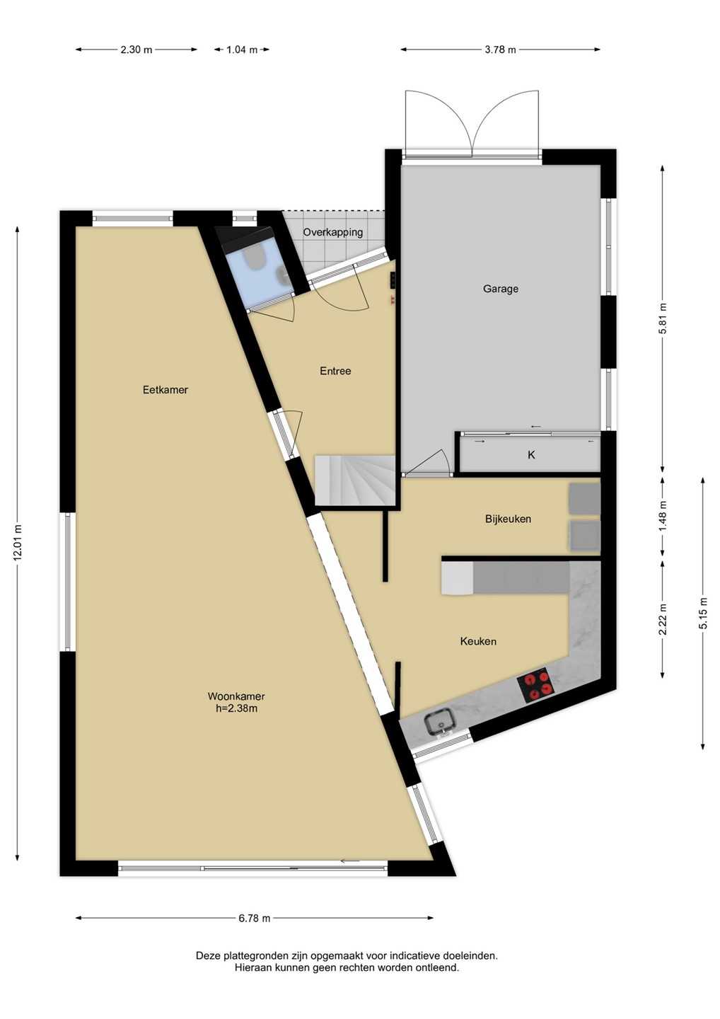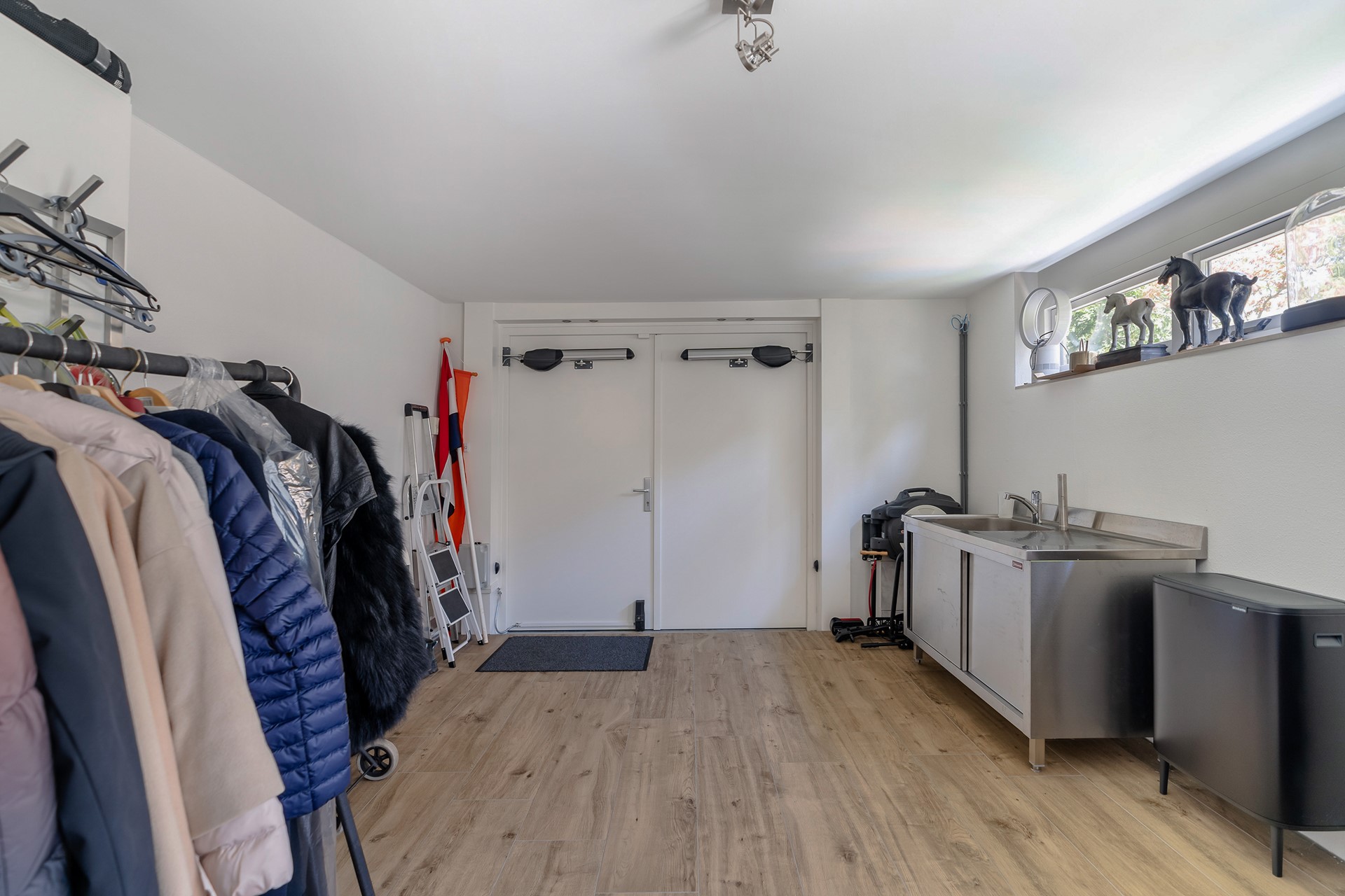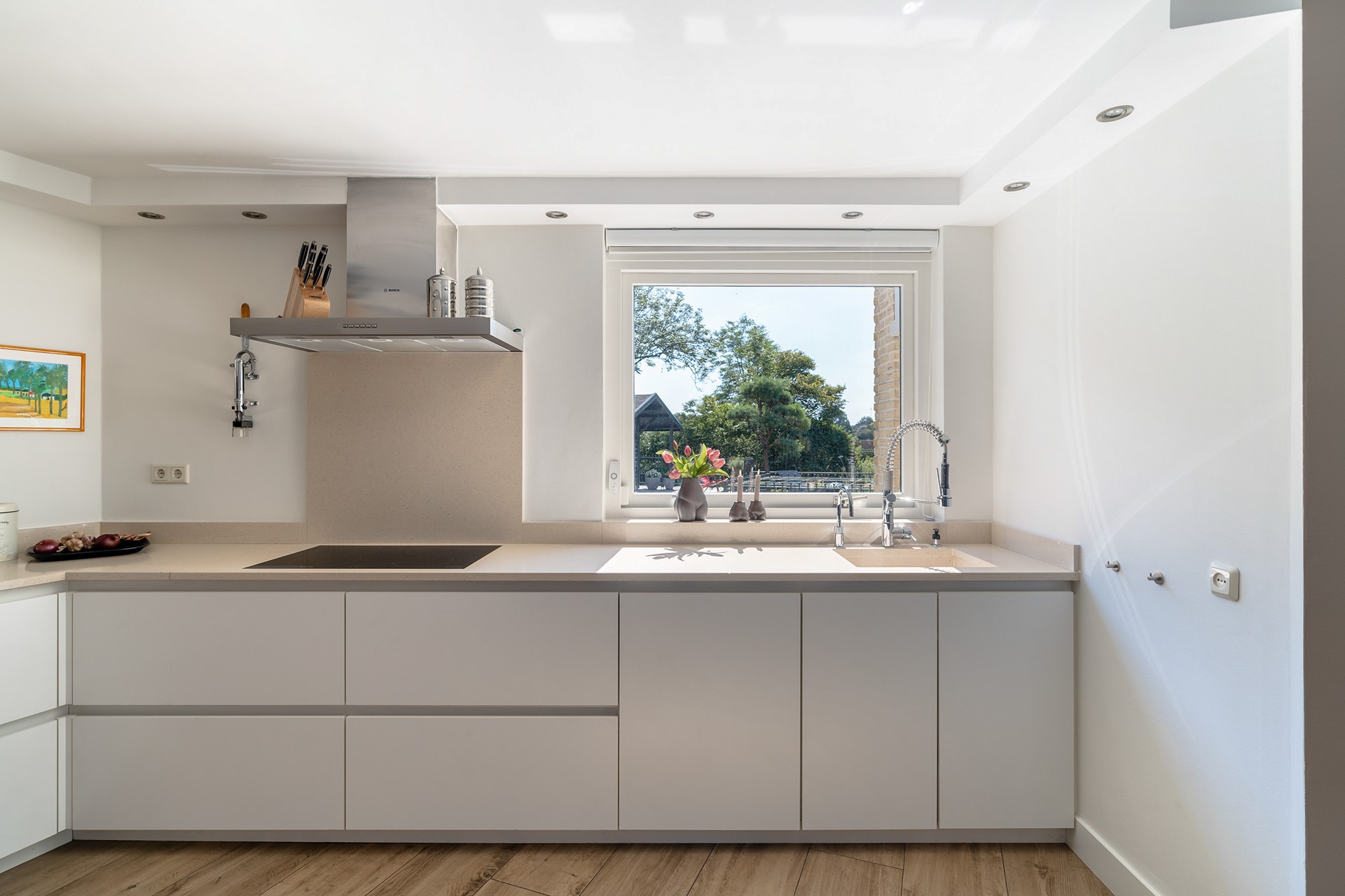 De open keuken is praktisch ingericht en voorzien van diverse inbouwapparatuur. Aangrenzend bevindt zich een bijkeuken met wasmachine- en drogeraansluiting en extra bergruimte. Vanuit de bijkeuken is de garage bereikbaar.
