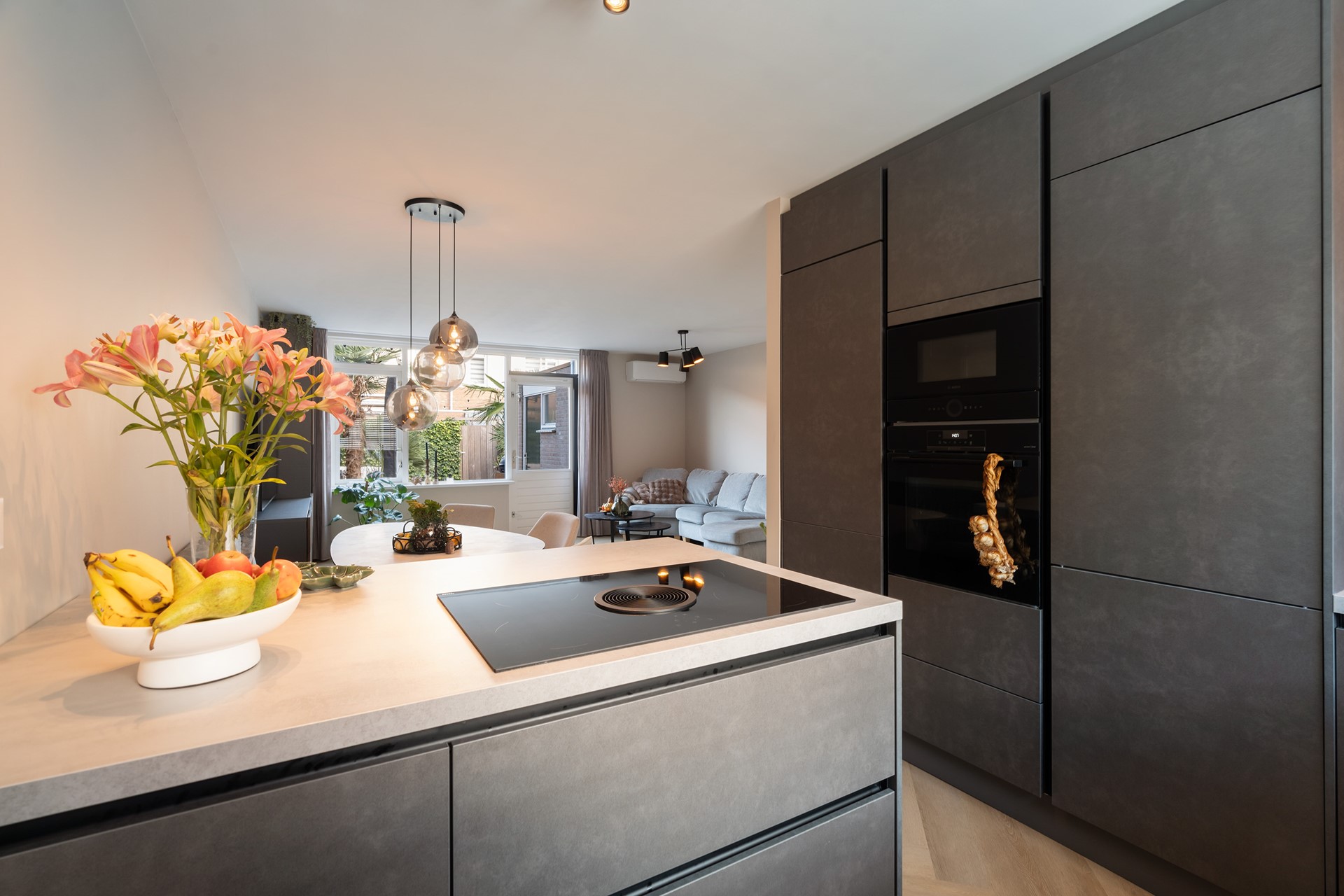 De halfopen keuken is modern ingericht en uitgerust met diverse inbouwapparatuur, waaronder een oven, inductiekookplaat met geïntegreerde afzuiging, vaatwasser en Quooker.