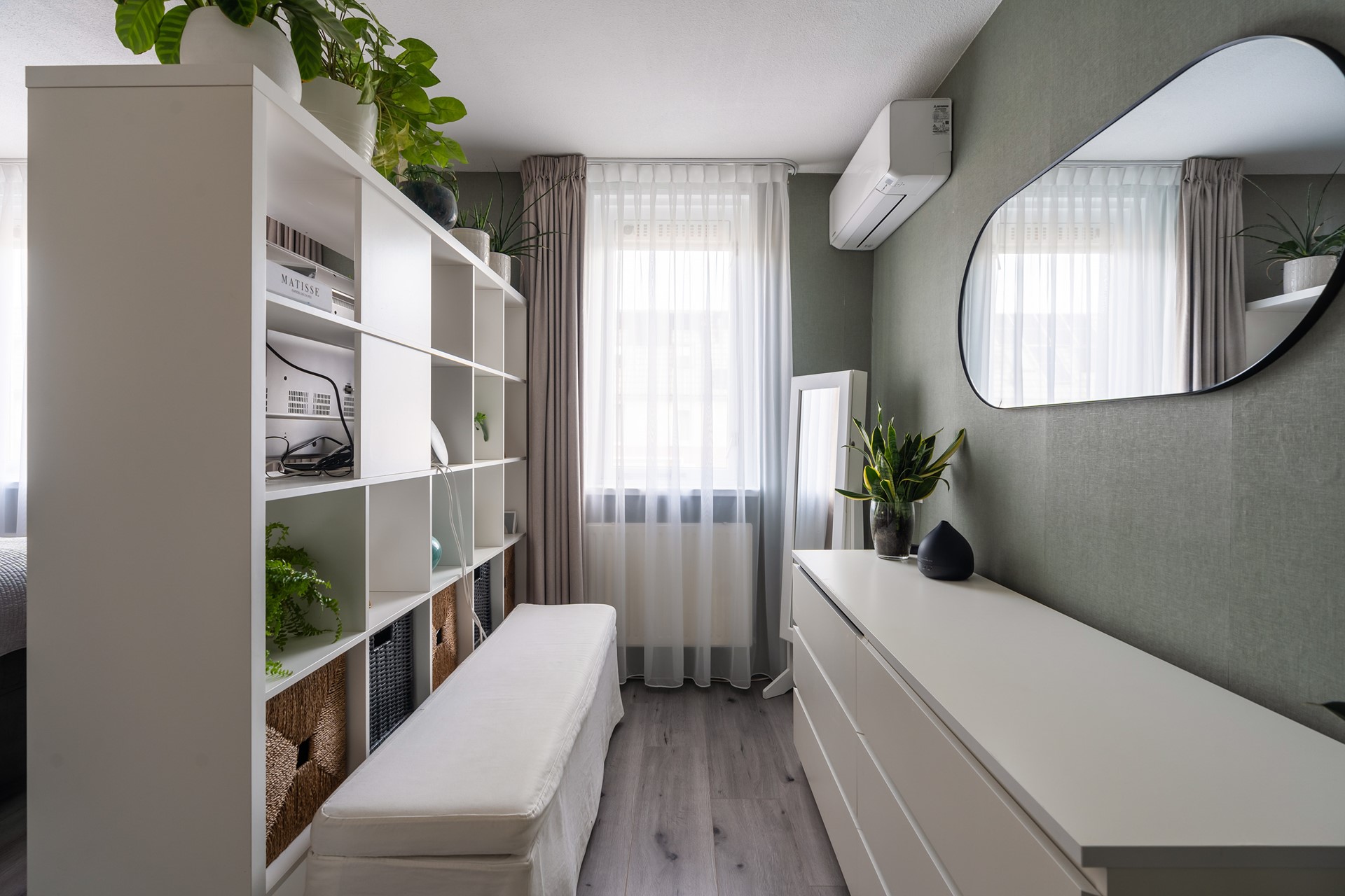 De hoofdslaapkamer is royaal en voorzien van een praktische schuifwandkast en airconditioning.