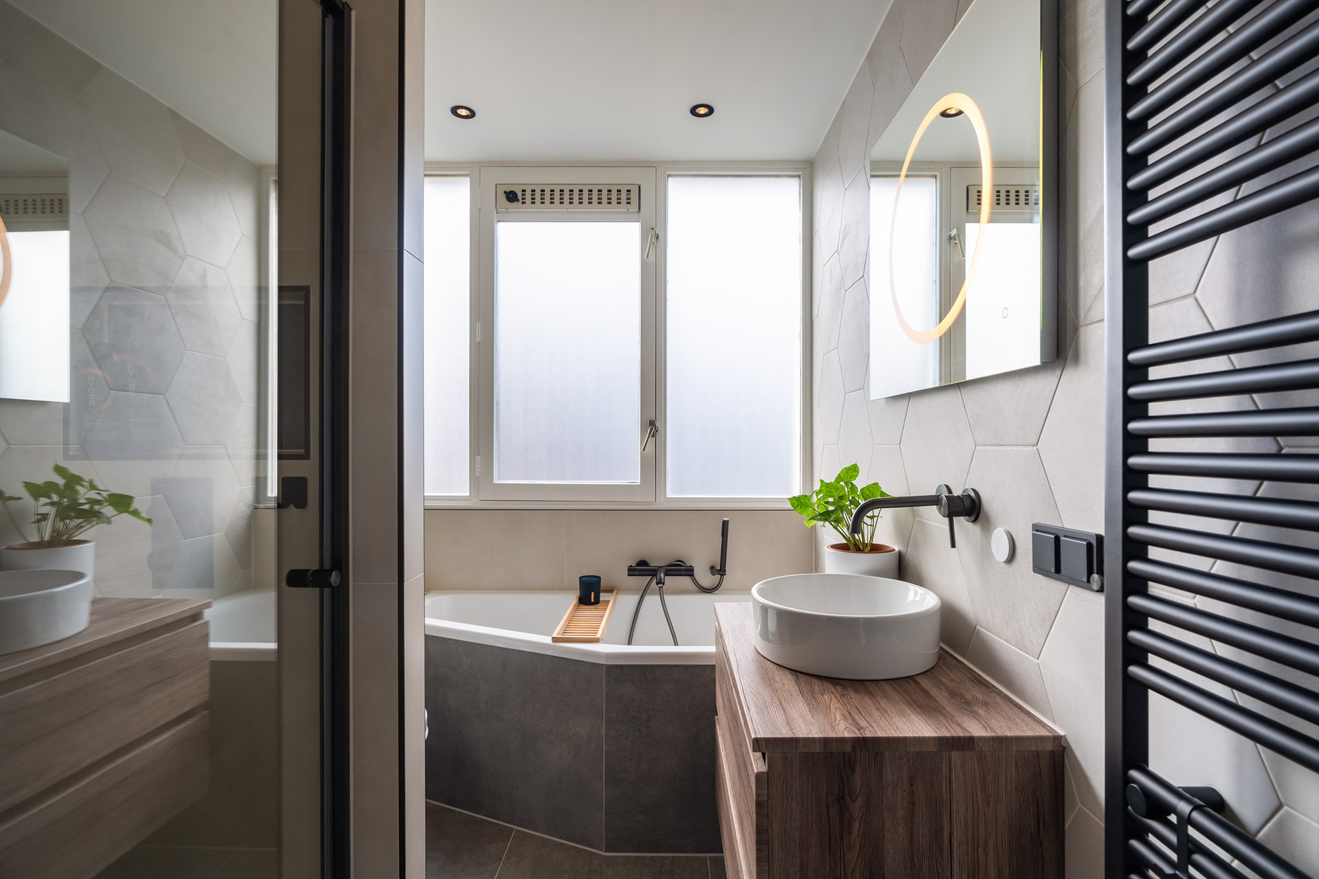 De badkamer heeft een moderne uitstraling en is uitgerust met een douche, wastafelmeubel, tweede toilet, designradiator, vloerverwarming en stijlvolle betegeling.