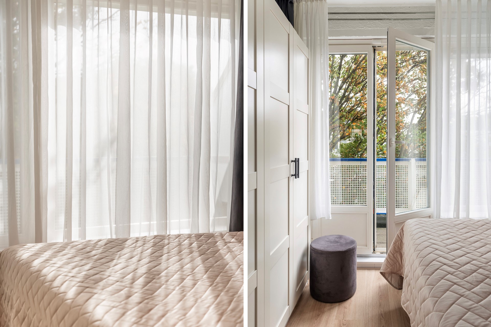 Via een doorgang vanuit de woonkamer is de slaapkamer bereikbaar, die eveneens toegang geeft tot het woning brede balkon via fraaie openslaande deuren.