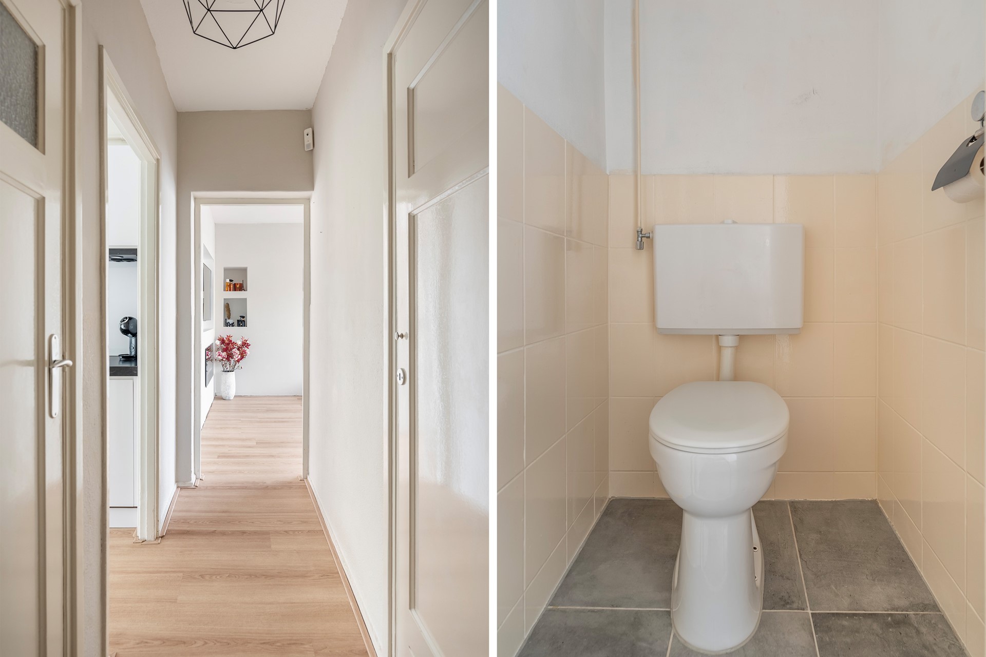 Via het verzorgde trappenhuis bereik je de topverdieping. Bij binnenkomst in de woning kom je in de hal die toegang biedt tot het toilet, de woonkamer, meterkast en keuken. De toiletruimte is half betegeld en voorzien van een closet.