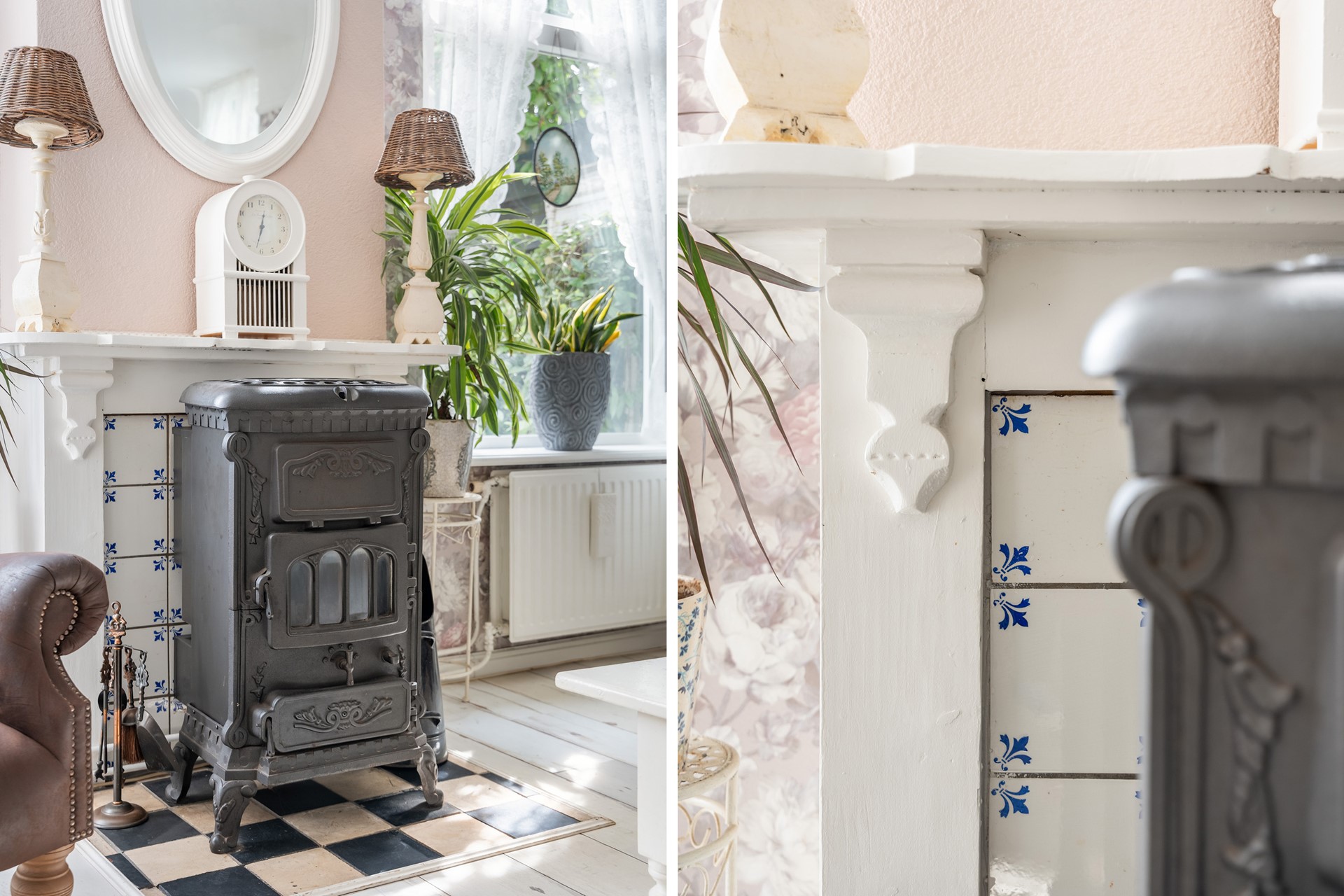 De woonkamer straalt warmte en gezelligheid uit. De wanden zijn grotendeels voorzien van behang, terwijl het bovenste gedeelte en het plafond strak zijn gestuct. Een echte blikvanger is de authentieke gaskachel met schouw, geplaatst op een zwart-wit tegelvloertje met daarachter mooie Delftsblauwe tegels. De laminaatvloer geeft de ruimte een verzorgde uitstraling. Vanuit de woonkamer loop je via het eetgedeelte een sfeervolle toog door naar de keuken.
