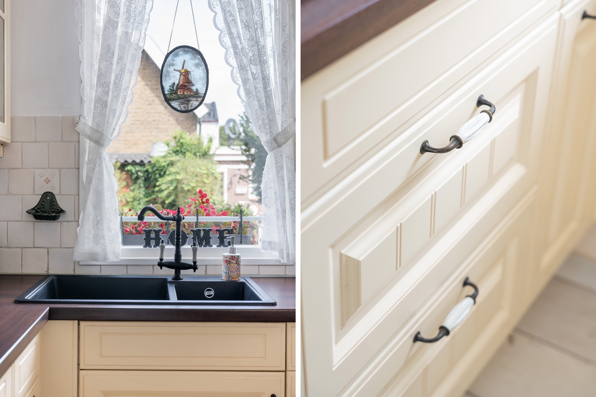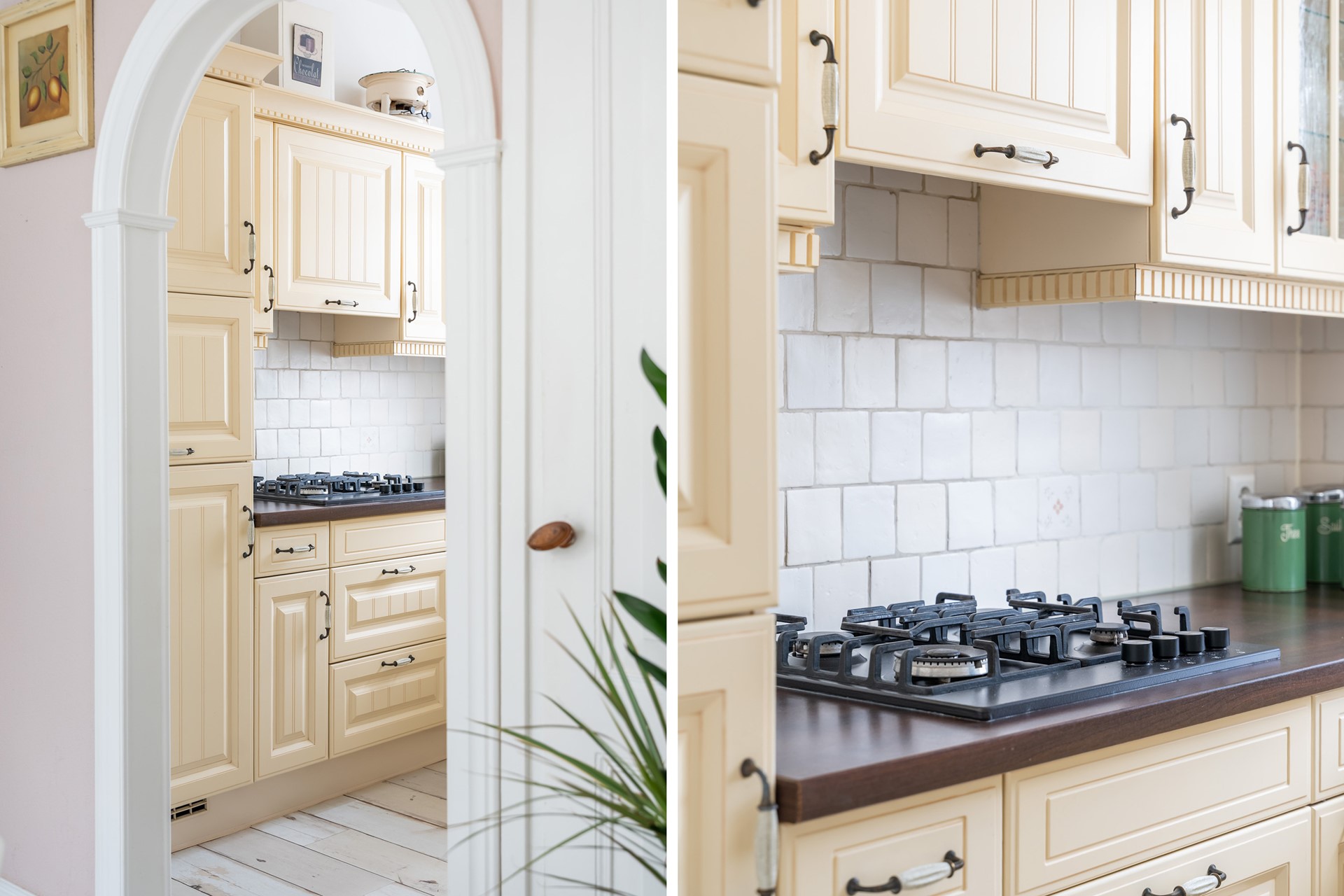 De landelijke keuken is opgesteld in een praktische L-vorm en uitgevoerd in een lichte tint met een donker houtlook werkblad. De achterwand is betegeld met witte tegeltjes en de keuken is voorzien van diverse inbouwapparatuur zoals; een koelkast en een 4 pits gasfornuis met afzuigkap. De 1,5e spoelbak uitgevoerd in zwart maakt het geheel netjes af.