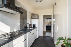 Via een doorgang bereik je de keuken, die is opgesteld in een nette, lichte wandopstelling. De keuken is voorzien van diverse inbouwapparatuur, waaronder een 4-pits gasfornuis met daarboven een matzwarte afzuigkap en een spoelbak met een design mengkraan. Daarnaast is er voldoende ruimte voor losse apparatuur, zoals een koel-/vriescombinatie met bijvoorbeeld een magnetron. De keuken is afgewerkt met een praktische tegelvloer en volledig betegelde wanden. Vanuit hier heb je toegang tot het prettig gelegen balkon. Tevens bereik je via de keuken de badkamer.