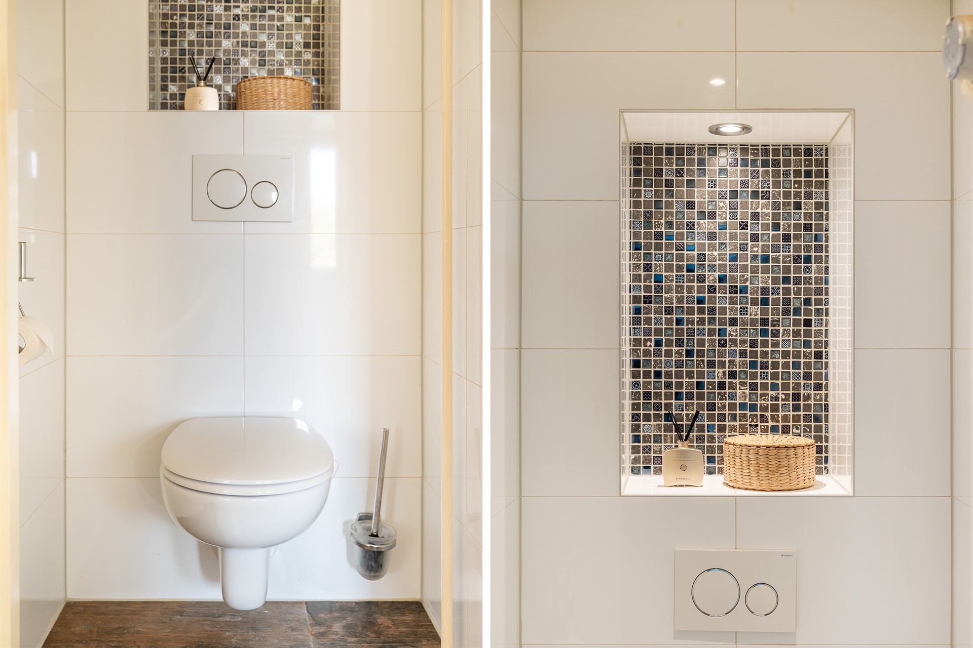 De toiletruimte is volledig betegeld en uitgevoerd met een wandcloset. Een fraaie nis zorgt voor een speels detail en biedt ruimte voor accessoires.
