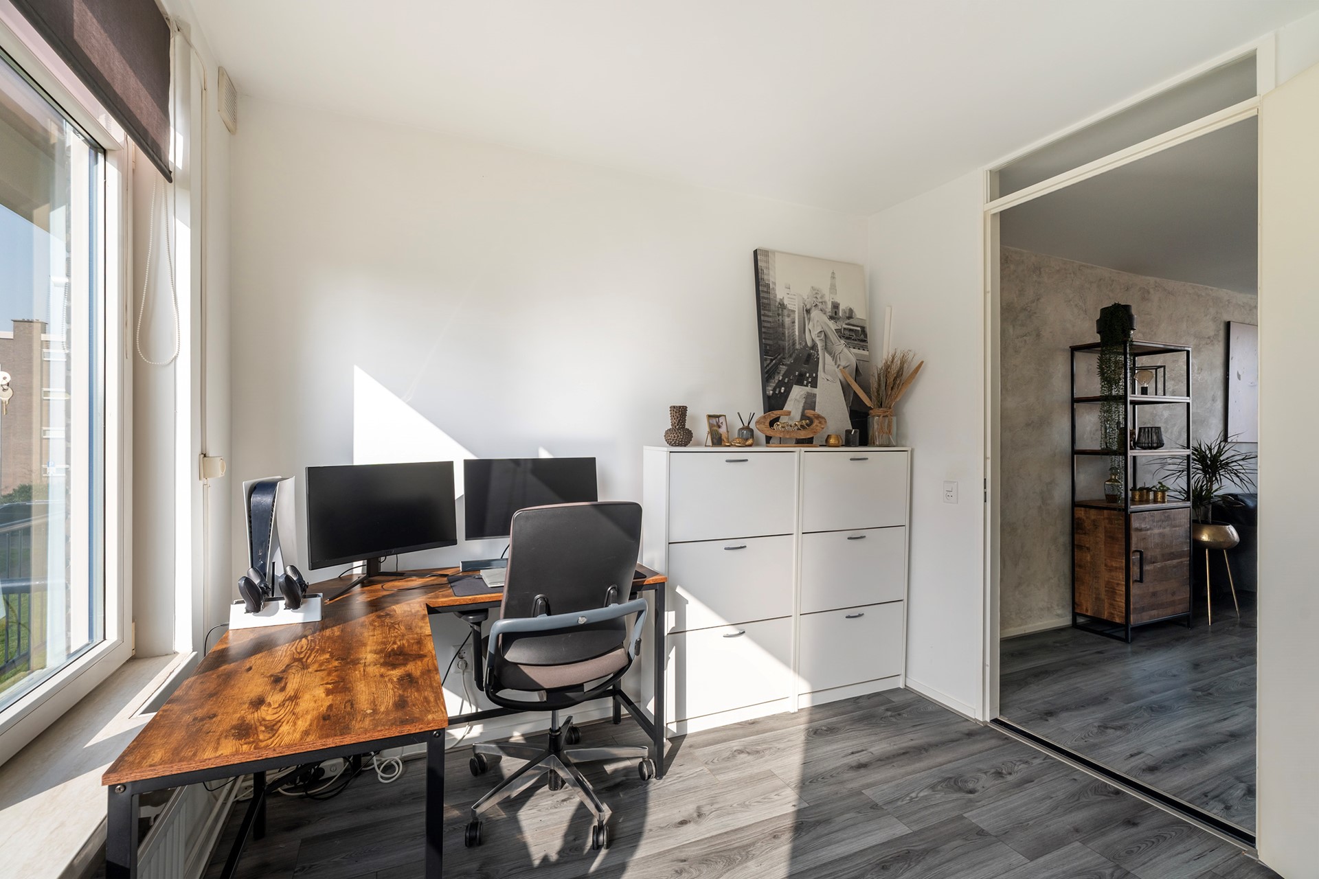 Het gehele appartement is, met uitzondering van de badkamer en het toilet, voorzien van een stijlvolle grijze laminaatvloer.