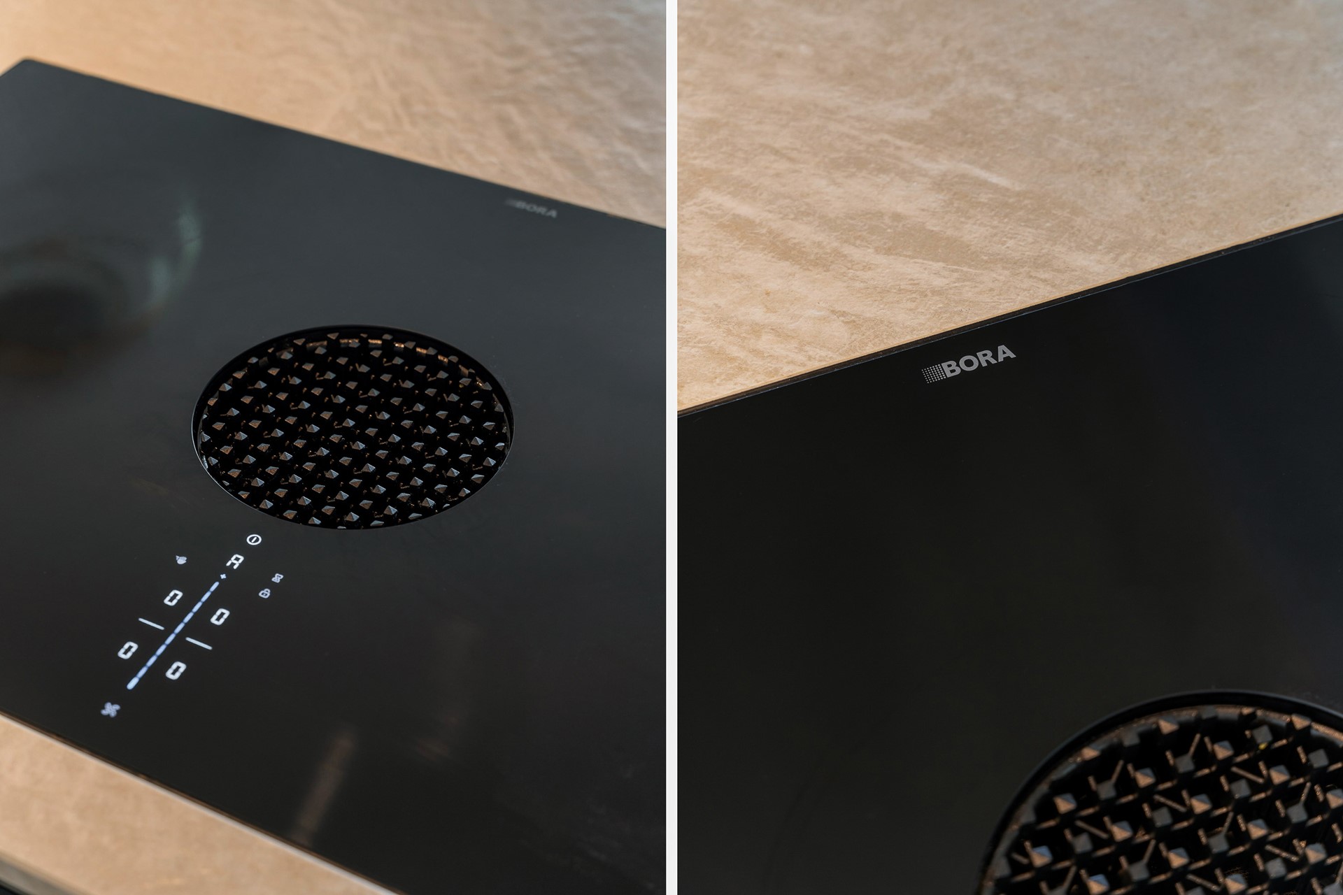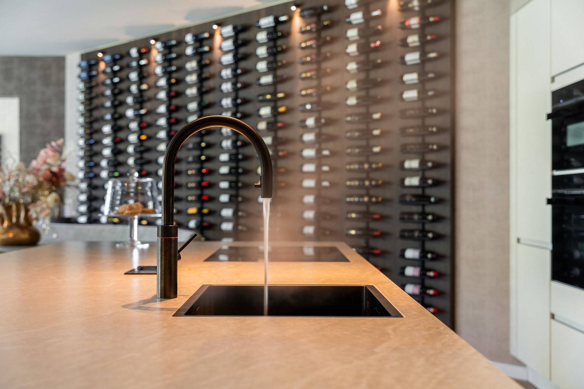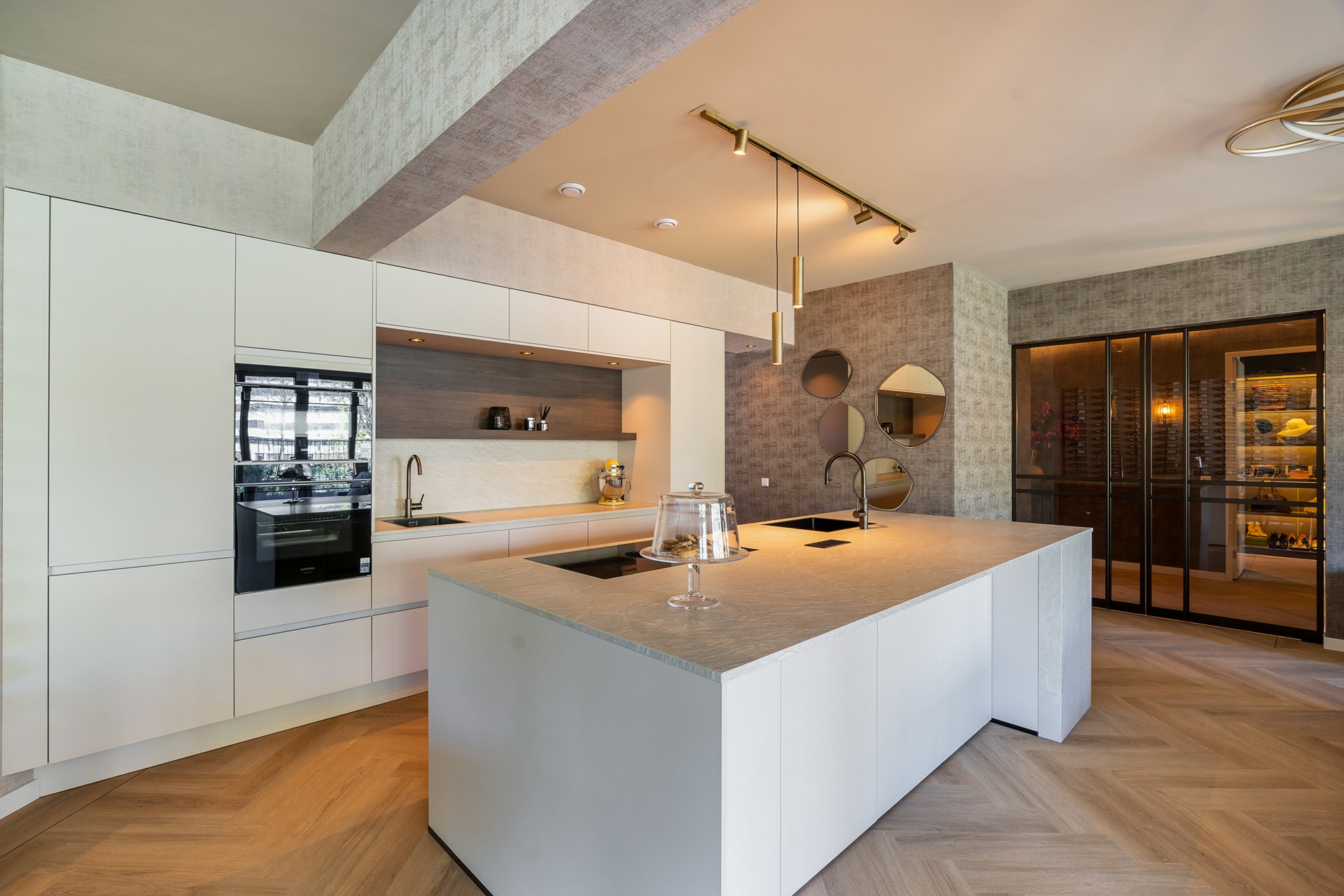 De moderne open keuken is een droom voor iedere kookliefhebber: strak vormgegeven met topklasse “Siemens Topline” inbouwapparatuur en een stijlvolle afwerking. Het eiland geeft ruimte aan een in “Gun Metal” uitgevoerde spoelbak en “Quooker” kraan met extra functie voor bruisend water, een vaatwasser, een dubbele wijnklimaatkast van het merk ”Wine&Klima” en een “Bora” inductiekookplaat met geïntegreerde afzuiging. Aan de overzijde vinden we een stijlvolle koffiebar met aan weerszijden plaats voor de koelkast en kastruimte. De gehele keuken is uitgevoerd in een lichte crème kleur waar je geen vingers op ziet. De eveneens lichte “Dekton” werkbladen en achterwand stralen stijl en stevigheid uit en zijn zeer gebruiksvriendelijk.
