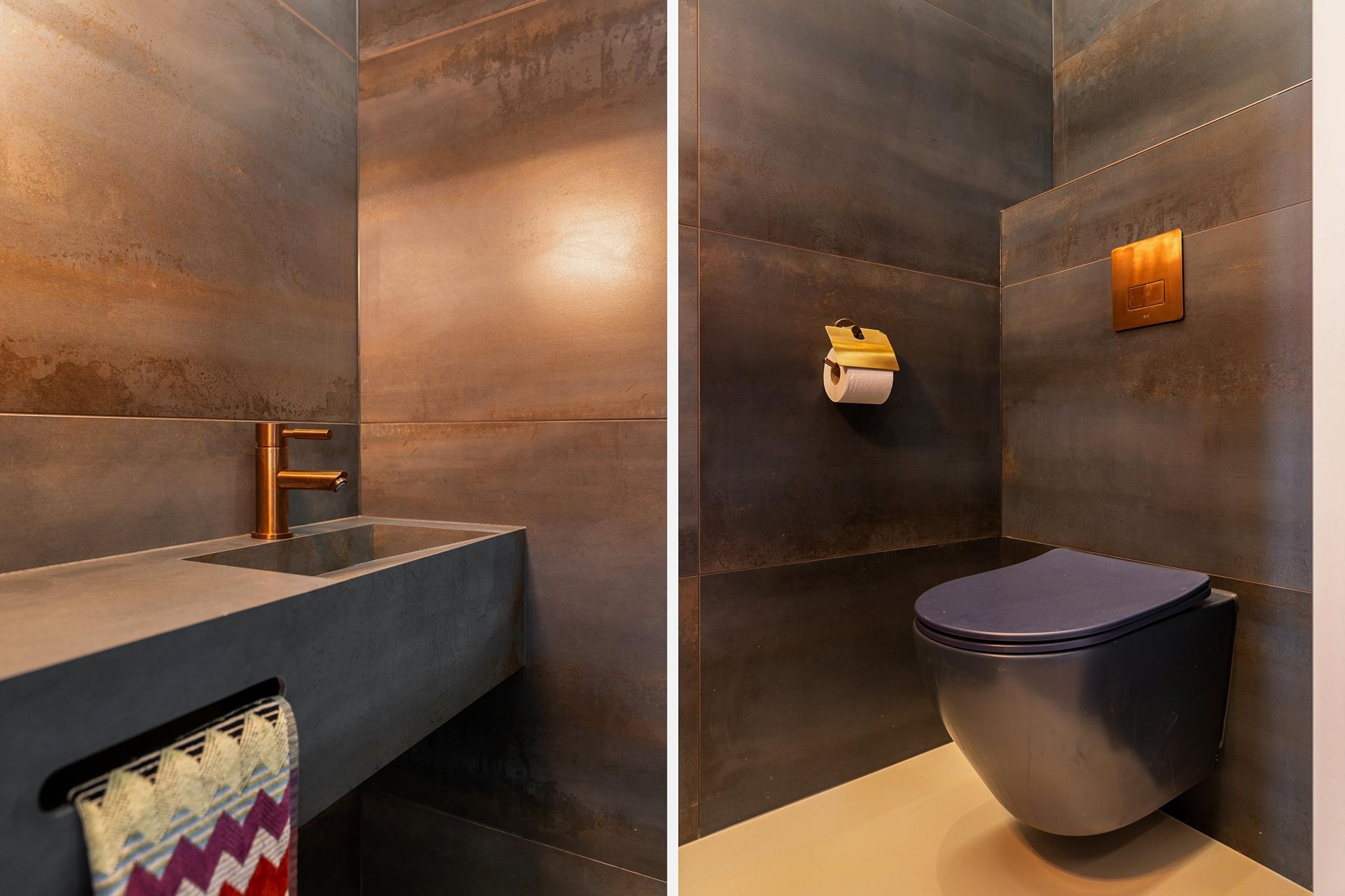 De elegante toiletruimte is voorzien van een uniek donkerblauw wandcloset en een op maat gemaakt wastafelplanchet met een koperkleur kraan.