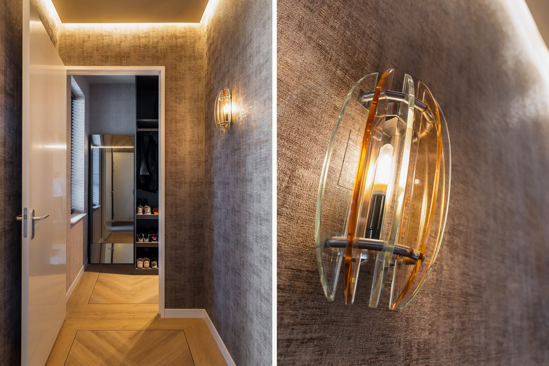 Via het serene binnenhof komen we bij de entree van de woning. De royale en perfect gestileerde hal heeft een verlaagd plafond voorzien van verlichting, een separate garderoberuimte en geeft toegang tot alle vertrekken in het appartement.