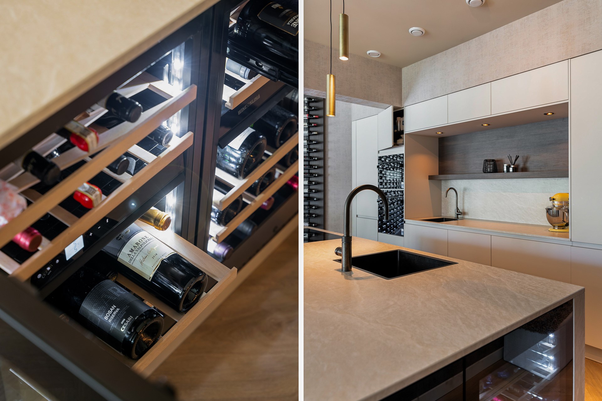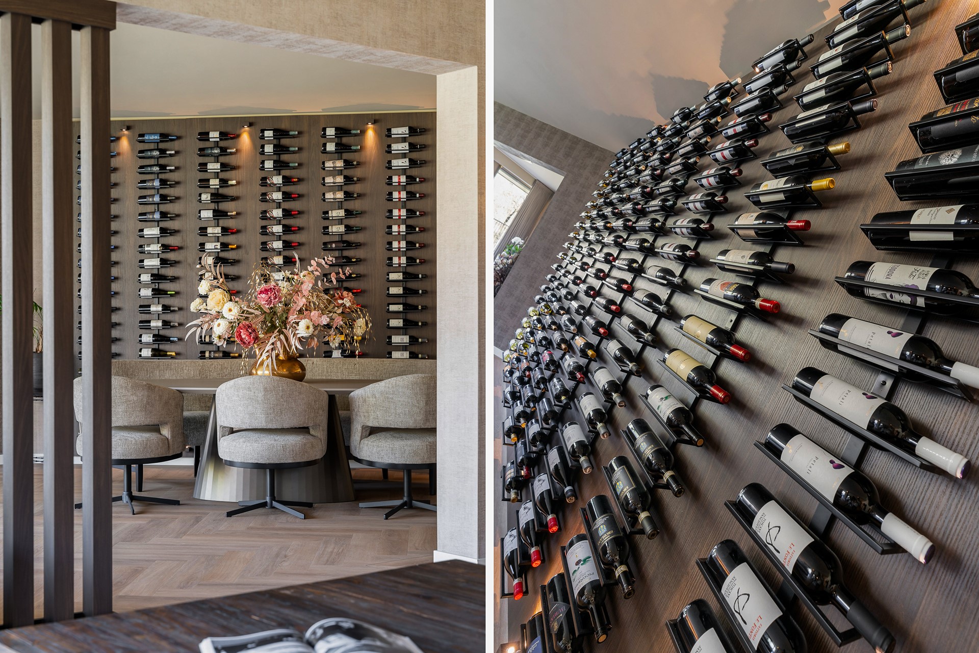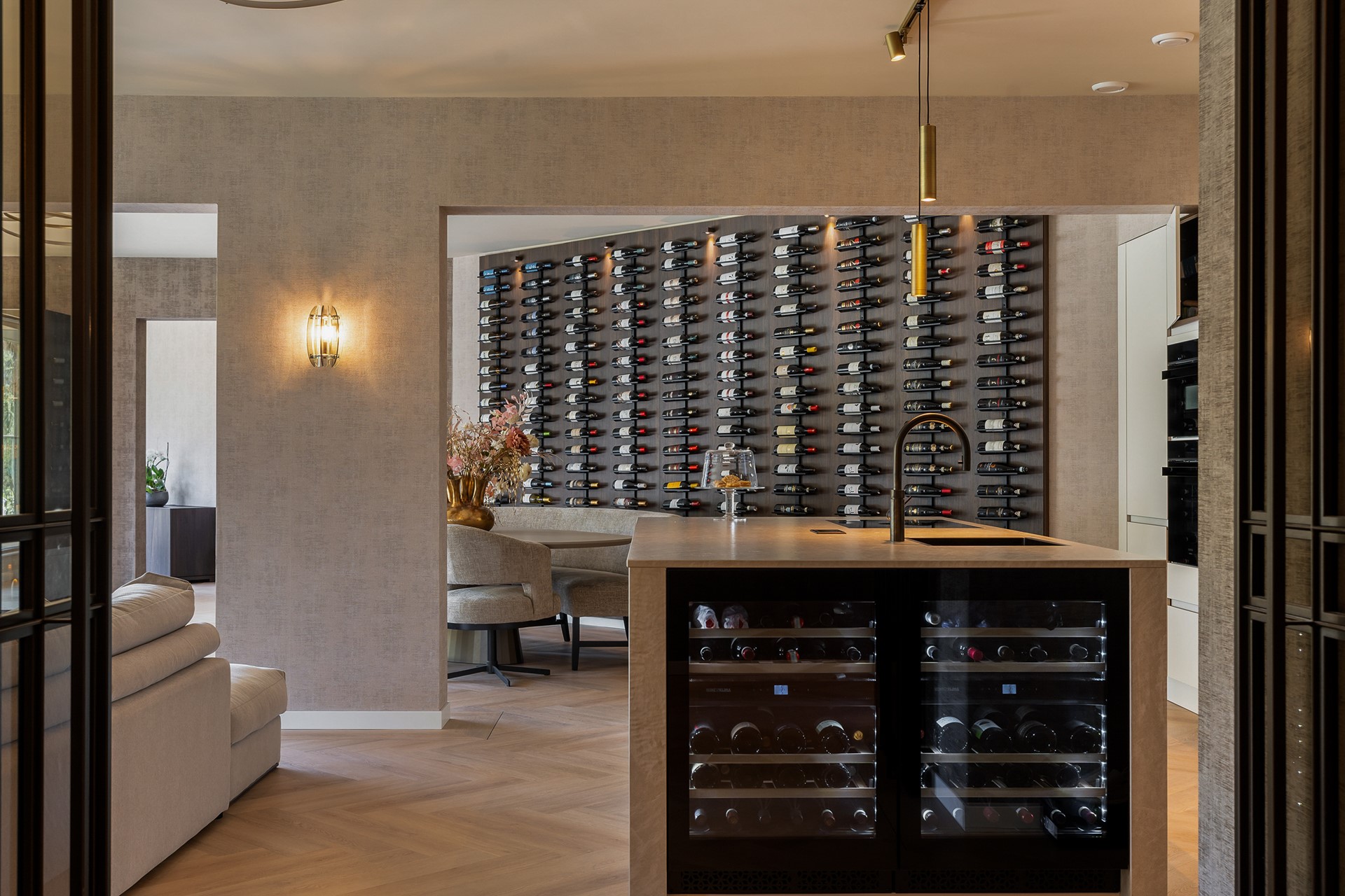 Dé eyecatcher van deze woning is toch wel het eetgedeelte! De achterwand, wederom op maat gemaakt door “Lazzoni”, doet u denken aan dineren in een sterren restaurant. Prachtig gestructureerd komt de uitgebreide collectie aan wijnen hier perfect tot zijn recht! Ideaal voor ontspannen avonden of stijlvolle diners met vrienden of familie.