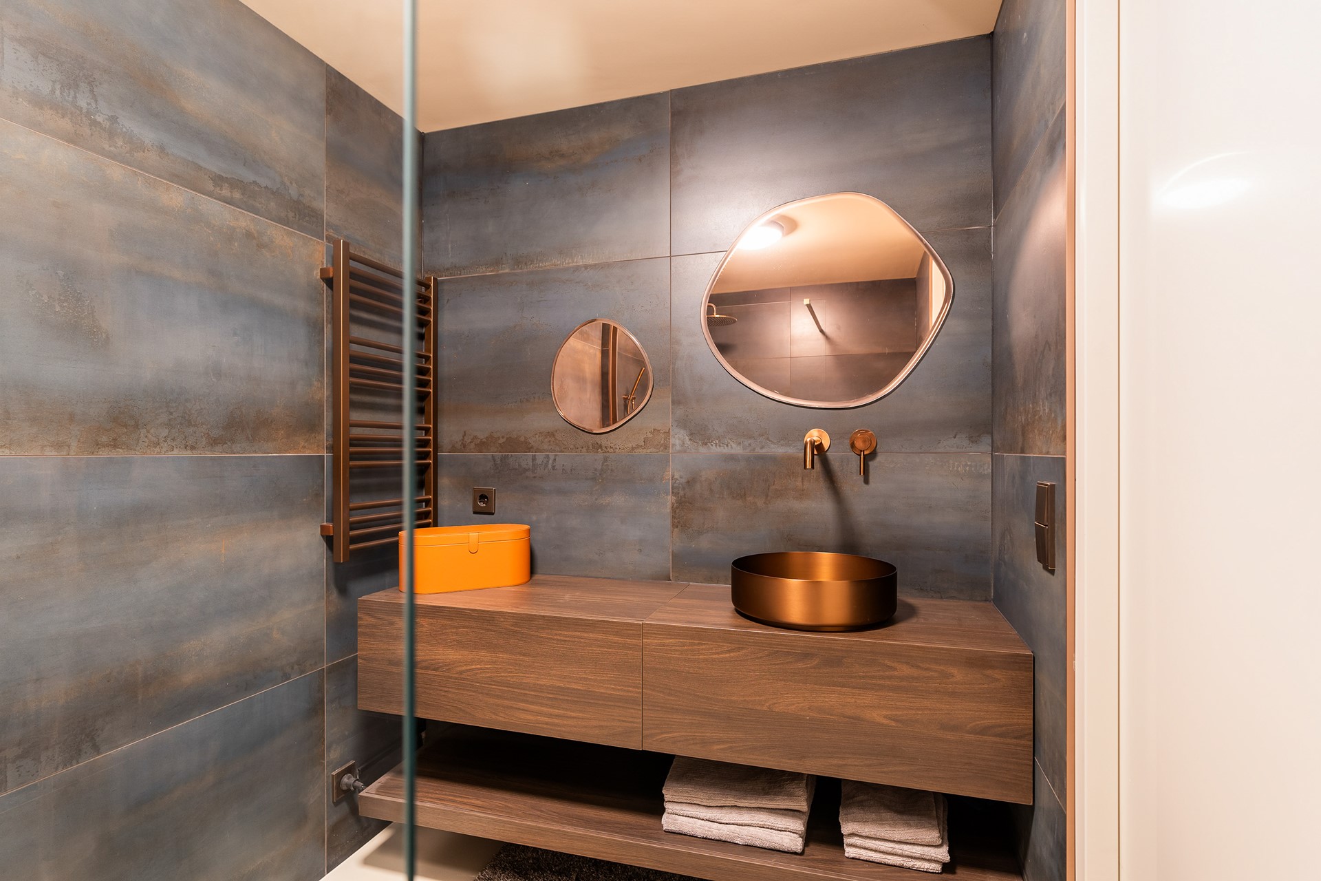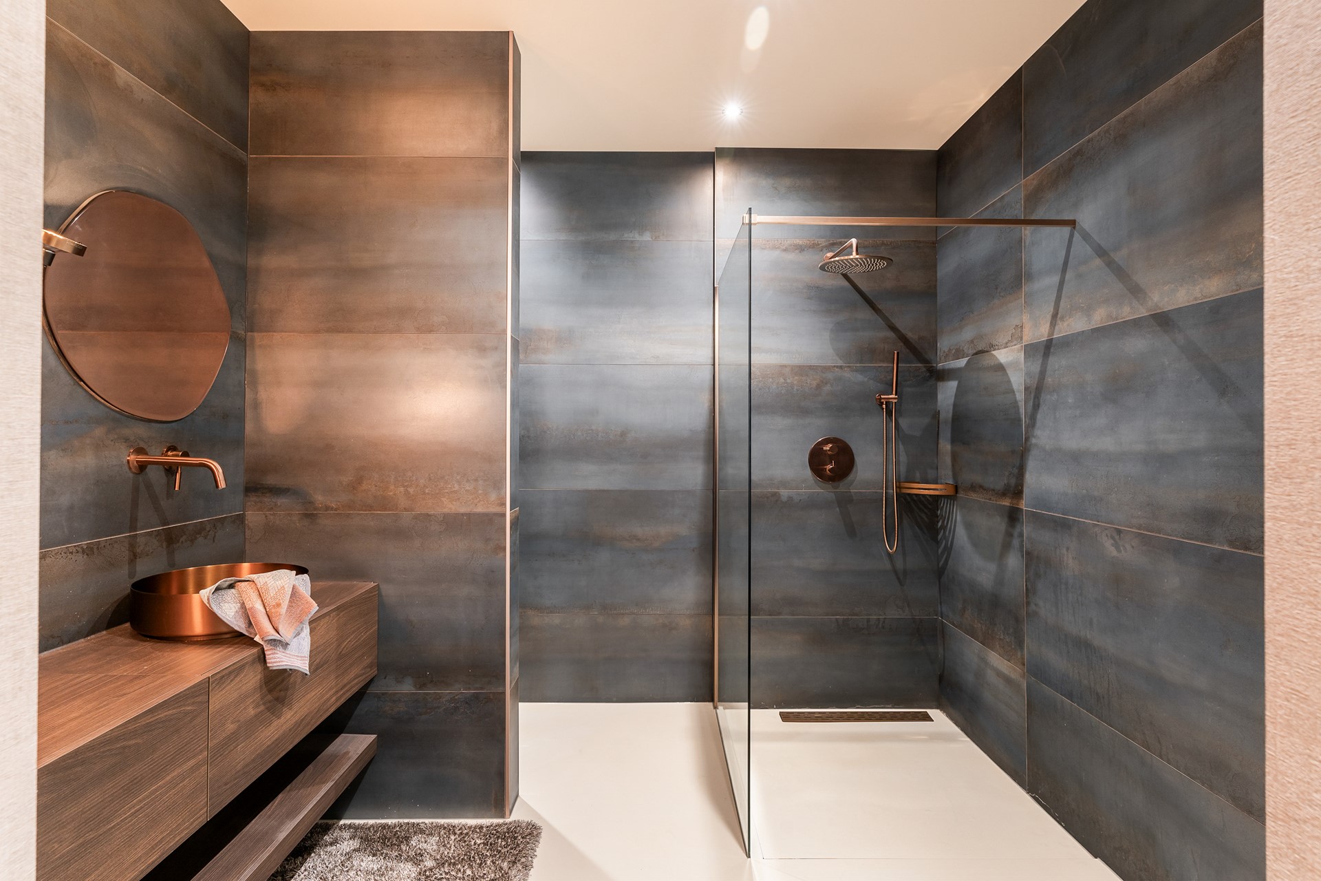 Wat direct in het oog springt, zijn de koperen kranen en accenten – een stijlvolle keuze die de ruimte een warme, luxe gloed geeft evenals de wandclosetten welke zijn uitgevoerd in donkerblauw. De wastafelmeubels zijn strak vormgegeven en op maat vervaardigd uit hoogwaardige materialen, terwijl de royale inloopdouches zijn afgewerkt met helder glas. Ook hier komen de subtiele bronstinten weer terug.