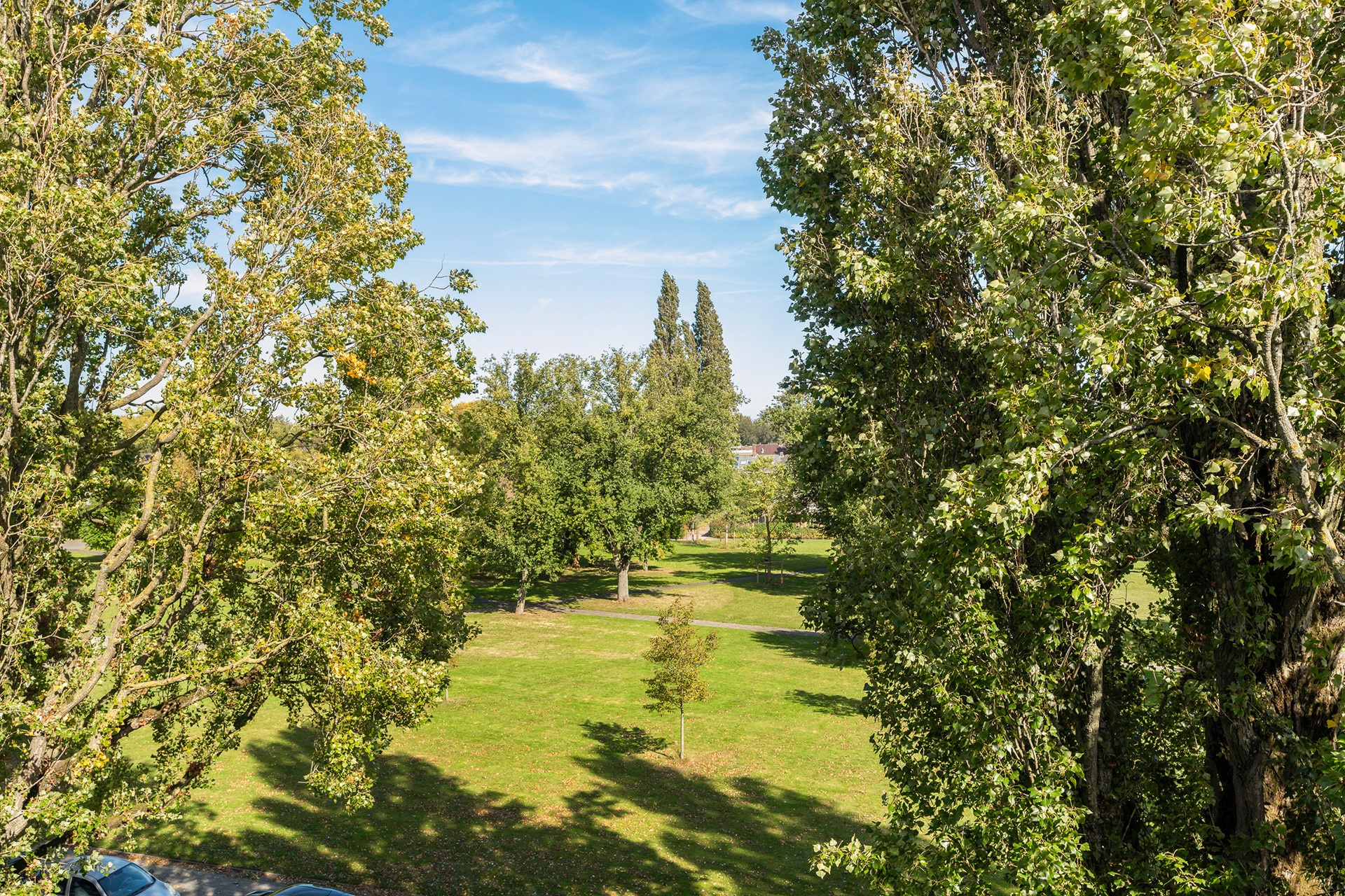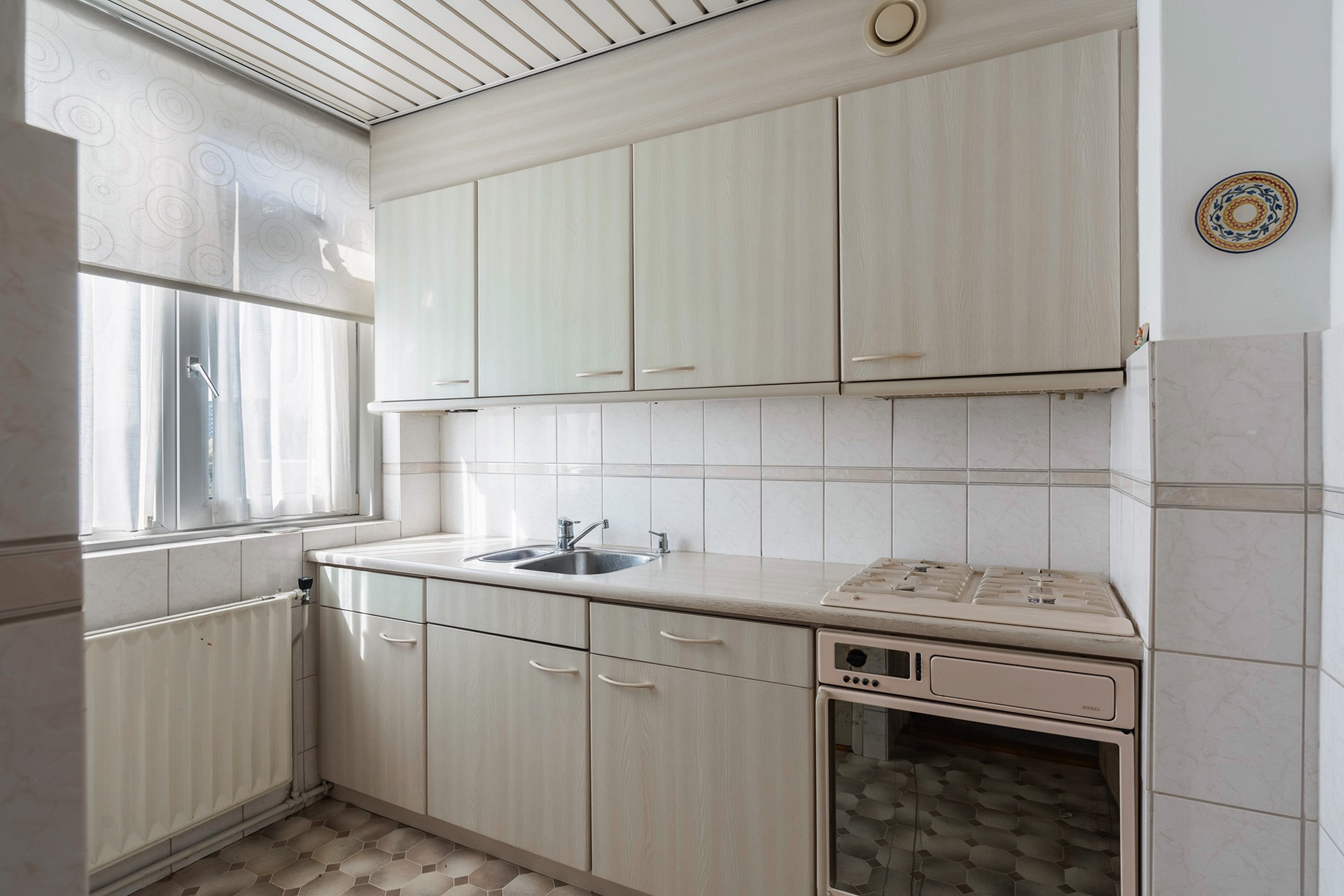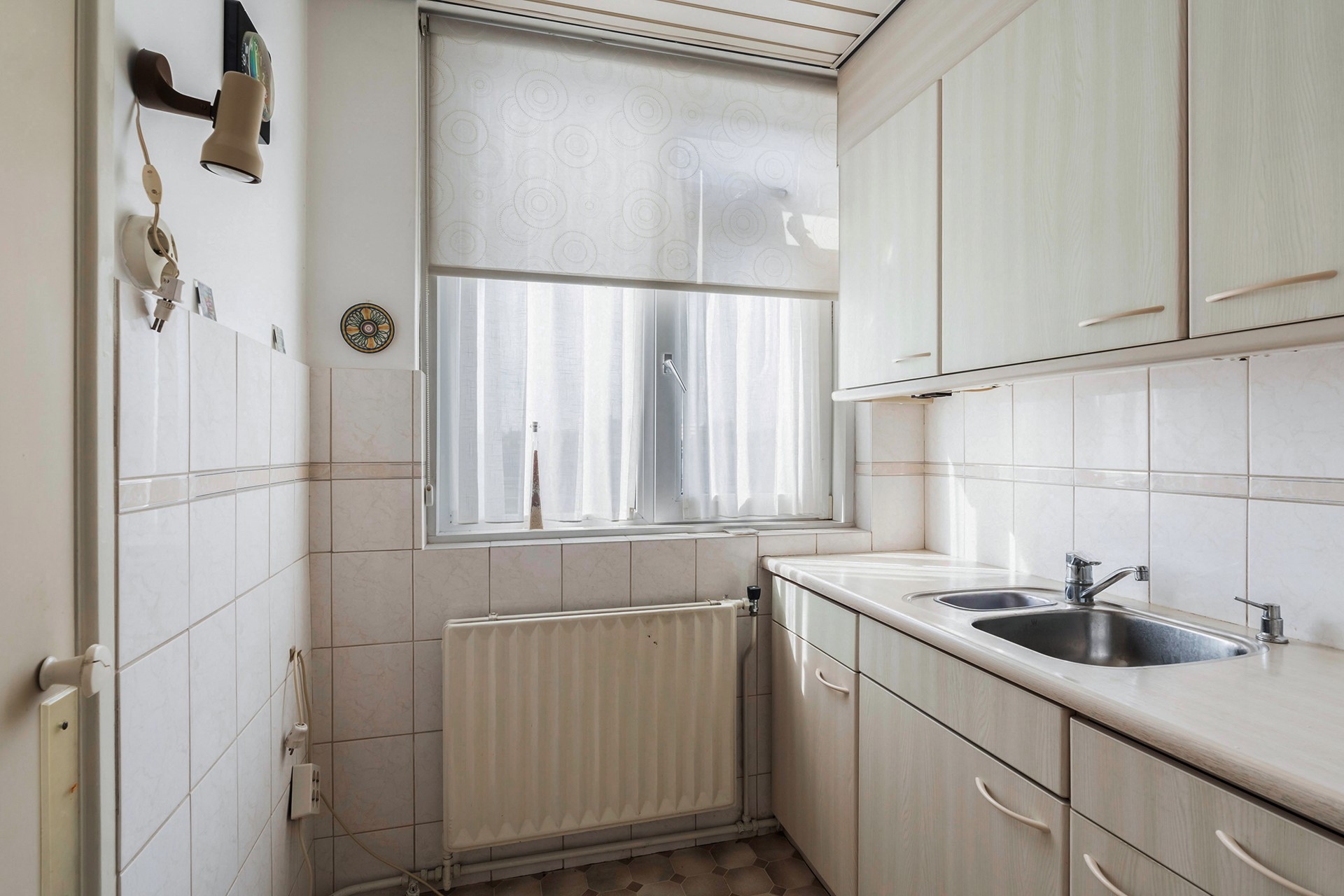 De woonkamer is uitgebroken en daardoor heerlijk ruim, met een vaste kast en maar liefst twee toegangen tot het balkon. Hier kun je genieten van de zon en het uitzicht over de groene omgeving.