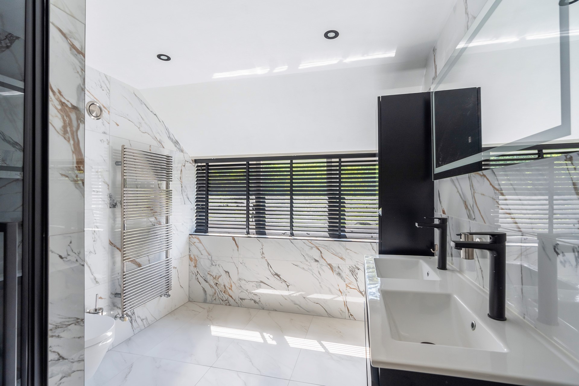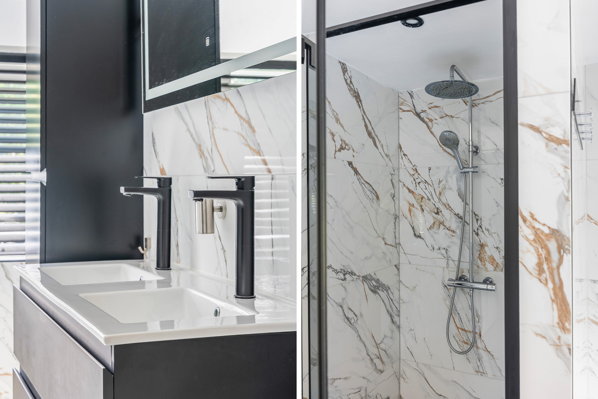 Op de eerste verdieping bevinden zich drie ruime slaapkamers, een balkon en een recent gerenoveerde badkamer met marmeren afwerking, inloopdouche, dubbele wastafel en designradiator.