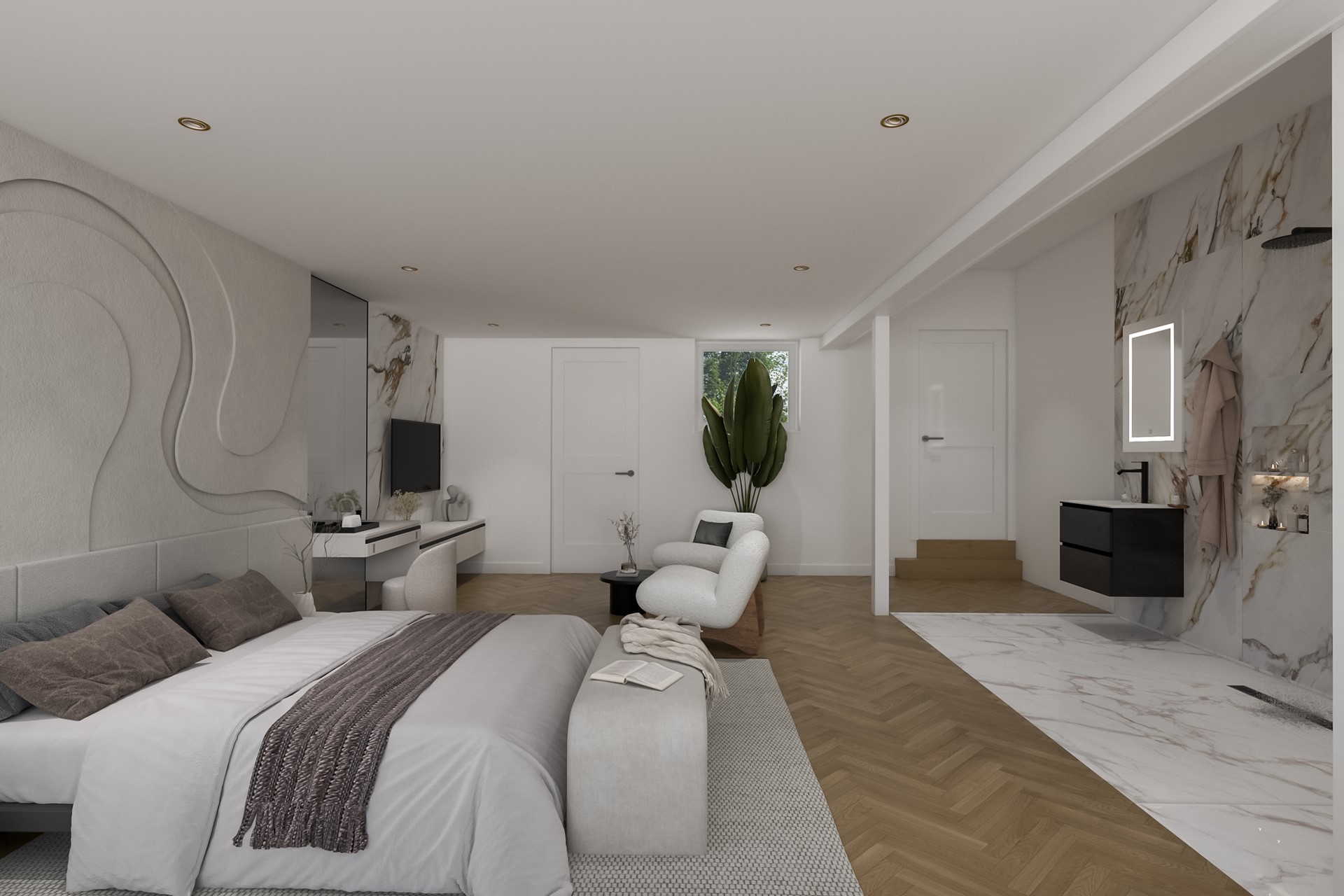 Uniek is bovendien de mogelijkheid om de garage om te bouwen tot een ruime slaapkamer met eigen badkamer – ideaal als gelijkvloerse woonruimte of klein appartement aan huis.