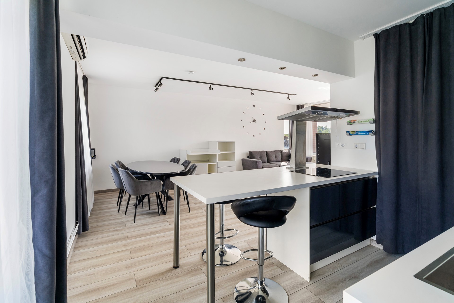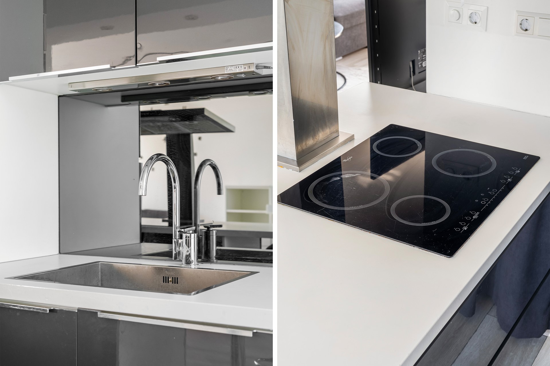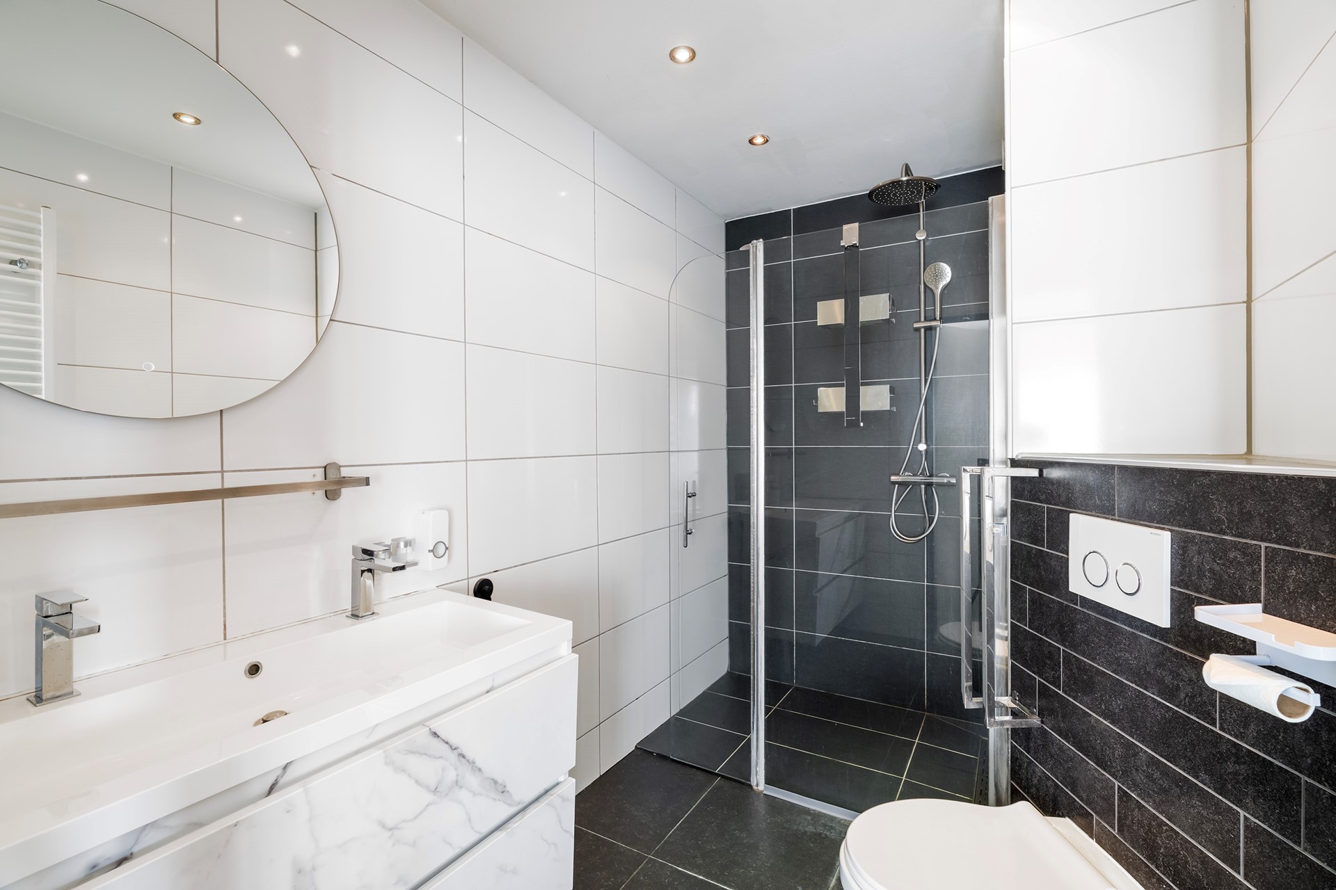 Via de centrale hal met meterkast is de open keuken bereikbaar. Deze is modern ingericht en voorzien van diverse inbouwapparatuur, waaronder een inductiekookplaat, afzuigkap, koelkast, vriezer en combimagnetron. Aangrenzend bevindt zich een praktische inloopberging met aansluiting voor de wasmachine. Vanuit de keuken is er directe toegang tot het balkon aan de achterzijde.