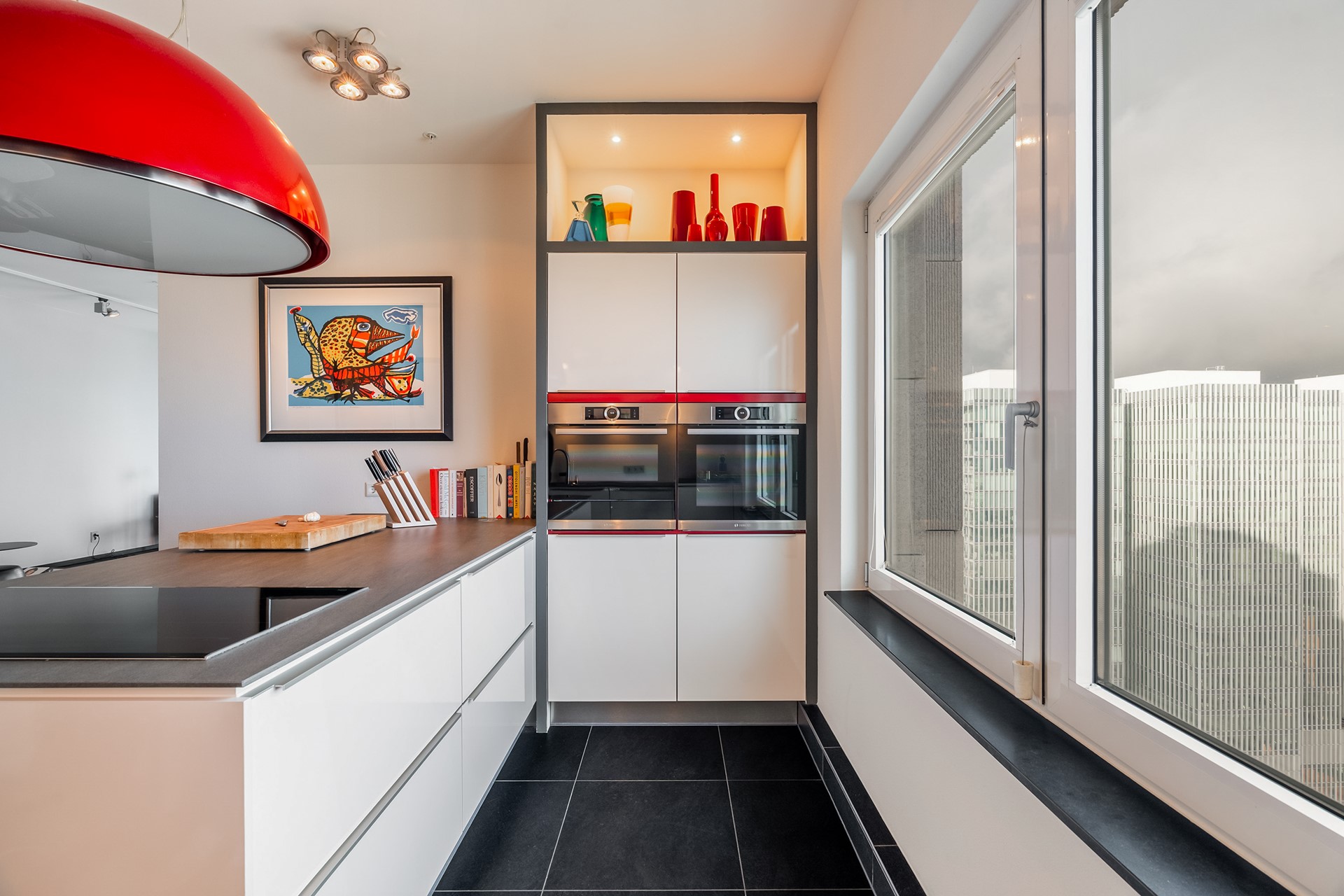 De gehele woning onderscheidt zich door een hoogwaardige afwerking, zoals grote ramen rondom die doorlopen tot vloerhoogte en speciaal ontworpen kasten.