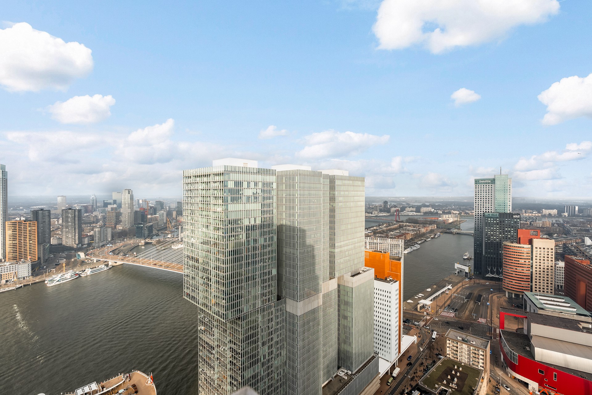 Dit hoogwaardige penthouse van circa 144 m² bevindt zich in de kroon van de iconische woontoren “New Orleans”, op de 40e verdieping, 150 meter boven de stad. De locatie ligt direct aan de Maas en biedt een vrij uitzicht rondom over Rotterdam en omgeving.